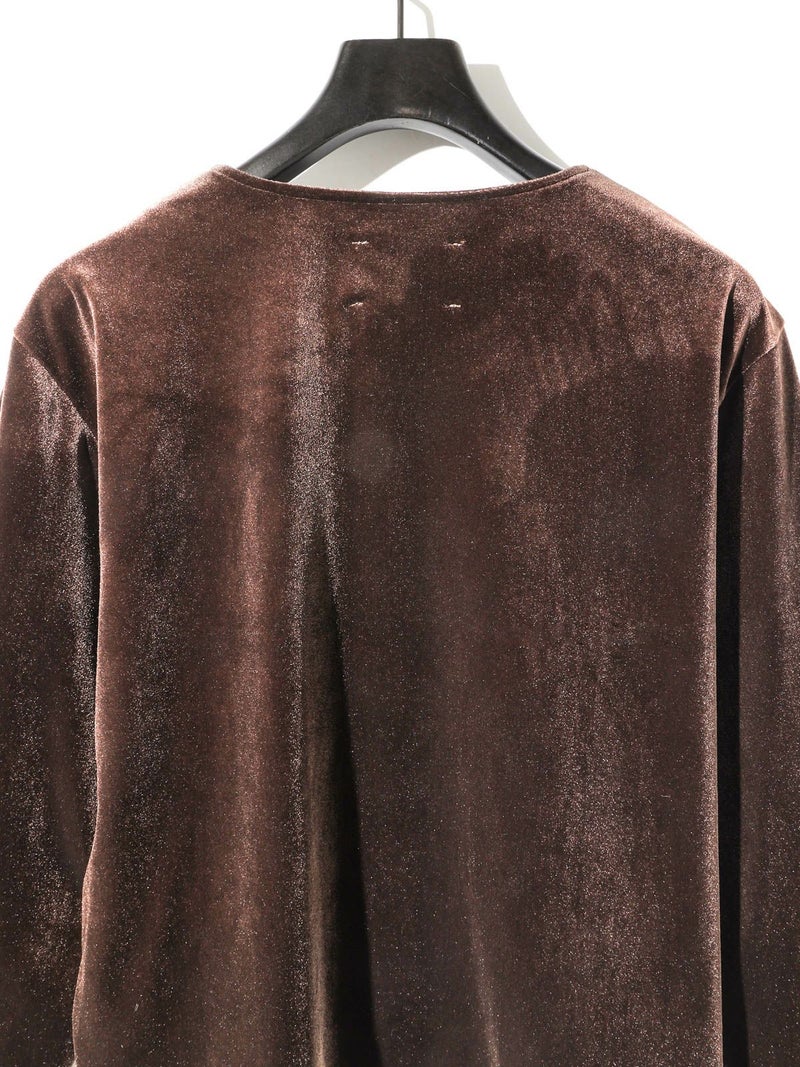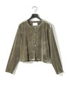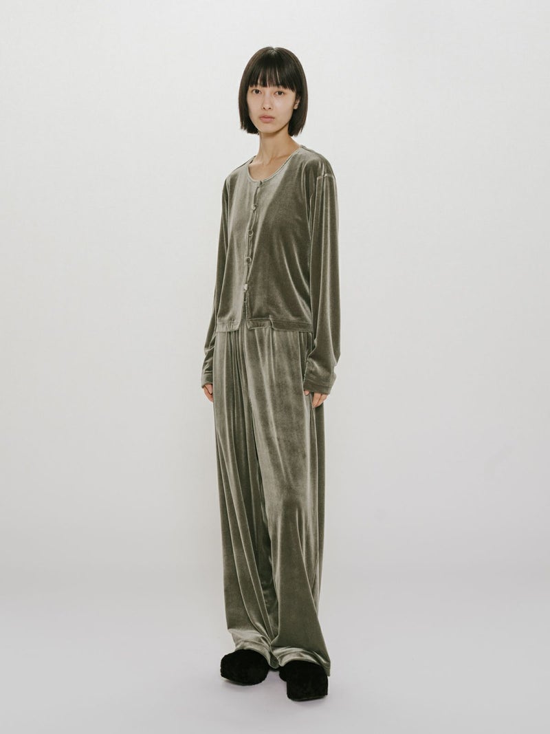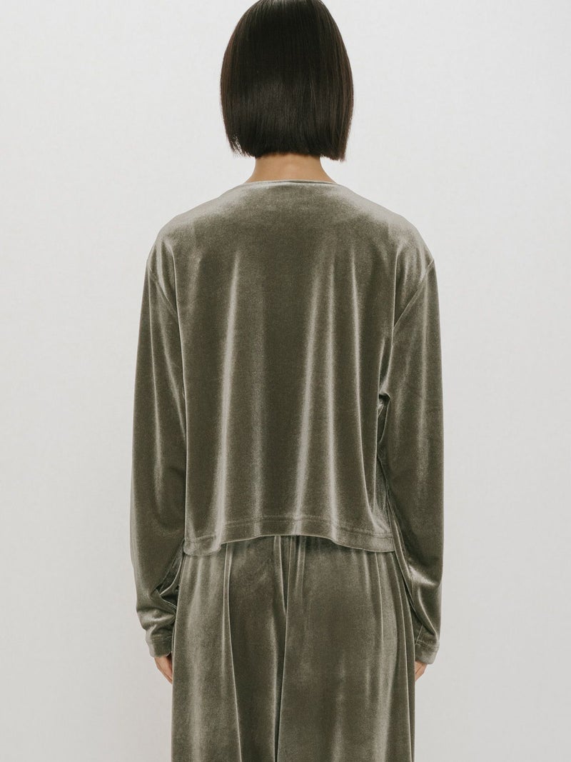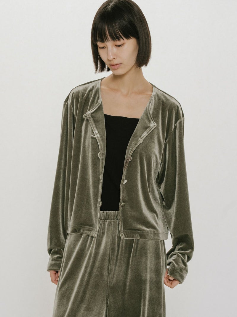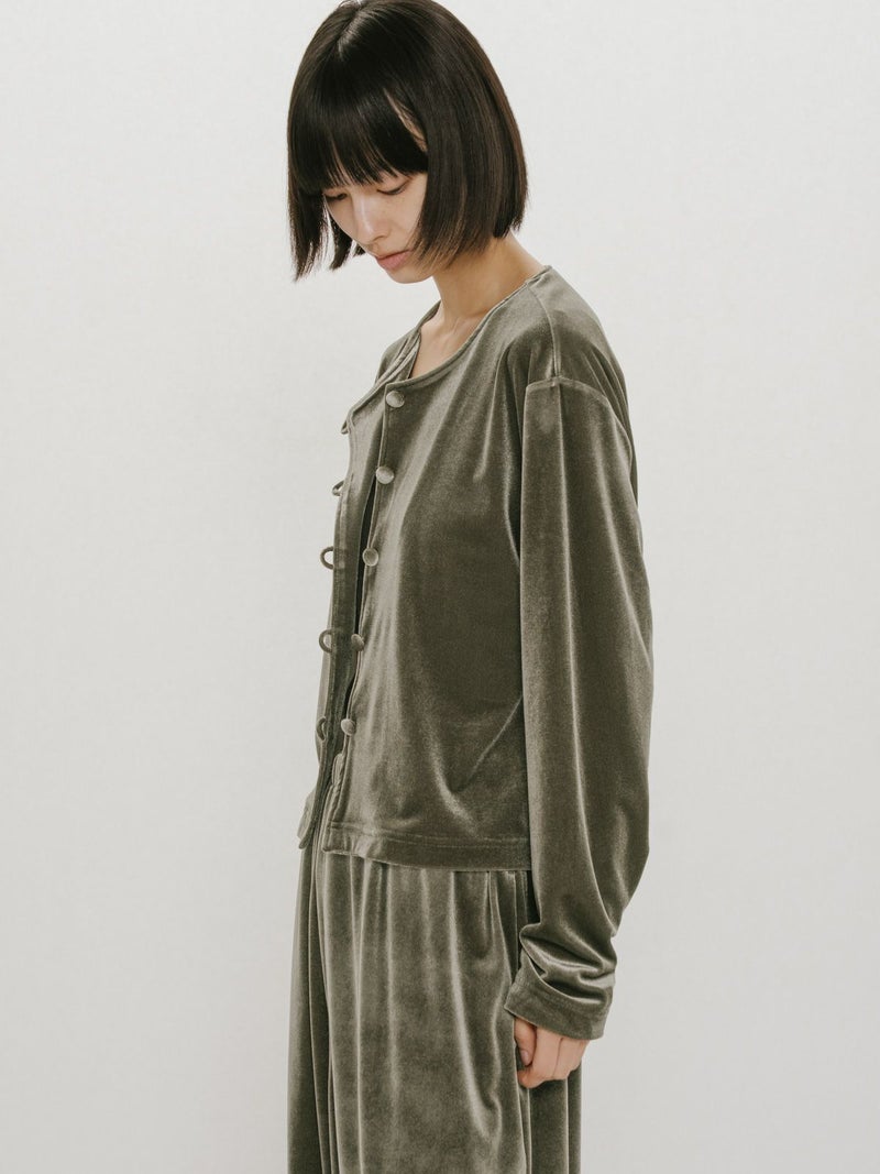 煌びやかな光沢が美しいベロア素材を使用したクルーネックカーディガン。丸いループ留めボタンがさりげないポイントに。すっきりとしたショート丈と、ジャストすぎないほどよいワイドシルエットで、どんなボトムともバランスよく合わせられます。もっちりとした伸縮性のある素材で着心地も抜群。一枚で華やかに決まり、ニットやシャツを合わせるだけでシーズンムード漂う大人のスタイリングが完成します。