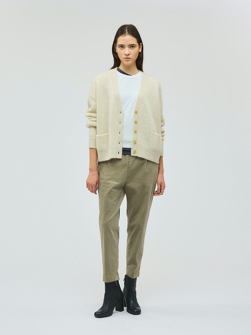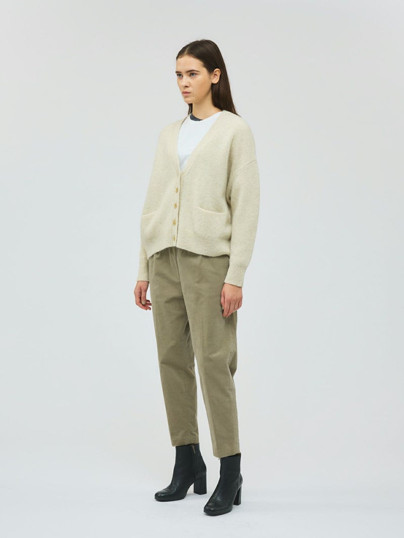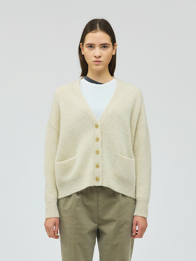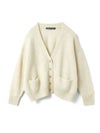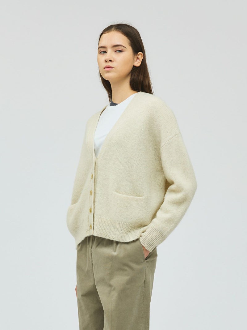 シェットランドウールのようなふっくらとした生地感が特徴のMG/Vネックワイドカーディガンです。ウール100%の素材で大変暖かくウォーム感があり寒い時期にお勧めの羽織りアイテムです。色鮮やかなブルーを差し色にベーシックカラーで展開。Vネックにフロントボタン仕様のシンプルなデザインが魅力です。ポケット付き。インナーも着こむことができ、アウターも着用しやすいサイズ感です。ベーシックアイテムなので長く愛用していただける1枚です。