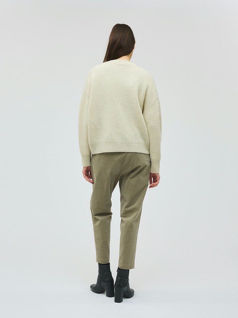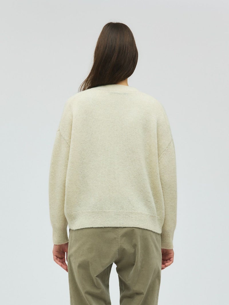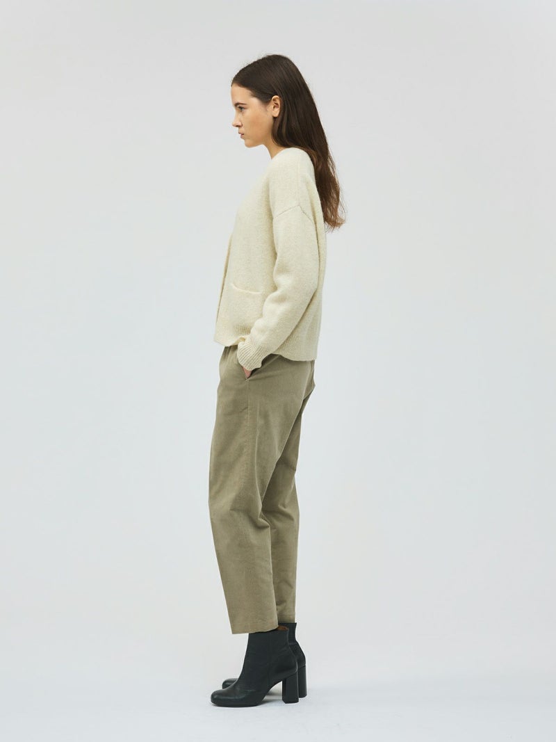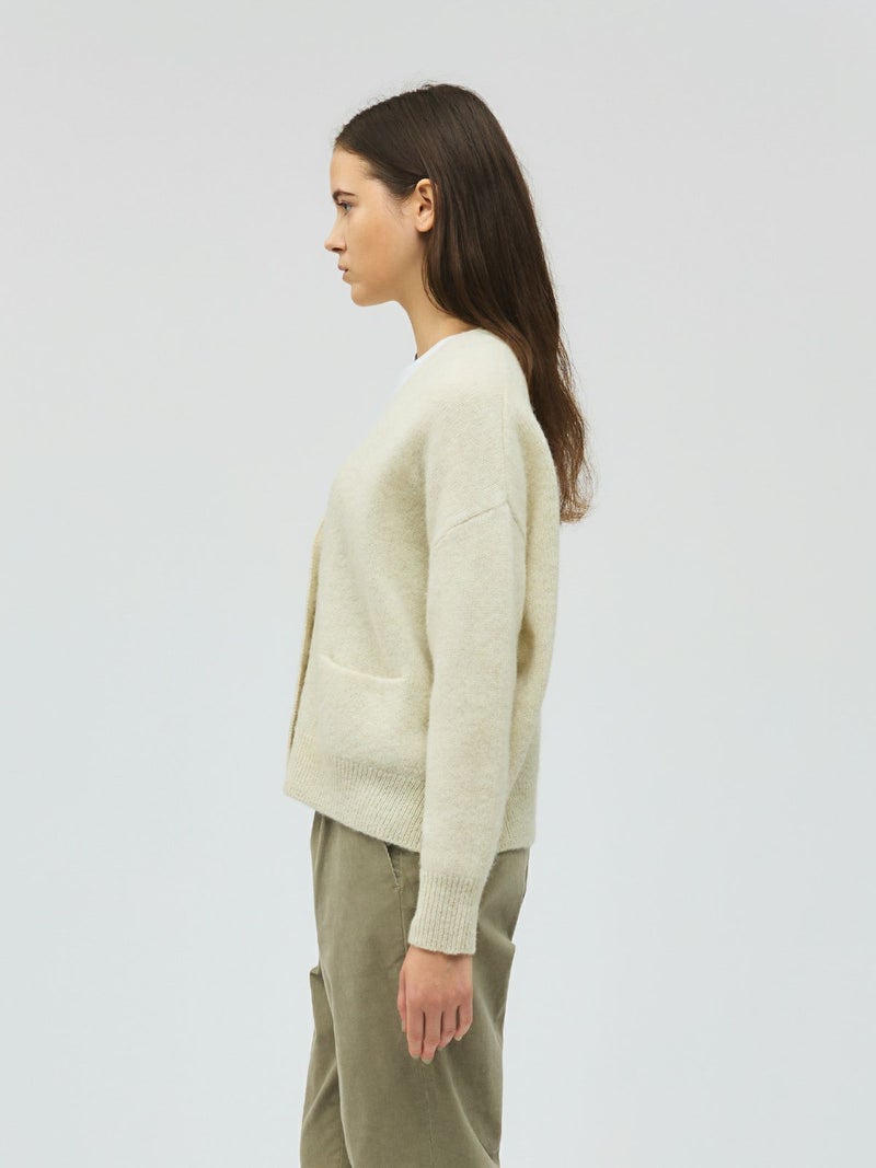 シェットランドウールのようなふっくらとした生地感が特徴のMG/Vネックワイドカーディガンです。ウール100%の素材で大変暖かくウォーム感があり寒い時期にお勧めの羽織りアイテムです。色鮮やかなブルーを差し色にベーシックカラーで展開。Vネックにフロントボタン仕様のシンプルなデザインが魅力です。ポケット付き。インナーも着こむことができ、アウターも着用しやすいサイズ感です。ベーシックアイテムなので長く愛用していただける1枚です。