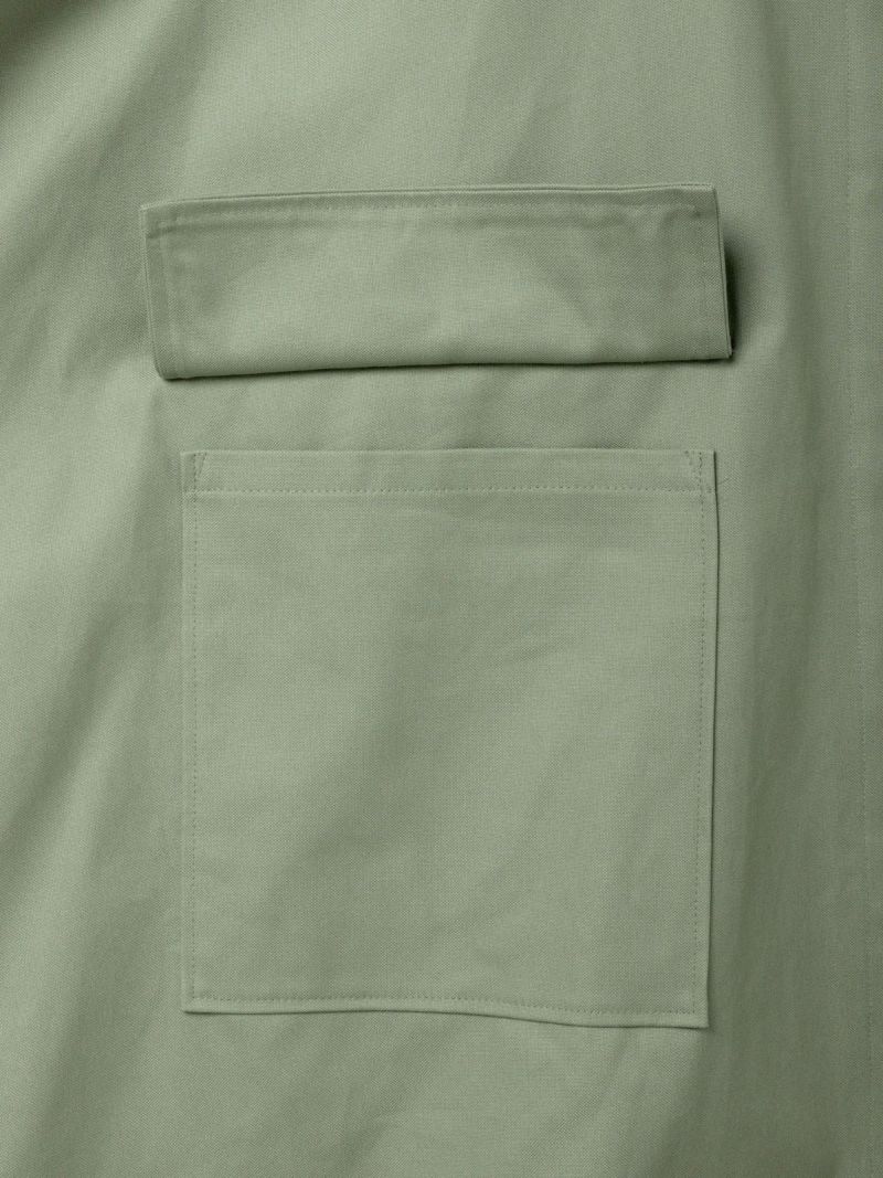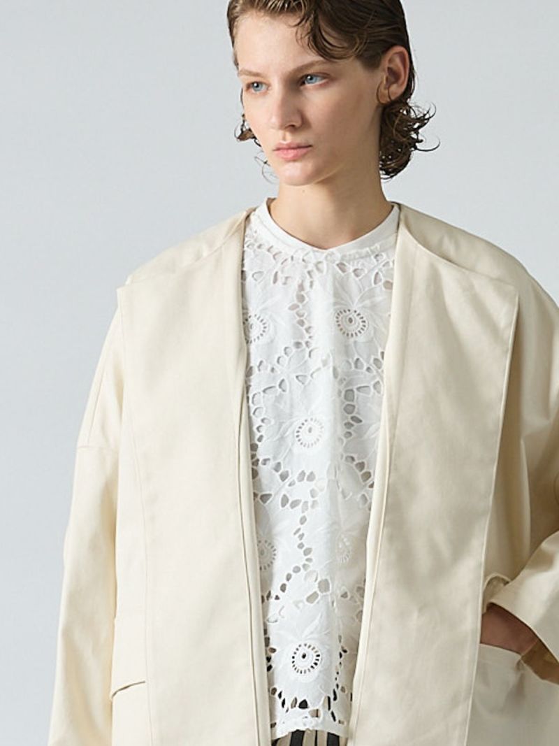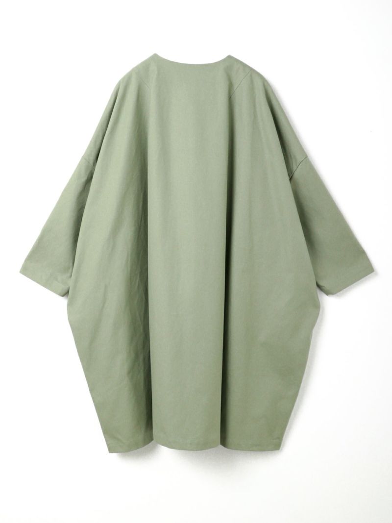 ジャーマンダック、ドイツ軍のミリタリー素材を再現、コットン素材を使用したクルーネックワイドコートです。張り感がありながらしなやかな風合いが特徴。身頃にたっぷりとしたゆとりを感じられるサイズ感に仕上がっています。フロントはオープンなデザインになっており開放感のある自然な着こなしを表現。大きな蓋付きのポケットがアクセントになっています。季節の変わり目に重宝する1枚です。