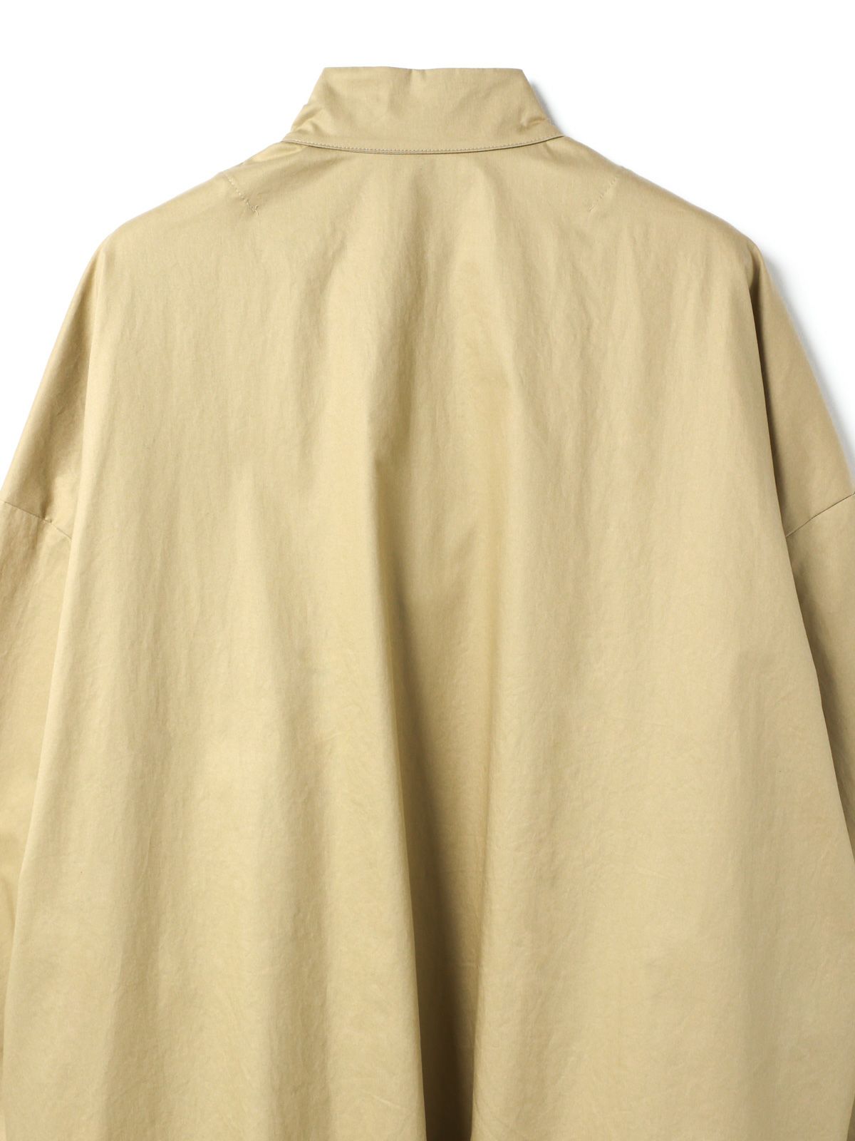 40ツイルを使用した薄手でハリのあるスタンドカラーワイドジャケットです。毛羽のないワッシャーと光沢感が特徴。スタンドカラーのシャープな雰囲気が魅力的でカチッとした雰囲気もありながらキレイな着こなしもカジュアルにも演出できます。フロントボタンの数も最小限なのでスッキリとしたデザインです。季節の変わり目のアウターとして大変お勧めの1枚。。