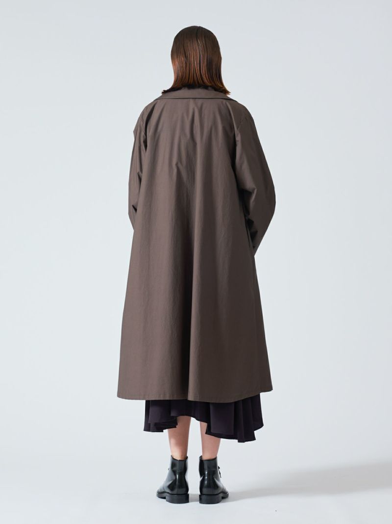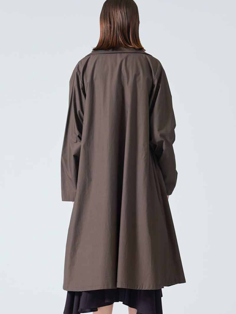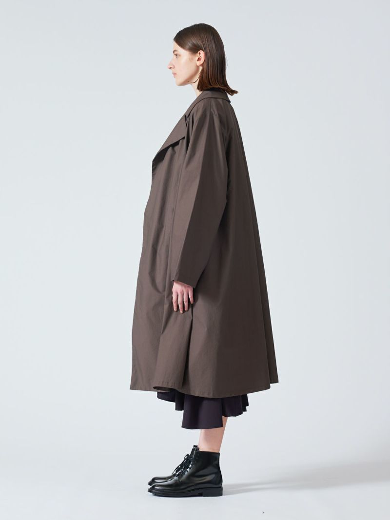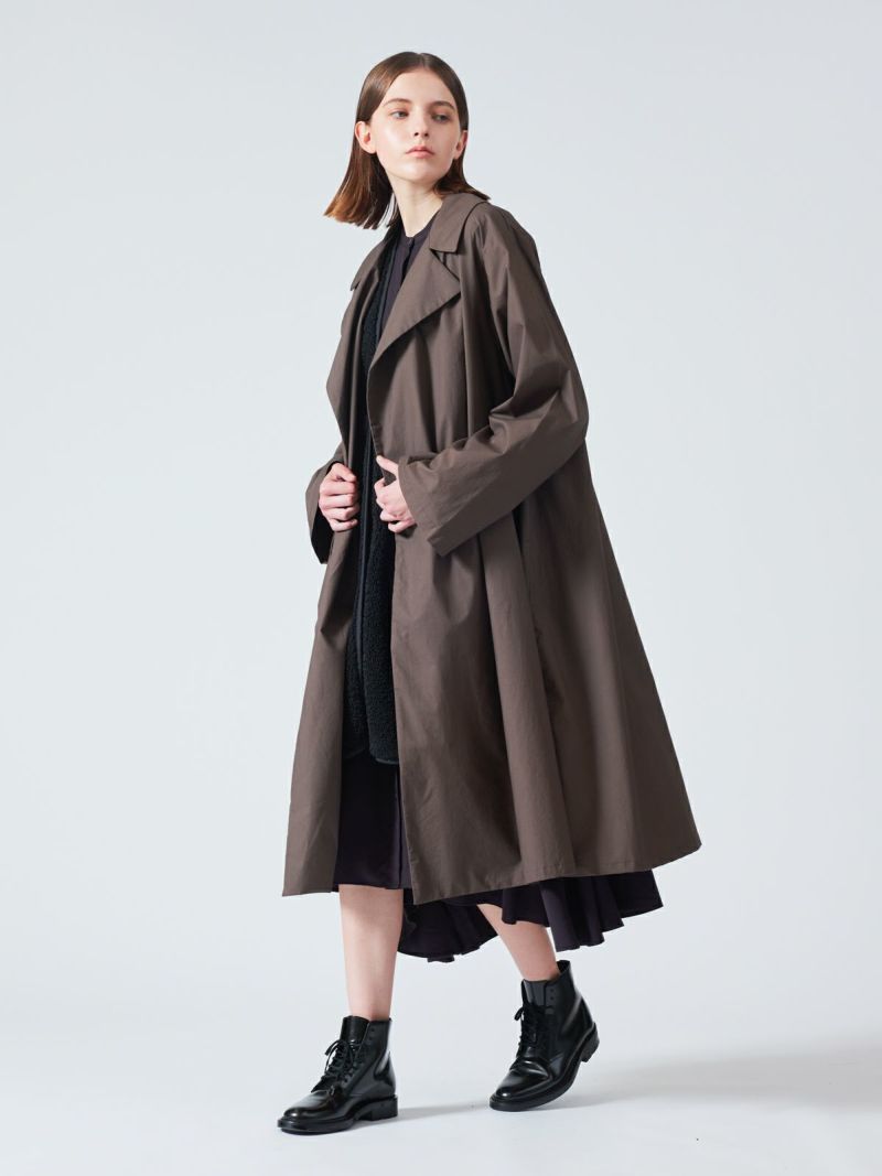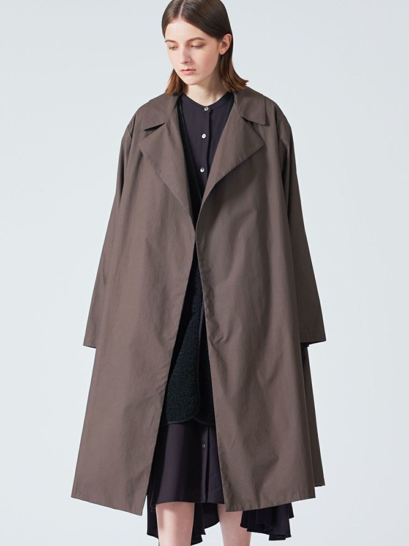 40タイプライターのナチュラルな素材とワッシャー加工を施したトレンチライクコートです。季節の変わり目におすすめのアウターです。前留めは無くサラッとかっこよく羽織っていただける1枚。手洗いも可能。一重仕立てでハリのある薄手な生地感が特徴。カジュアルに袖をロールアップしても素敵です。裾広がりのシルエット表現した女性らしく上品さを印象付けるコートです。