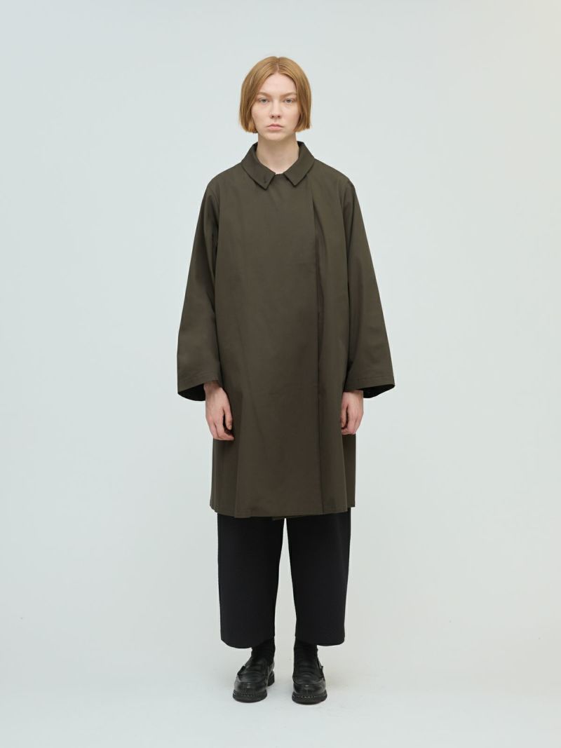 ハリとコシのある生地で作られたトレンチライクコートです。トレンチコート一枚仕立てなので軽やかなデザイン仕上げ。ミニマルでミリタリーライクな雰囲気もあり、すでに在るようで無いコートを表現しています。襟元はボタン留めで立てて着用可能。4色のカラー展開はベーシックで揃え、極限までシンプルに、トレンチコートをベースに長く愛用していただけるよう拘りを持ってデザインしました。季節の変わり目、気温の変化にすぐに対応できるmizuiro ind人気のアウターとして今季お勧めの1枚となっています。