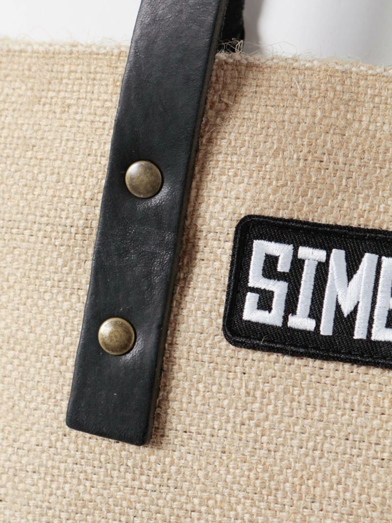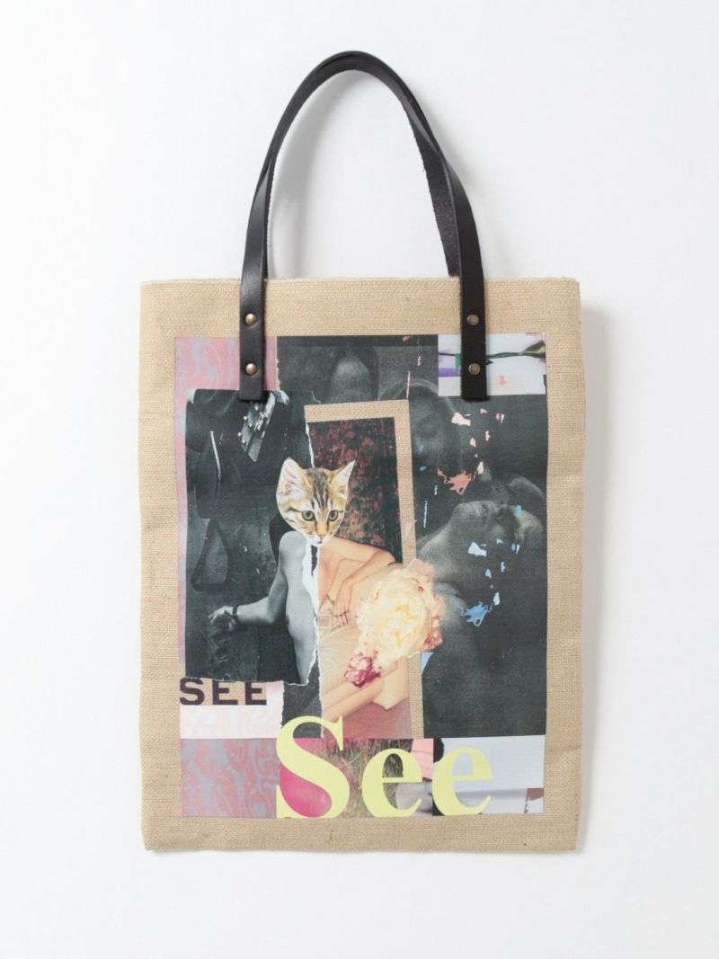 ナチュラルジュートの上に遊び心のあるコラージュプリントやペイントが施され、異素材のコンビネーションがアーティスティックなデザインのバッグ。ロンドンのファインアートを感じさせるデザインはナチュラルな風合いでも目を惹くアイテムです。持ち手は黒のレザーでカッコ良さをプラス、肩掛けとしてもお使いいただけます。