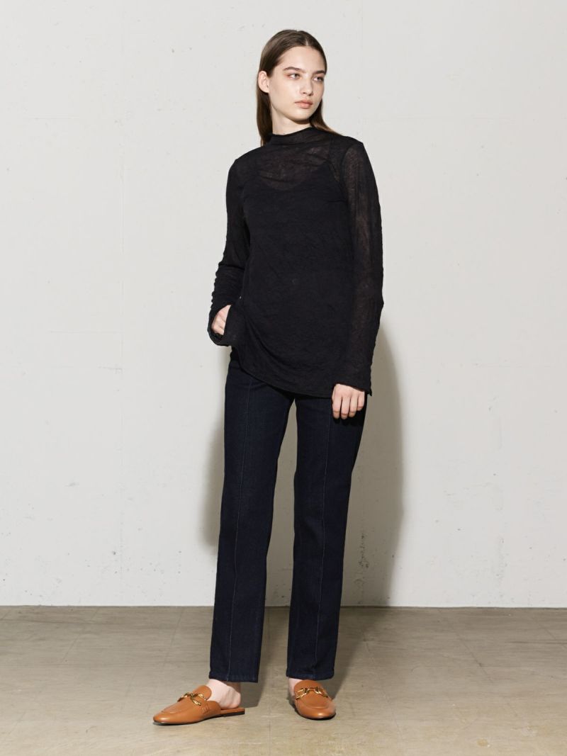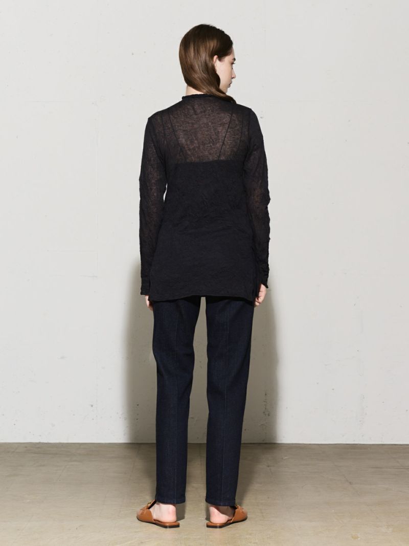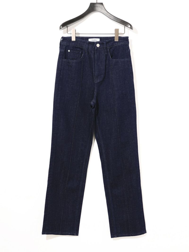 MIDIUMISOLIDとしてセンタープレスデザインをプラス。カジュアルなイメージのデニムを品のあるスタイルに落とし込んだデニムパンツです。ハイライズでベーシックなストレートシルエット。ほどよい肉厚な生地感とストレッチですっきりときれいなシルエットで着用いただけます。