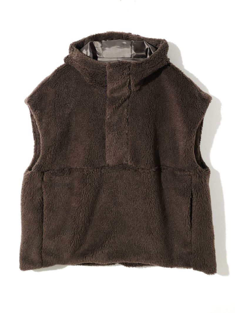 秋の立ち上がりにデザインした3-172052(フード付きベスト)を冬の生地にデザイン変更したボアベストです。モコモコとした温か味のあるボア生地が印象的。ゆとりのあるサイズ感なのでシャツやワンピースも重ねやすさを感じていただけます。落ち着きのある色合いなのでカジュアル感を控えたコーディネートを演出します。首元のボタンは広く開き、アームも広めなのでレイヤードしやすいのもポイント。両サイドから手がすっぽりと入ります。冬のレイヤードを楽しんでいただける暖かなベストアイテムです。