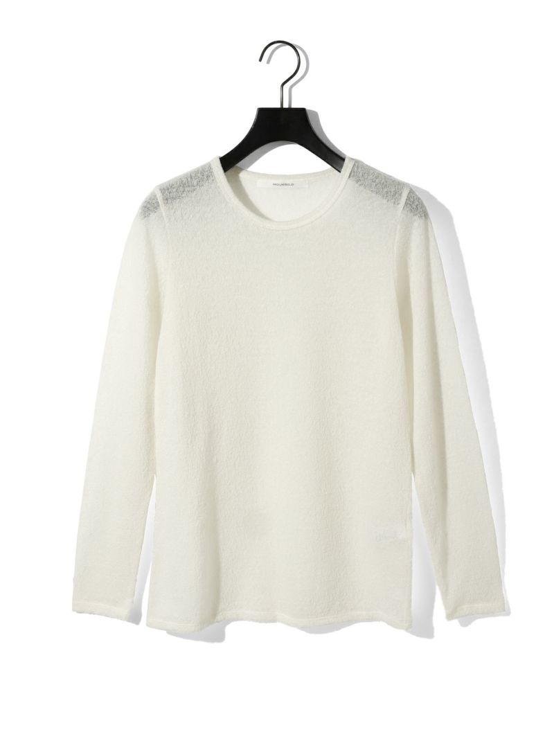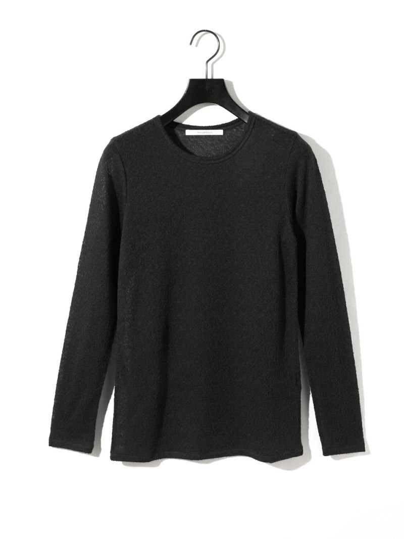 メリノウール混素材を使用したウールシアープルオーバーです。チクチクしないインナーとして着用していただけるカットソーです。クルーネックのシンプルなシルエットが特徴。ジャカード生地で雰囲気がありすっきりとした着こなしを演出します。透け感がありますが温かみがあるので寒い時期でも人気のシアーを取り入れやすい1枚です。