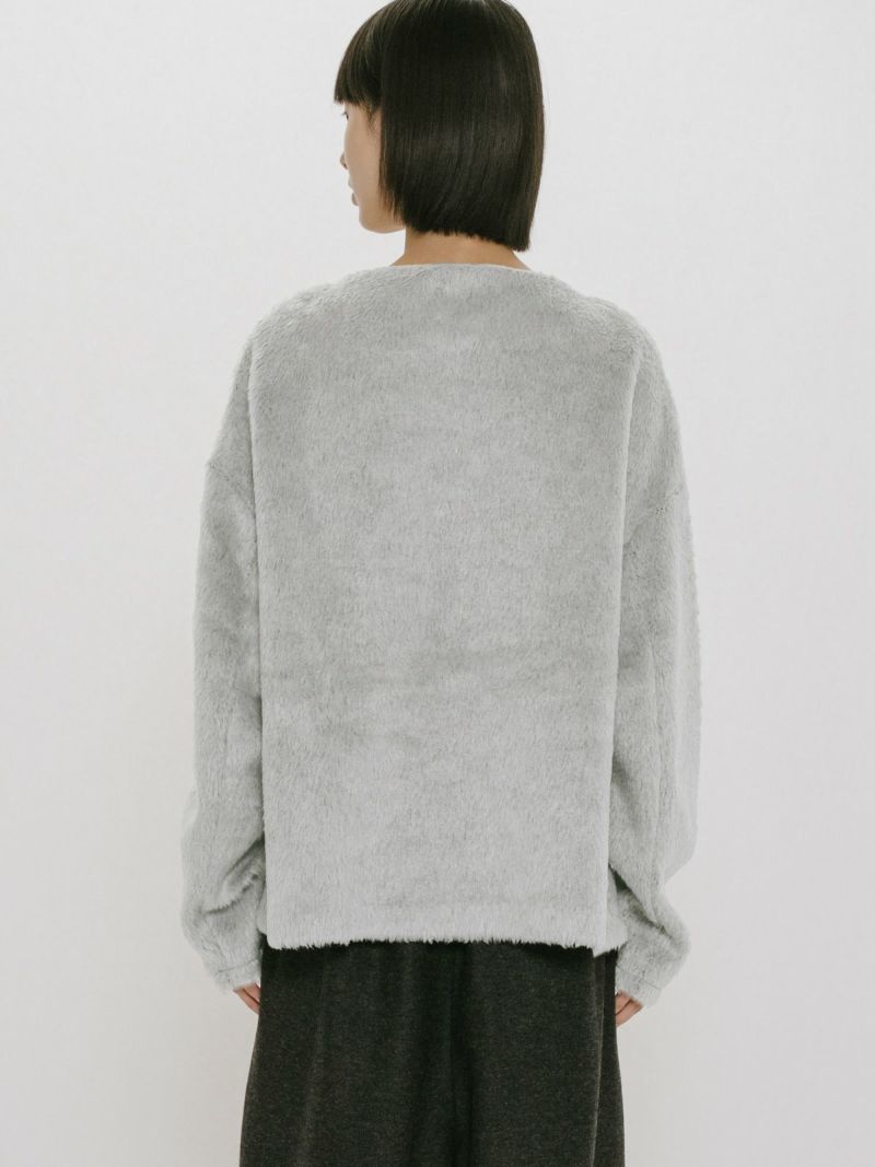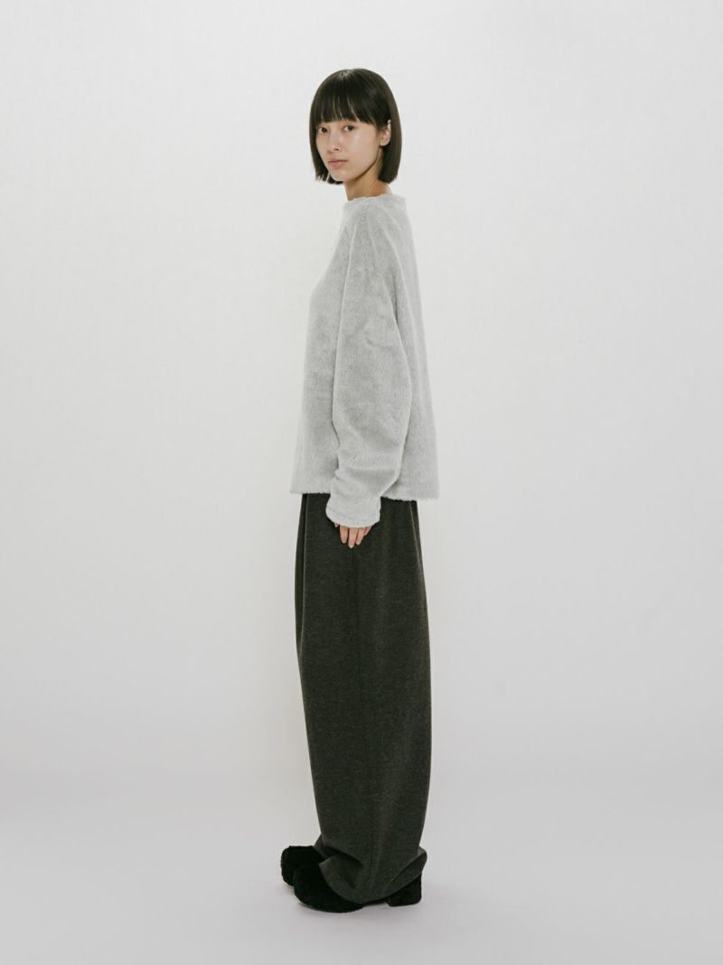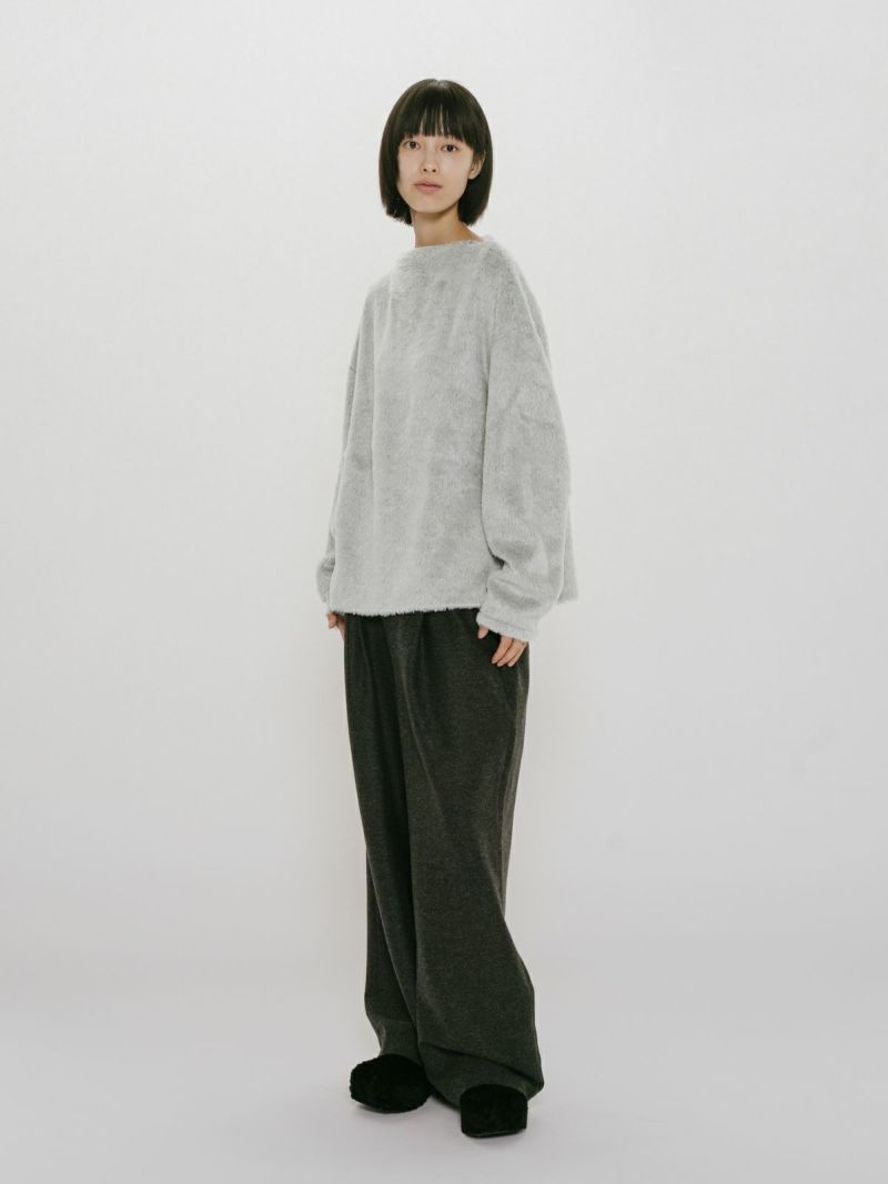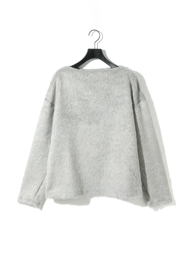 ヒップの2/3ほどを覆う丈感で、ゆったりとリラックスできる着用感。軽さのあるふんわりとしたシャギー素材が心地よく、保温性を感じられる1枚です。