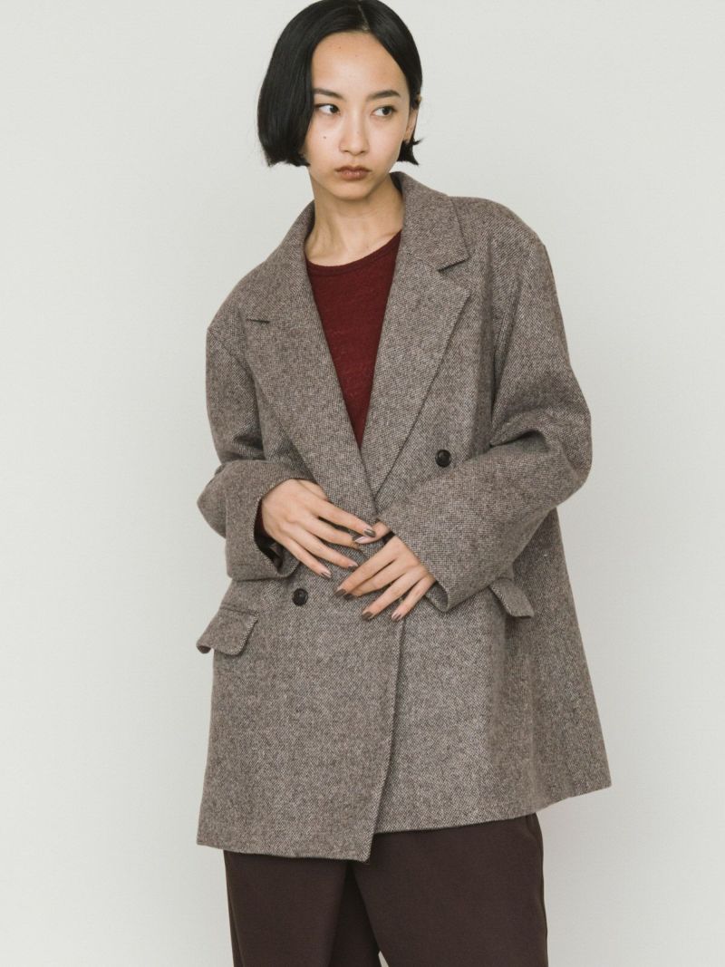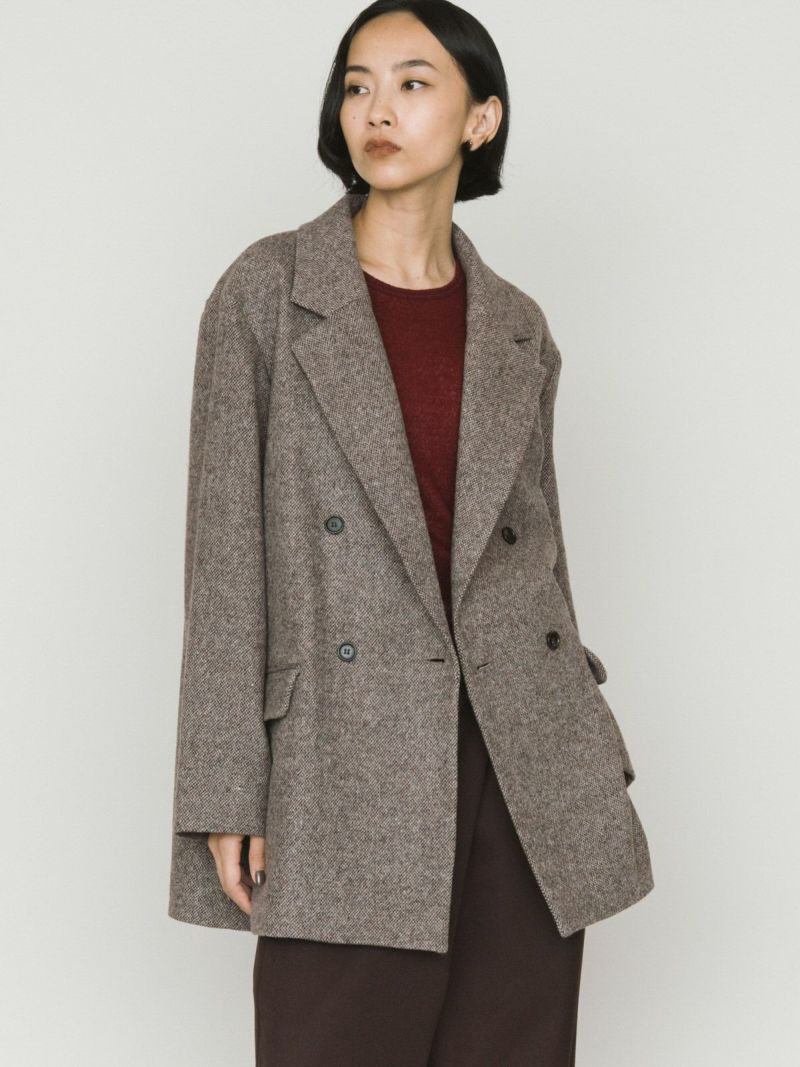 コートライクな温もりのあるダブルブレストツイードジャケット。ザックリと羽織っていただけるビッグシルエットを表現しました。ラペルを大きくした印象的なデザイン仕上げ。ヒップの隠れる長めの丈です。バックスリットが入っています。フロントボタンは閉めずにラフな着こなしもOK。きちんと感もありながらかっこよさも演出できるジャケットです。