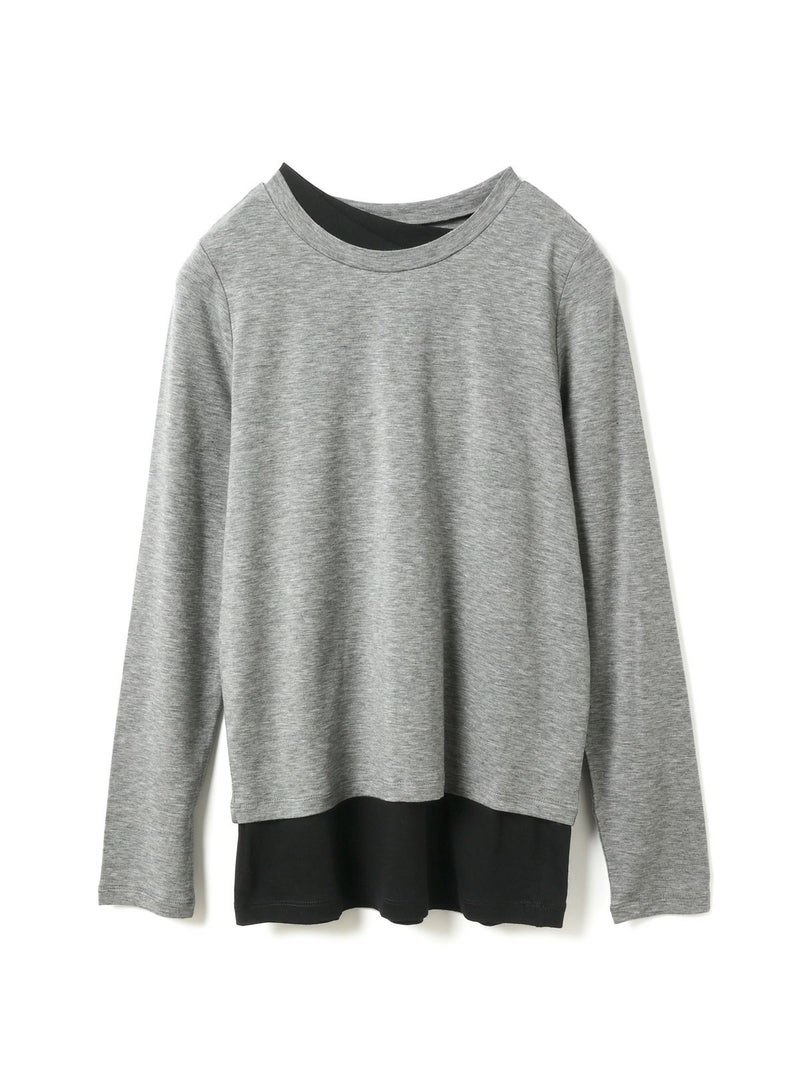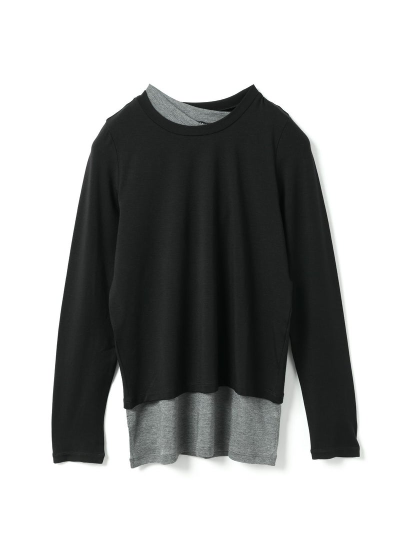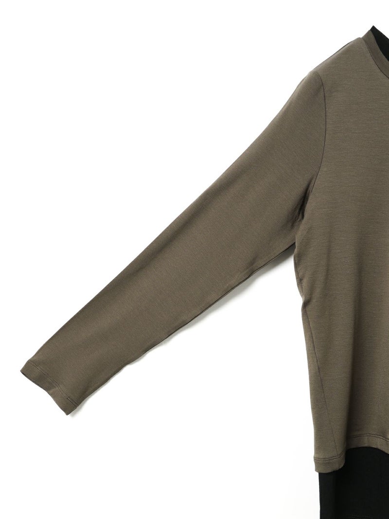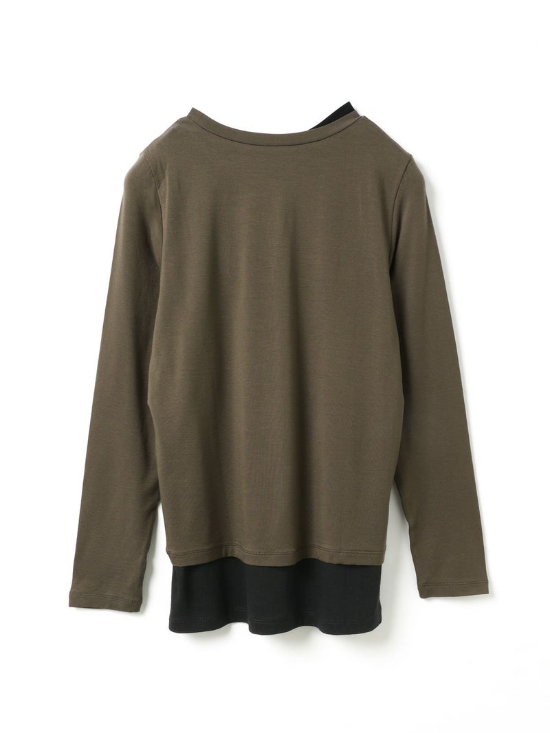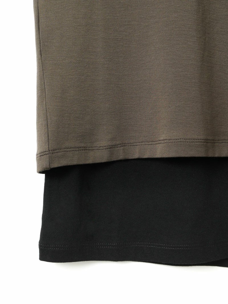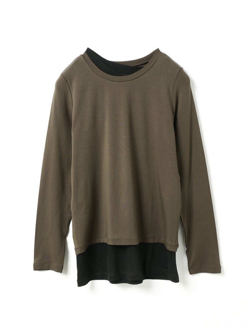 身頃が二重になっており、裾と襟からインナーがのぞいているようなレイヤード風のデザインが特徴のレイヤードTシャツです。細身でシンプルなシルエットを表現したカットソーで、さらっとした生地感がポイント。ストレッチがきいており動きやすいのもポイント。袖は生地の重なりがないのですっきりとしたラインを表現します。1枚で重ね着をしているようなデザインなのでシンプルなアイテムをお探しの方にお勧めです。インナー使いにも重宝します。カラーの組み合わせもシックで落着きのある配色が魅力です。