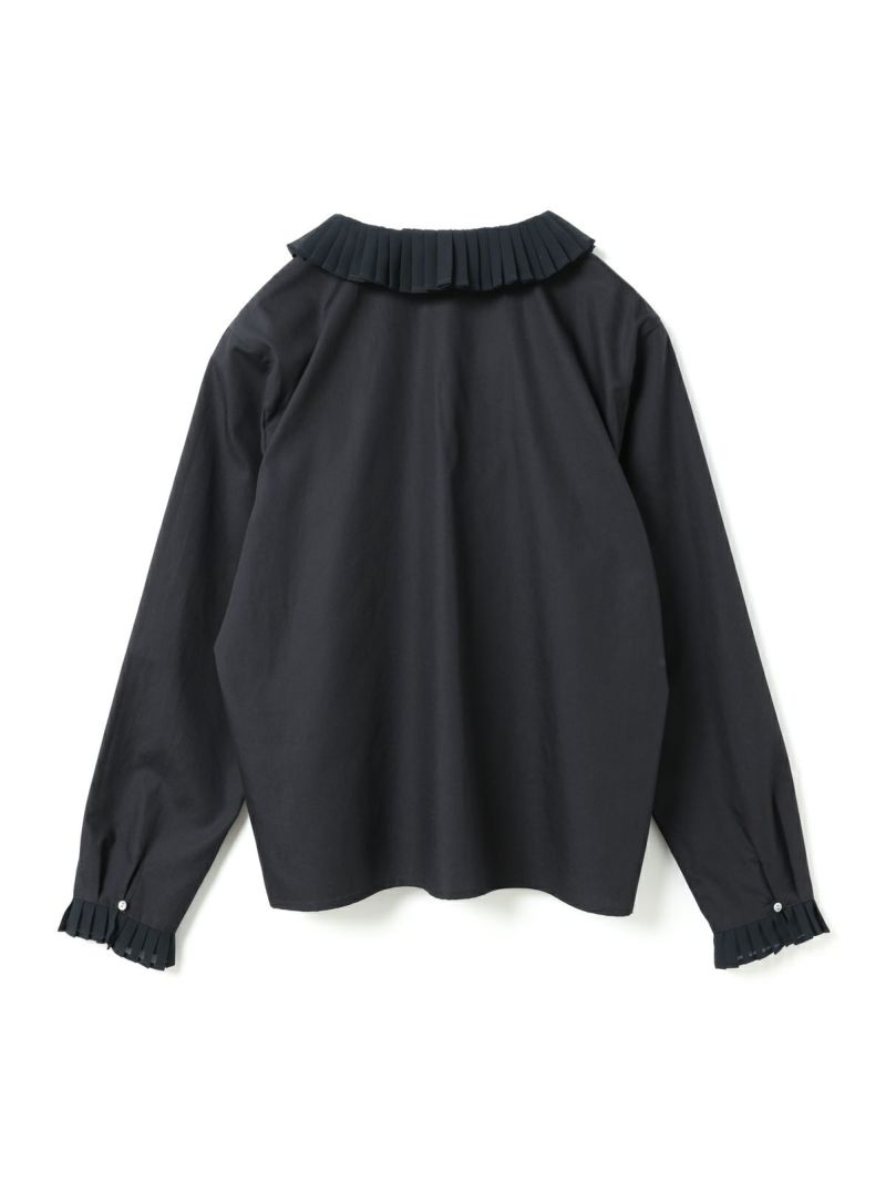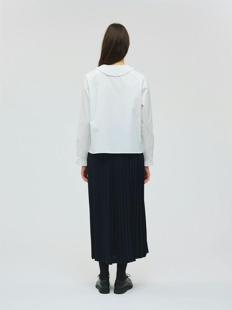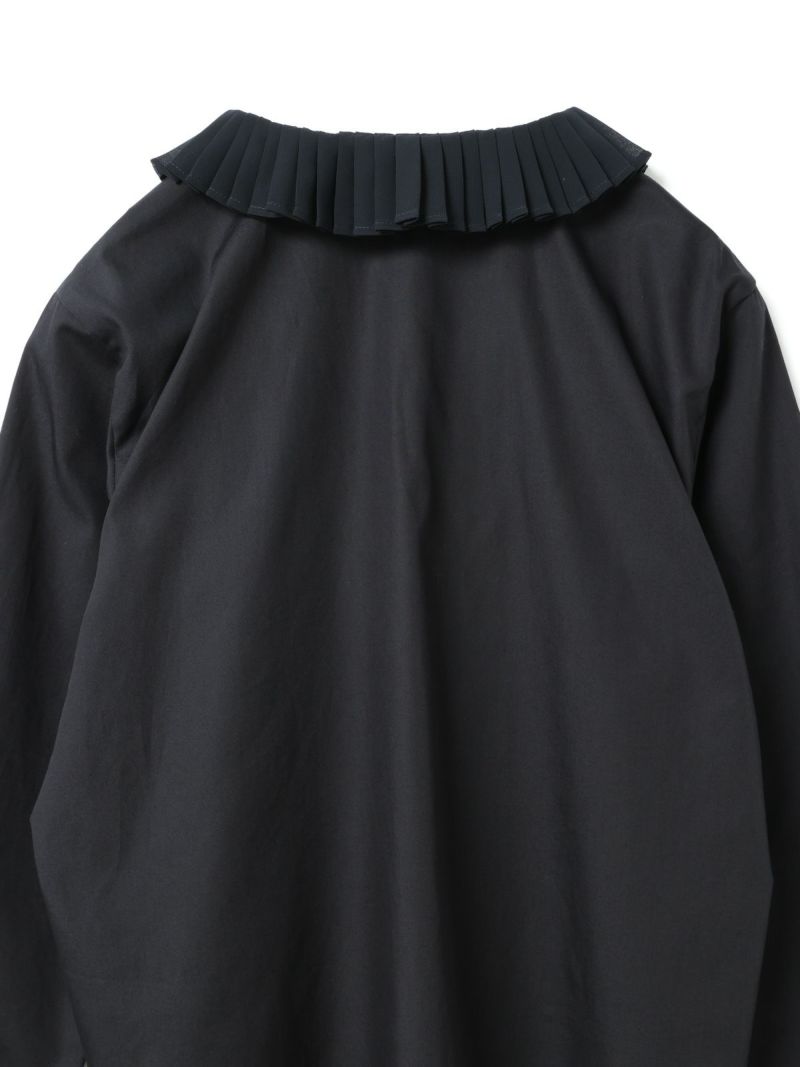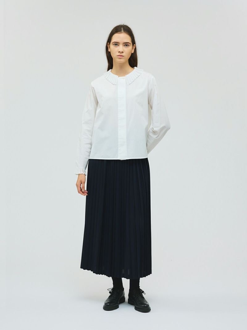 50ブロード生地を使用したプリーツカラーシャツです。以前から人気のあるデザインをシルエットを変え新登場。身頃とは別の生地に変えてデザインした襟と袖にはプリーツをあしらった上品な1枚に仕上げました。比翼仕立てのフロントはすっきりとしたデザインもポイント。襟をだしたり、袖口を見せたりインナー使いとして活躍していただけるシャツです。