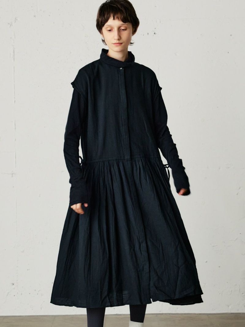 ビンテージライクな風合いが特徴のウエストギャザーワンピースです。コットンウール素材のビエラを使用した4-739391/4-769392と同シリーズで展開。ウエストはドロストをデザインしており、紐を絞ることで着こなしに変化を付けても素敵。生地にウールを含んでいるので冬の寒い時期にも気軽にコーディネートに取り入れやすいワンピースです。ロングベストとして着用していただけるワンピースなので、重ねるアイテムによっては雰囲気が異なり色々なおしゃれを楽しんでいただけます。