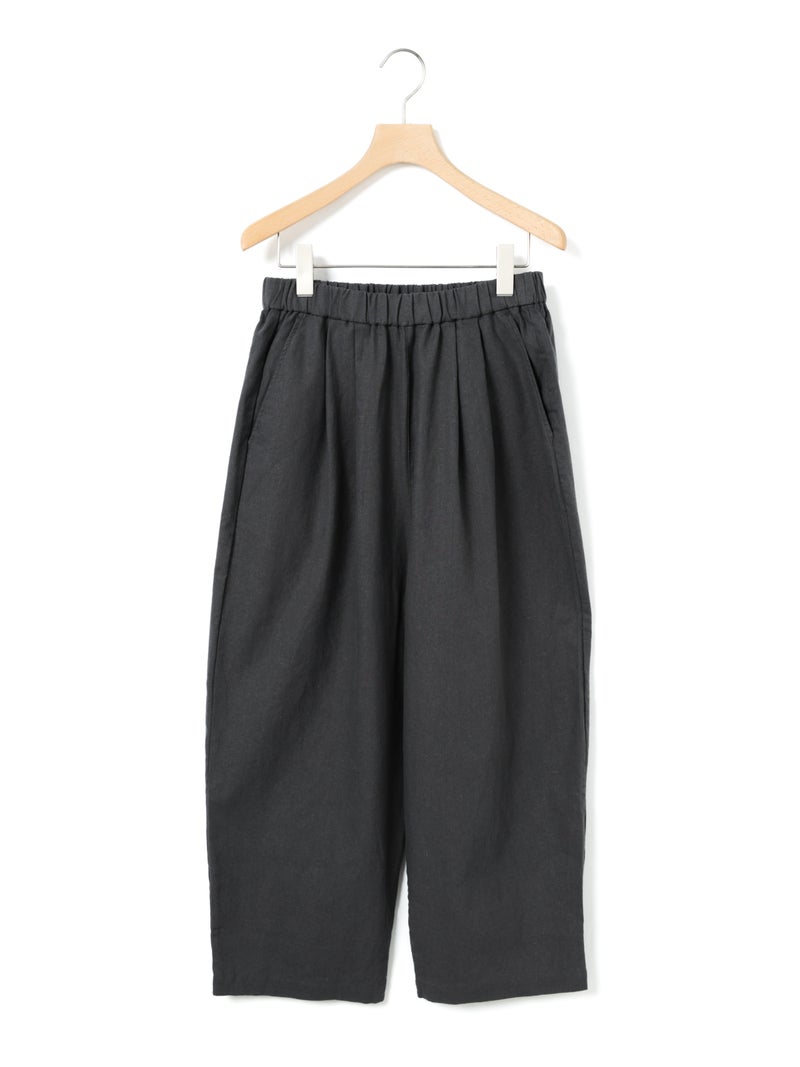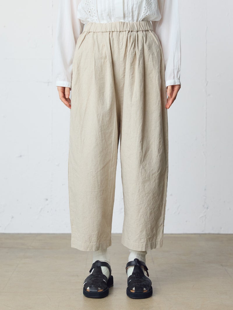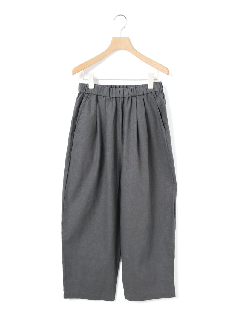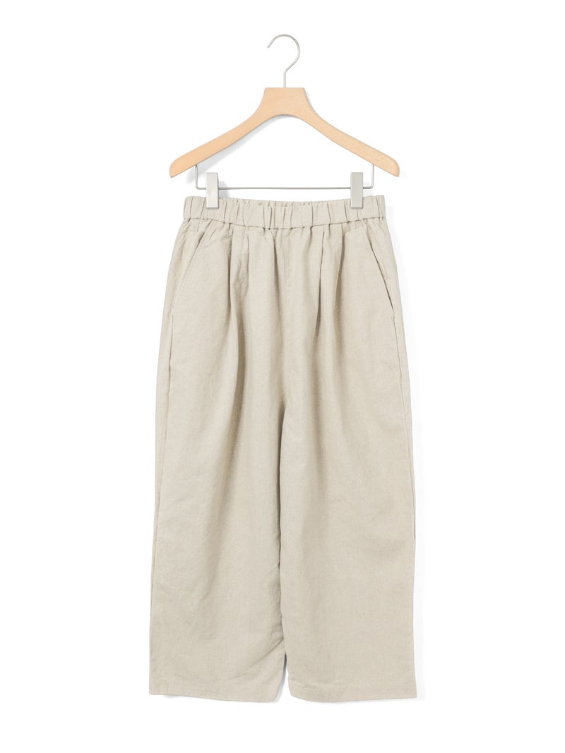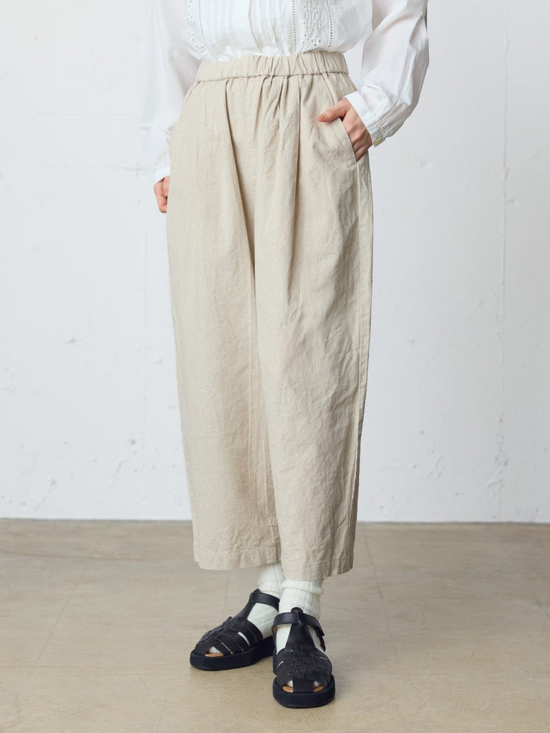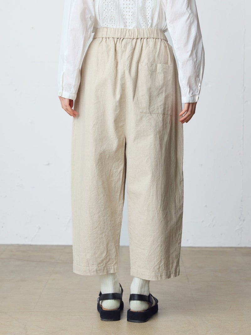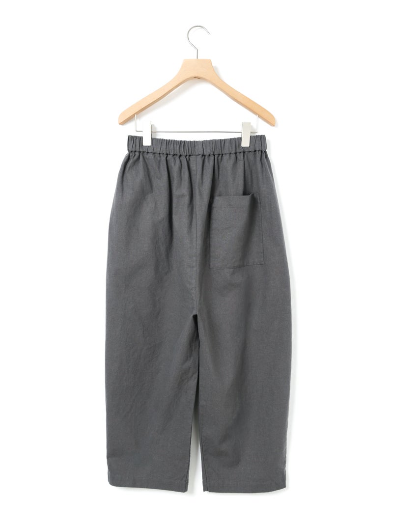コットンリネンのキャンバス地を使用したコットン×リネンワイドイージーパンツです。柔らかく膨らみがあり、透けずらい素材感が特徴。MidiUmiの定番型のデザインで、少し丸みがあり短めのイージーパンツとなっています。そのため小柄な方にも着用しやすいボトムアイテムです。ウエストはリラック感のあるゴム仕様、中に調整紐が付いているのでウエストキープがしやすところもポイント。通気性もよく夏場も快適に着用していただけます。コーディネートしやすい3色展開となっています。