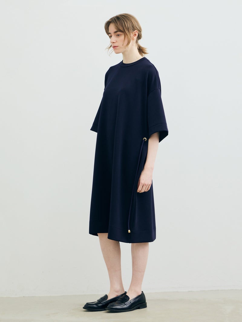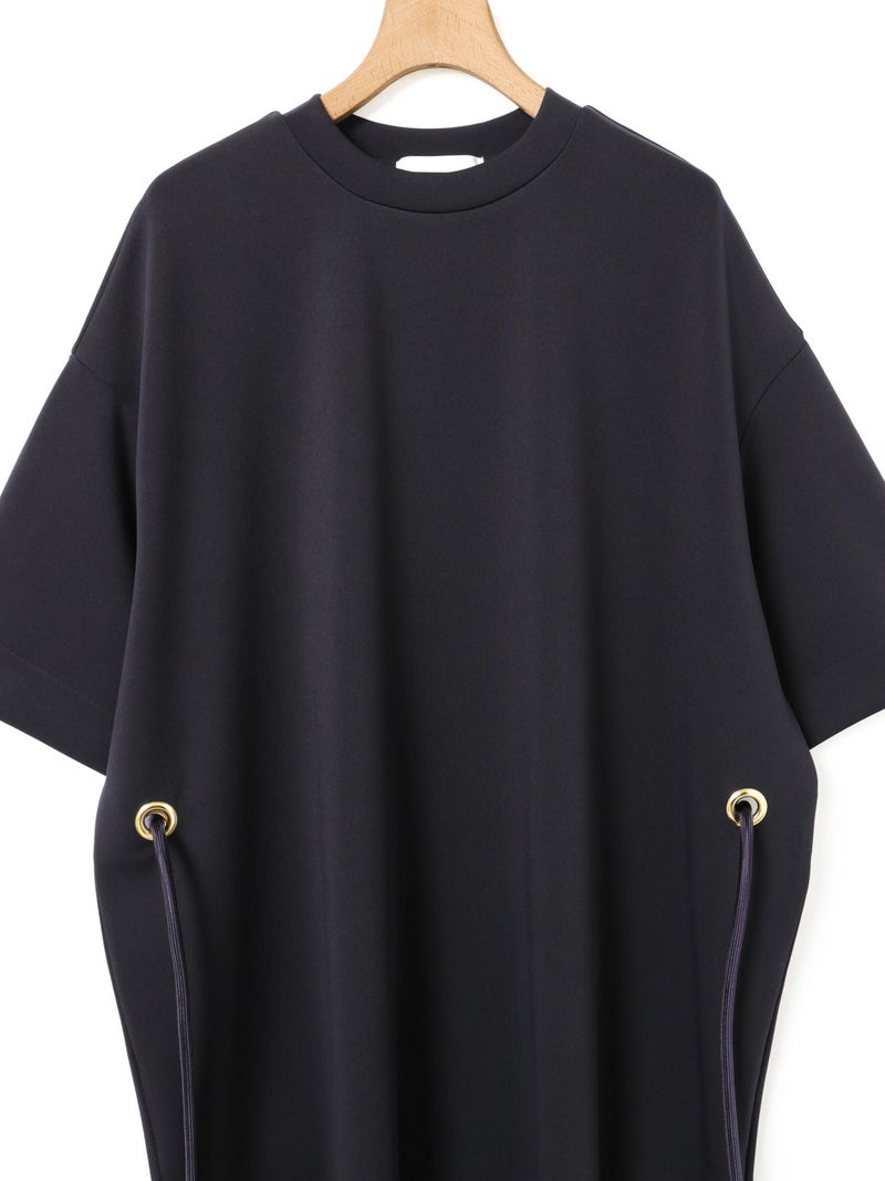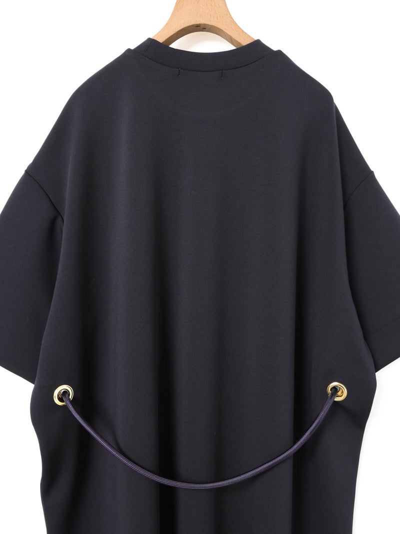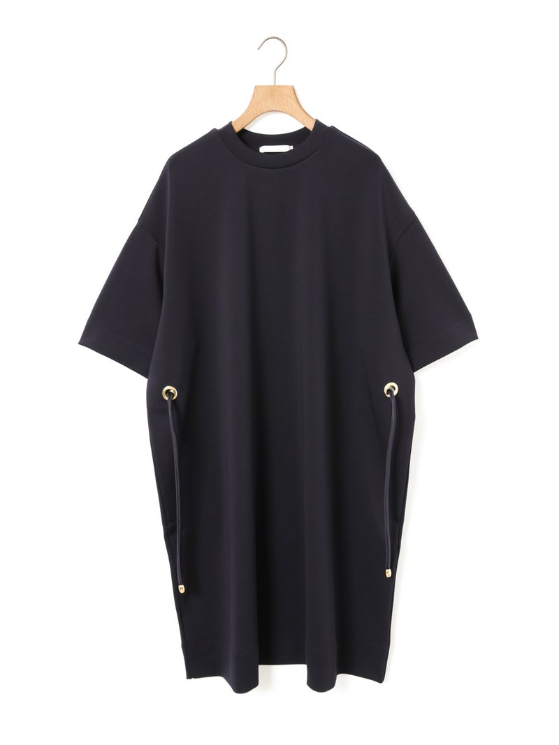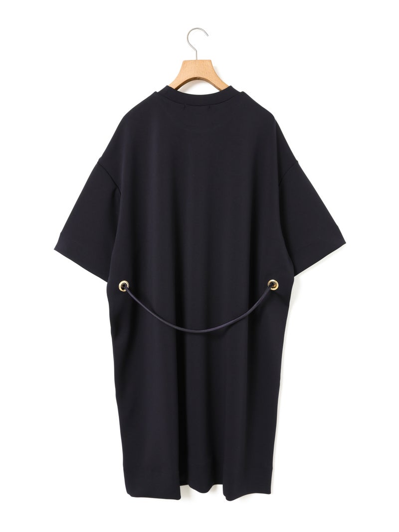 肉感のあるダンボール素材で仕上げたクルーネックドレスです。しなやかでストレッチがきいた動きやすいデザインが特徴的。ハトメとコードが特徴で、後ろで紐を結ぶとよりモード感のあるワンピースに、ウエストでブラウジングするとフォーマルな雰囲気が演出できます。スキニーデニムやぴったり目のパンツと合わせるのがおすすめ。金具がゴールドでアクセントになっています。着こなしによって表情を変化させていただける1枚です。