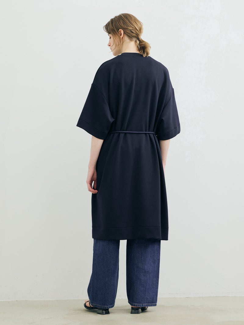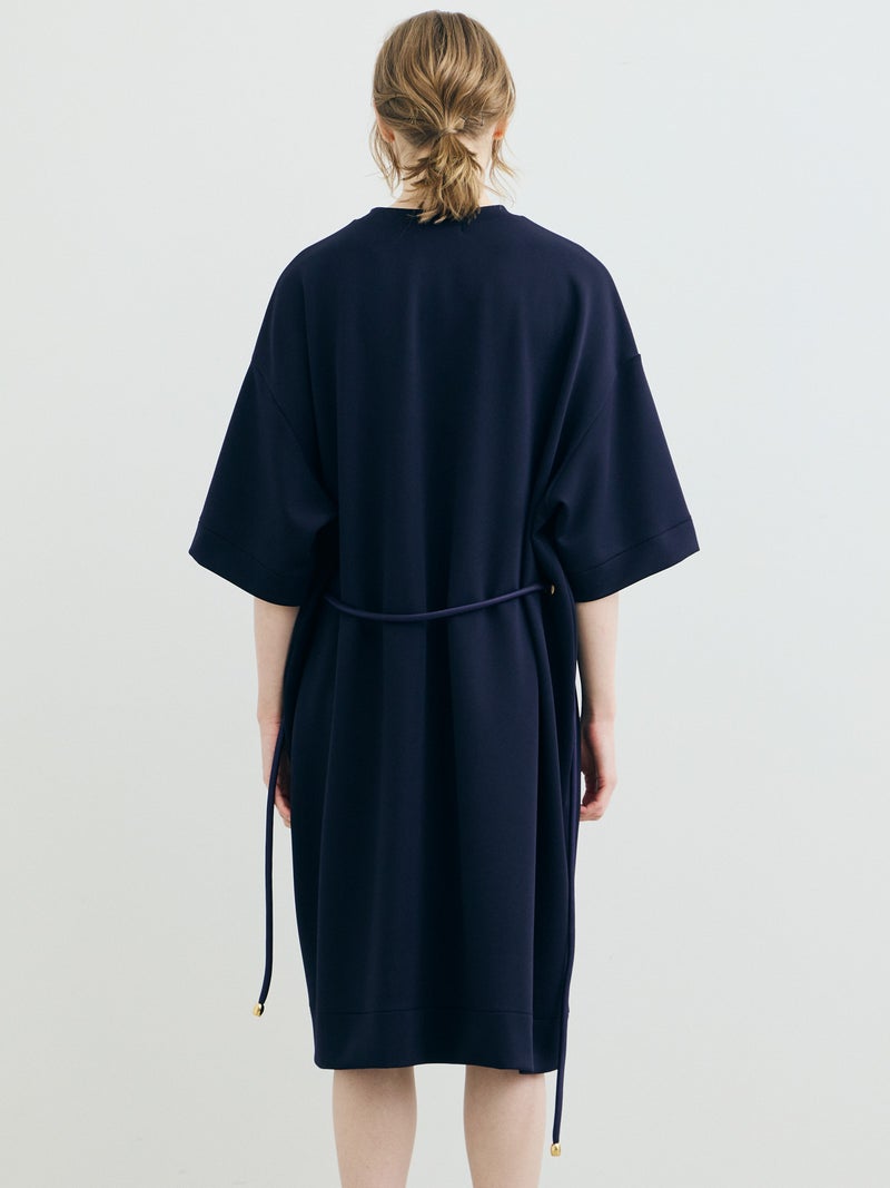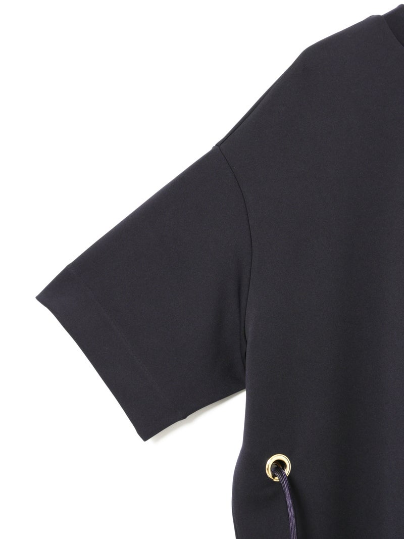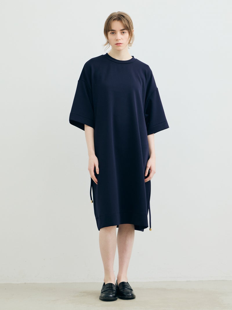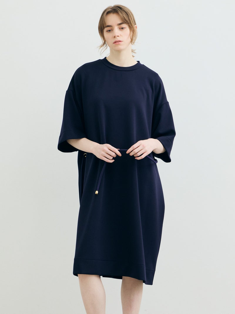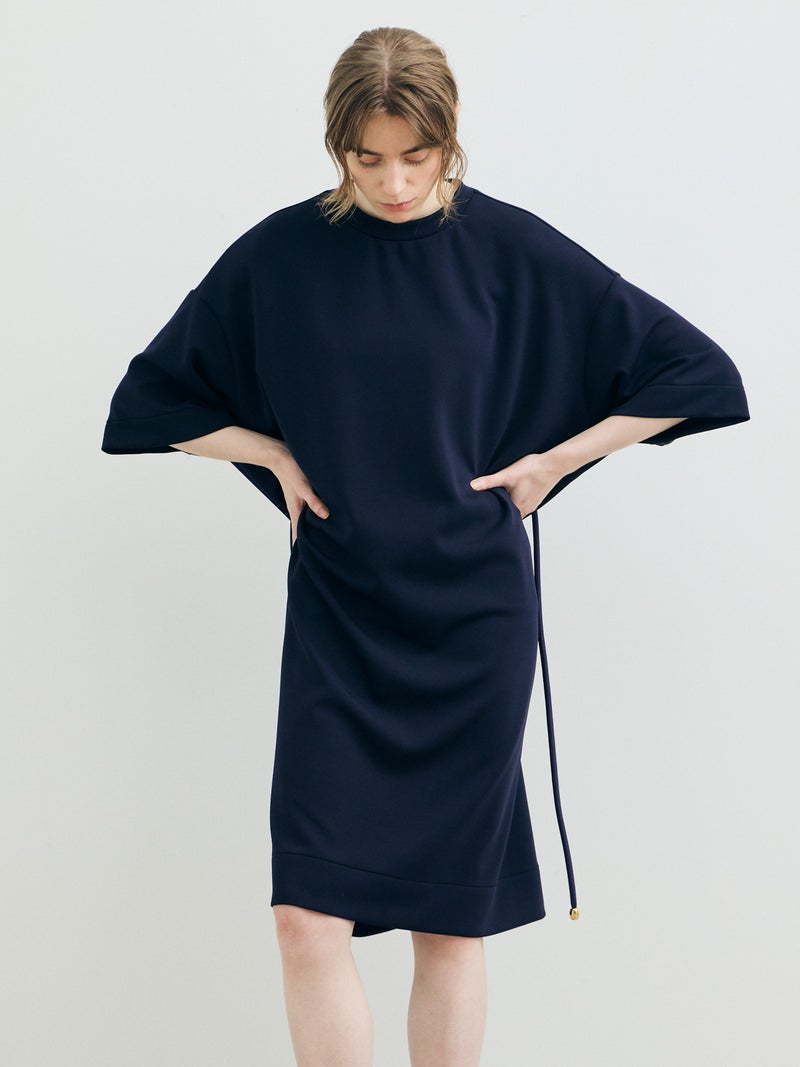 肉感のあるダンボール素材で仕上げたクルーネックドレスです。しなやかでストレッチがきいた動きやすいデザインが特徴的。ハトメとコードが特徴で、後ろで紐を結ぶとよりモード感のあるワンピースに、ウエストでブラウジングするとフォーマルな雰囲気が演出できます。スキニーデニムやぴったり目のパンツと合わせるのがおすすめ。金具がゴールドでアクセントになっています。着こなしによって表情を変化させていただける1枚です。