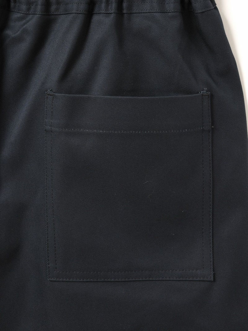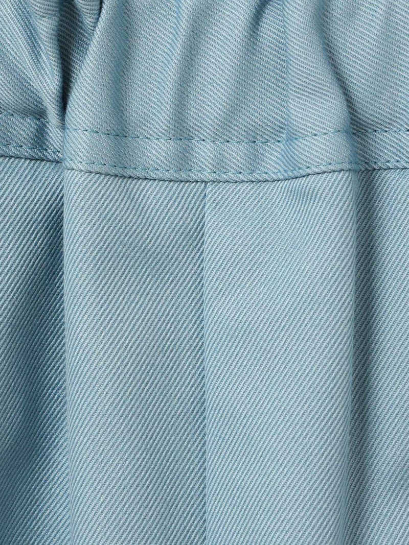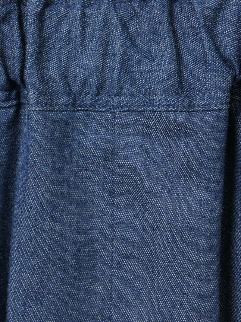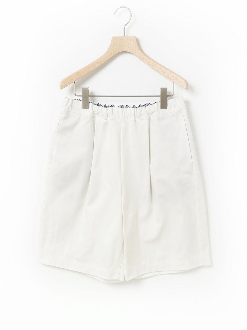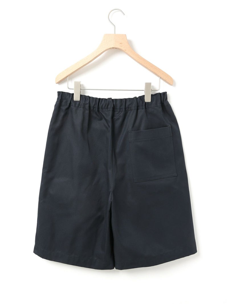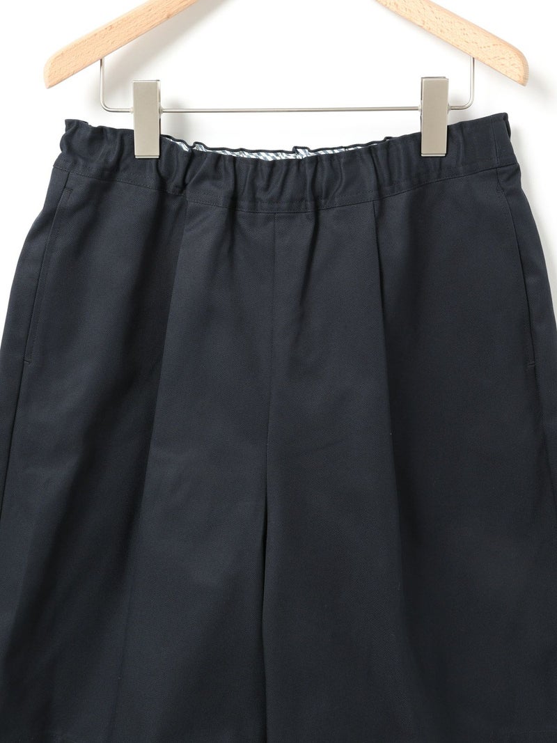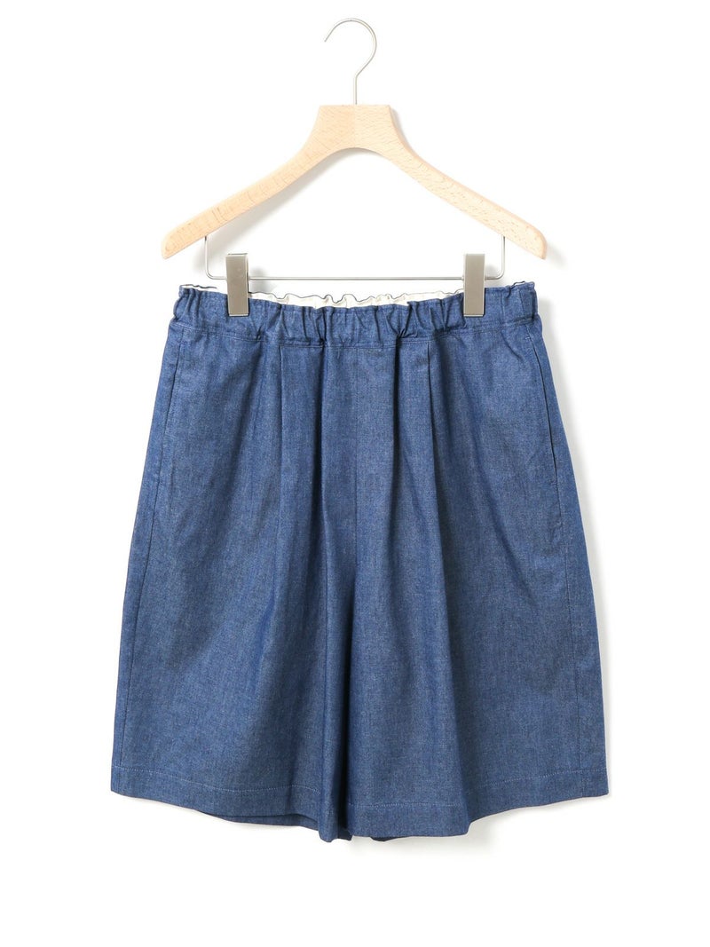 丈が短すぎず安心して着られるイージーショートパンツです。フロントにタックがありボーイッシュすぎないシルエットが特徴。ゴムウエストで楽に着ていただけ、ウエストに内紐があることでサイズ調整可能。20S綿ツイルを使用。しっかりめのツイル素材でメンズライクな印象で着こなしていただけます。ブルーは5.5ozの薄手デニムを使用。1-830023/デニムシャツジャケットとセットアップで着用可。