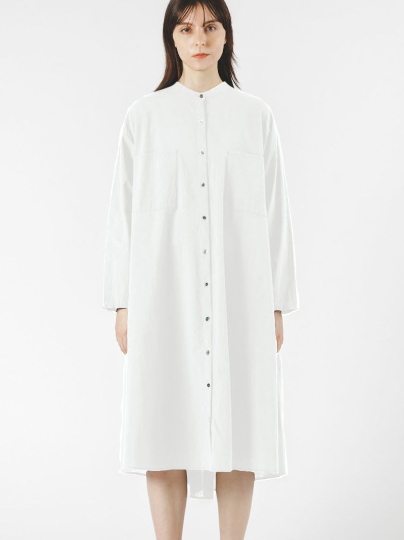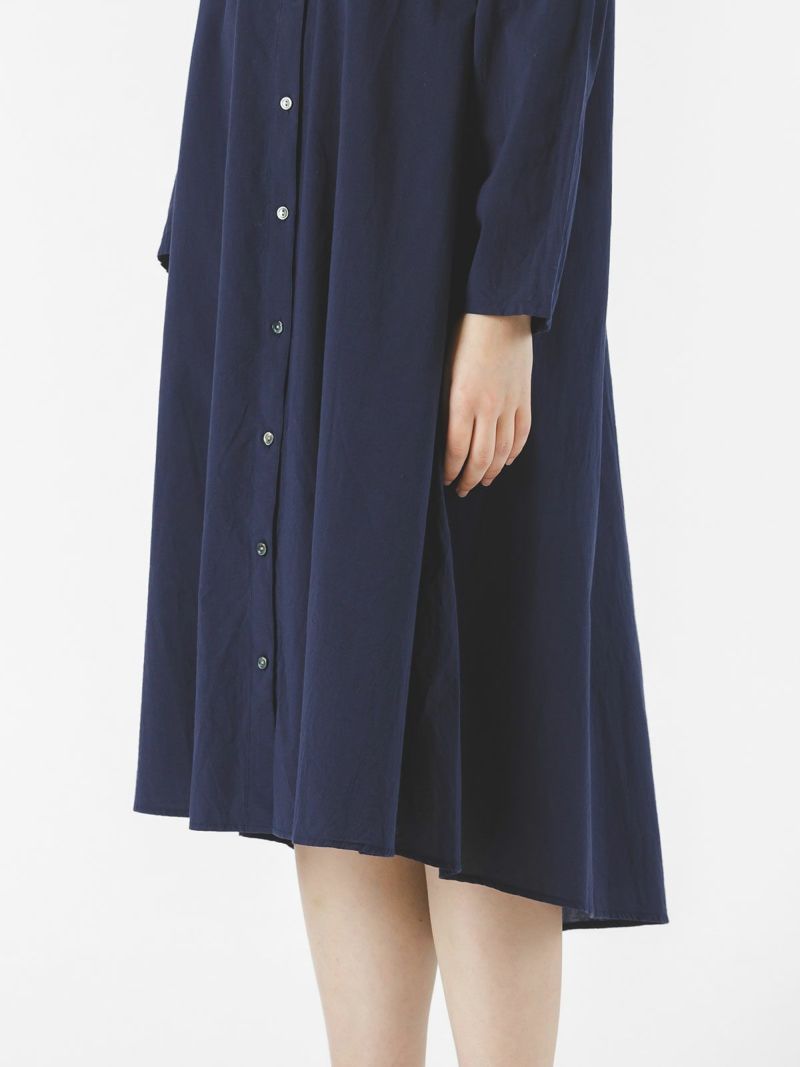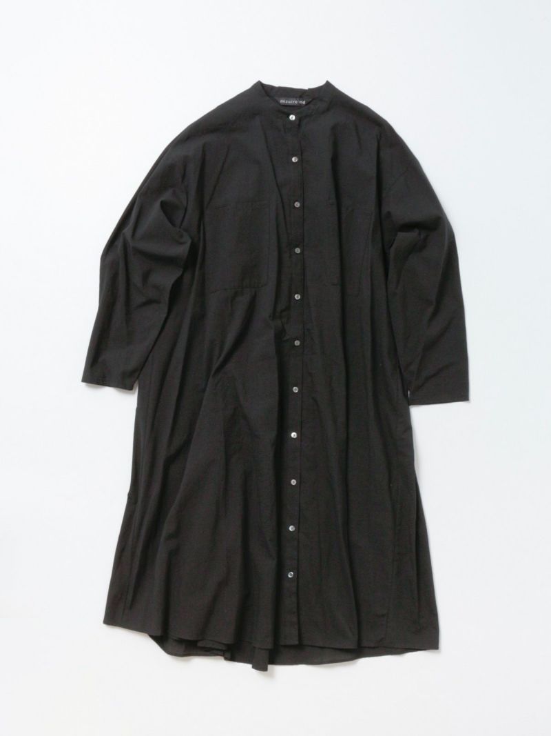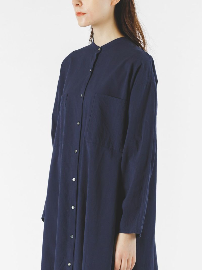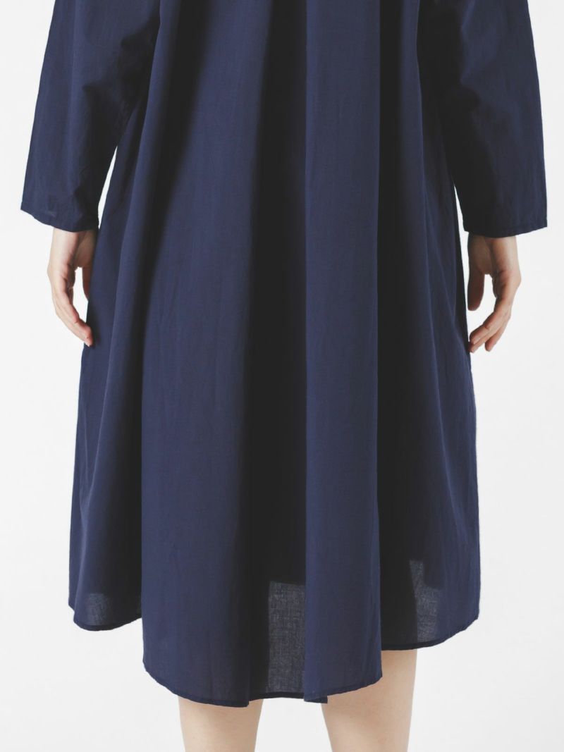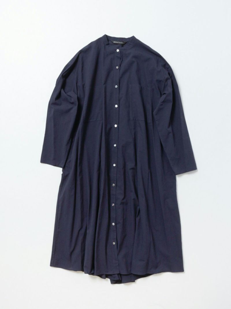 mizuiro indの定番型ワンピース、60ローンの素材を使用したポケット付バンドカラーロングワンピースです。大きな胸のポケットが特長。スッキリ感のバンドカラーの襟元から膝下までのフレアラインがキレイなシルエットで、背中にタックを施した動きのあるシルエットを表現しました。レイヤードアイテムとしてもお勧めの1枚です。着心地のよいコットン生地で、気温の変化によって中に重ね着ができ、上からカーディガンを合わせたりと、長く愛用して頂けるワンピースです。