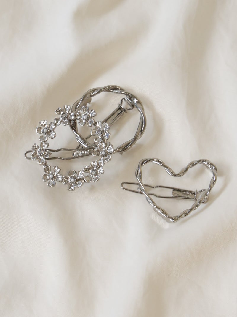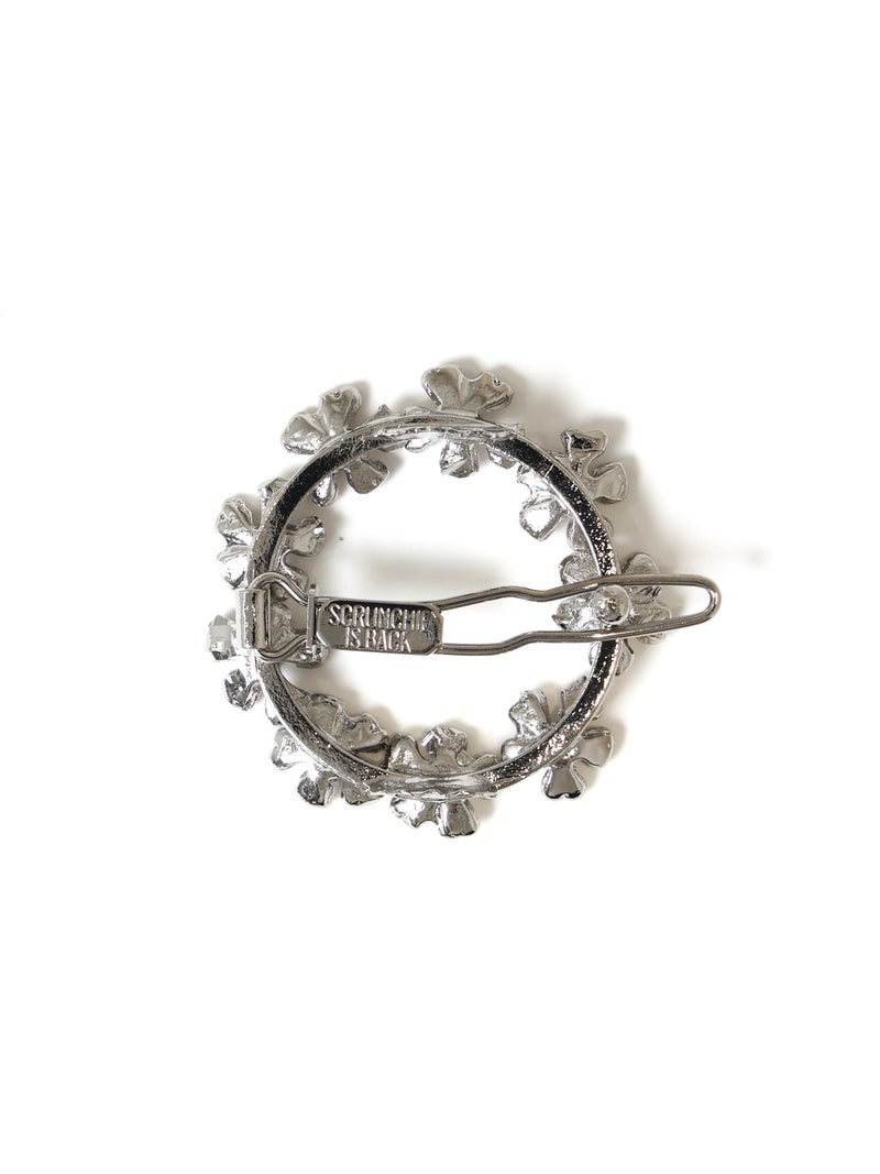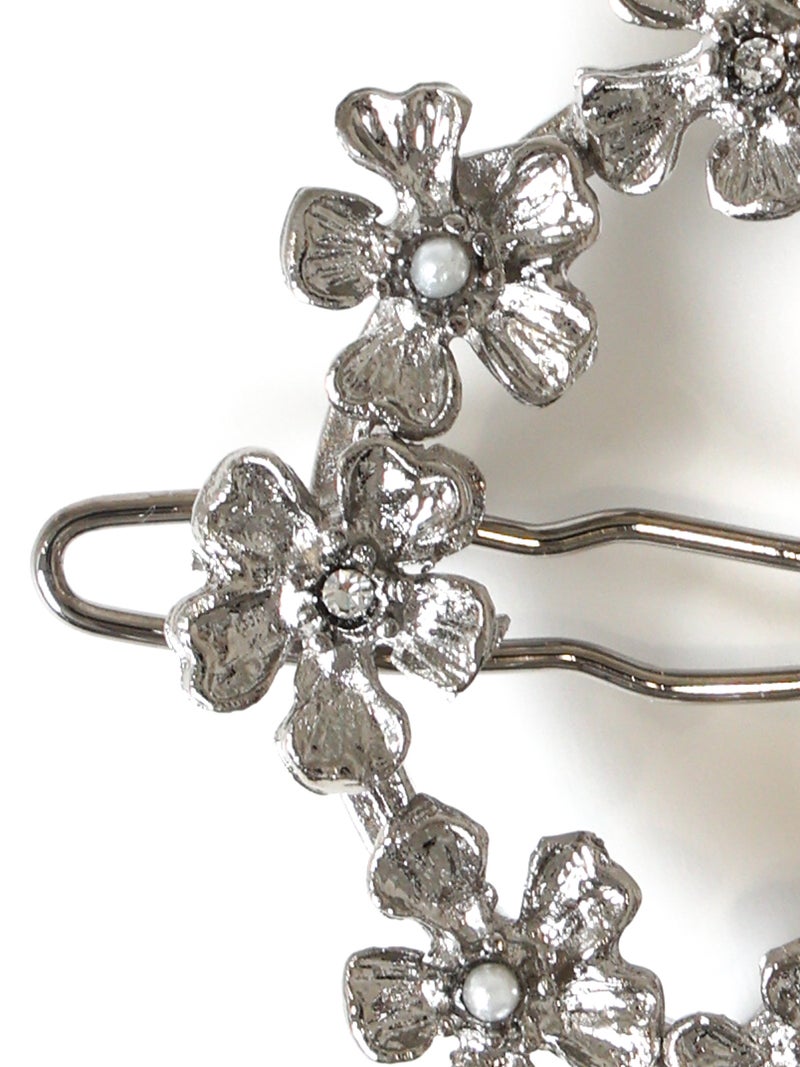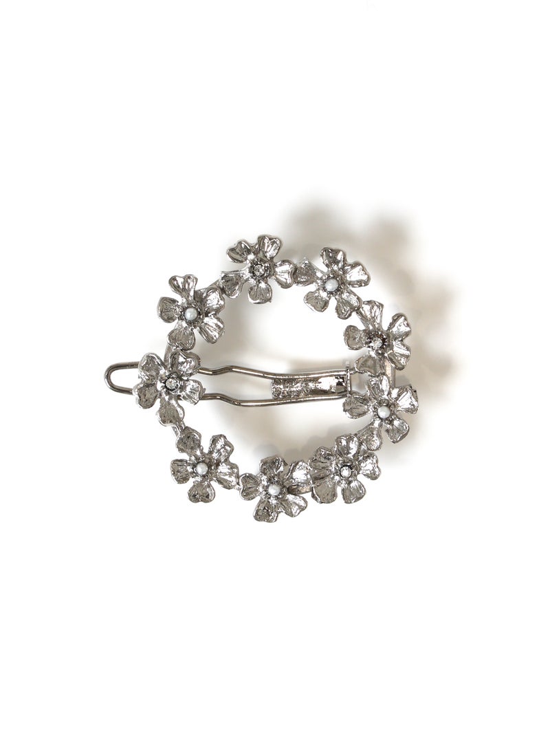 フランス製の、繊細なステンレススチール素材を使用したシルバーカラーのヘアクリップ。ラウンドフラワーモチーフの中央には、小さなパールとクリスタルをあしらい、細やかなディテールが上品なアクセントを添えます。