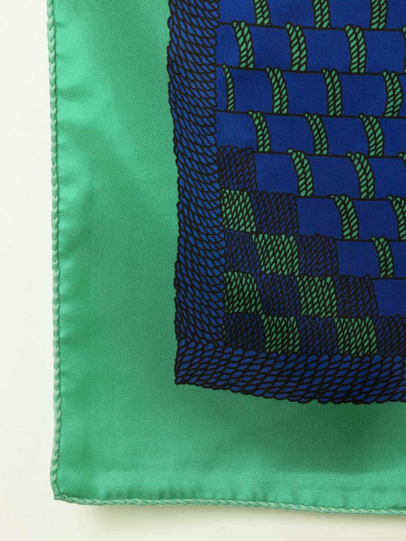 発色が美しい大判スカーフ。鮮やかな緑と青が目を惹きます。高級感のあるシルク100%でなめらかな肌触り。トラッドな柄が印象的で、コーディネートを華やかに仕上げます。