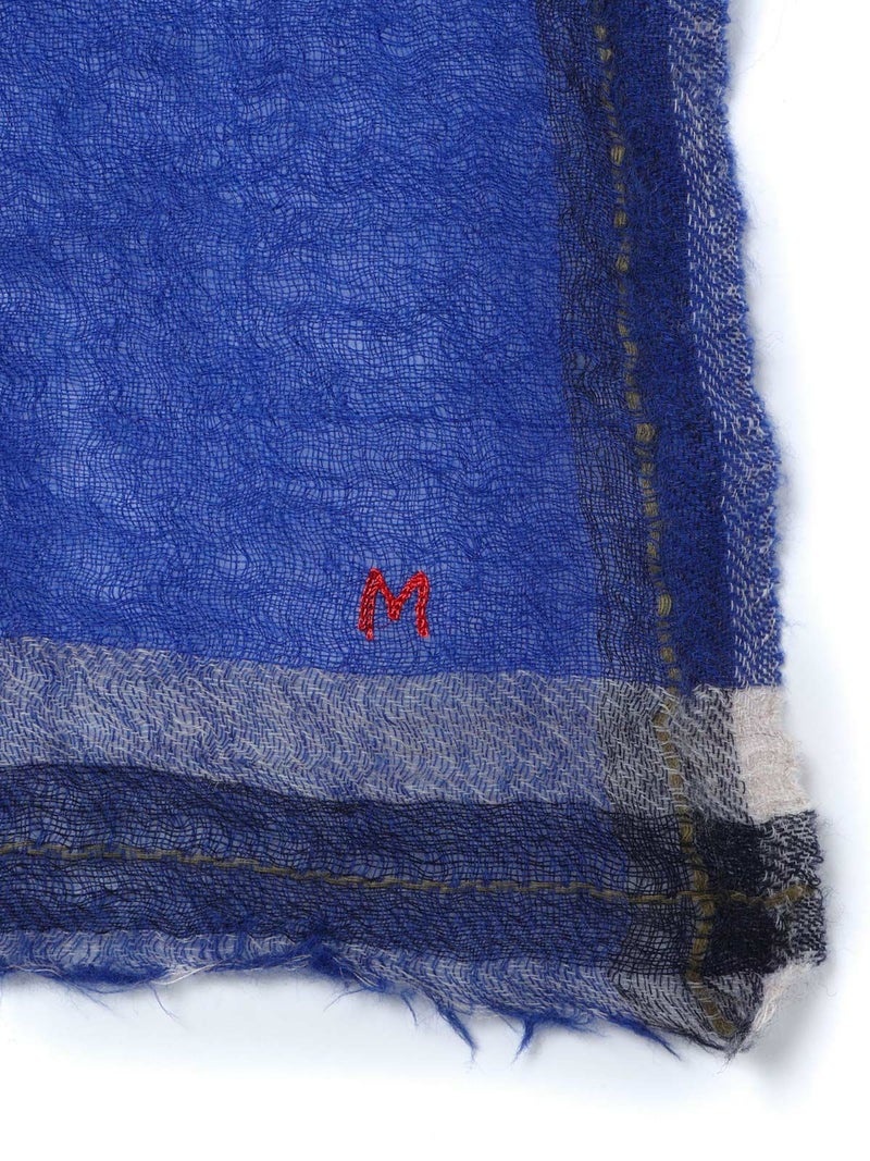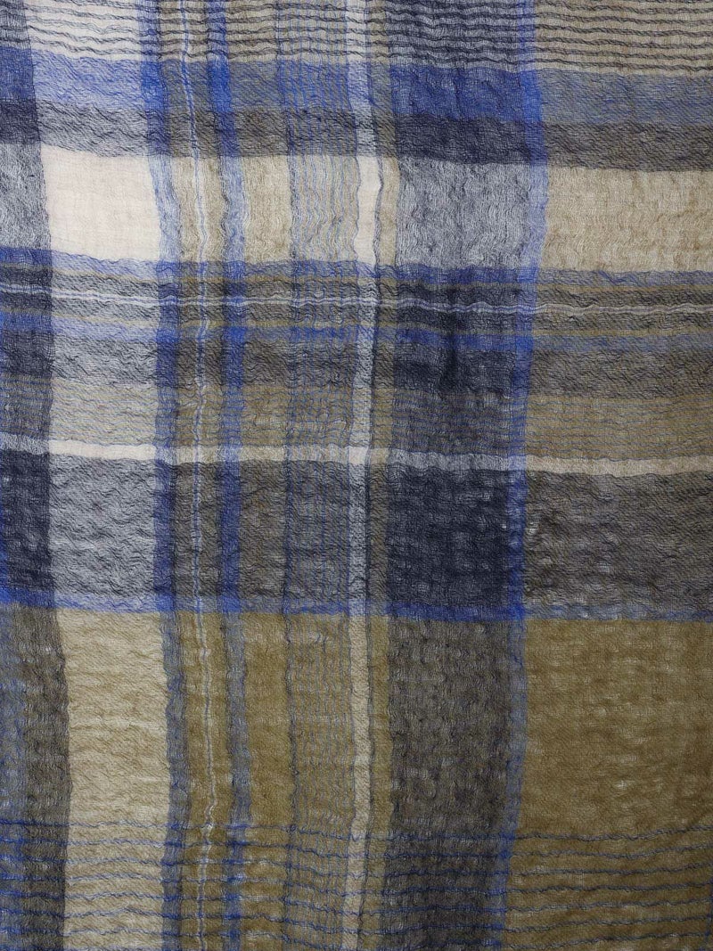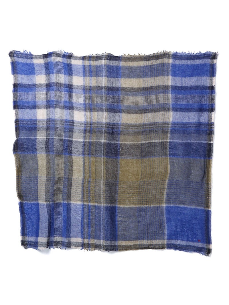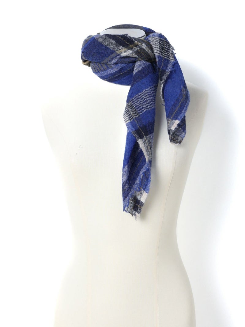 落ち着いたブルーのチェック柄が印象的な大判のスカーフ・ストール。スクエア型で、さりげなくコーディネートのアクセントになります。薄手で柔らかなウール素材が、温かな空気を包み込み、寒い季節を優しく彩ります。
