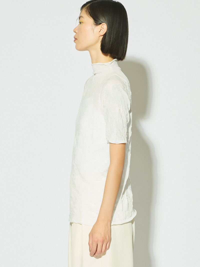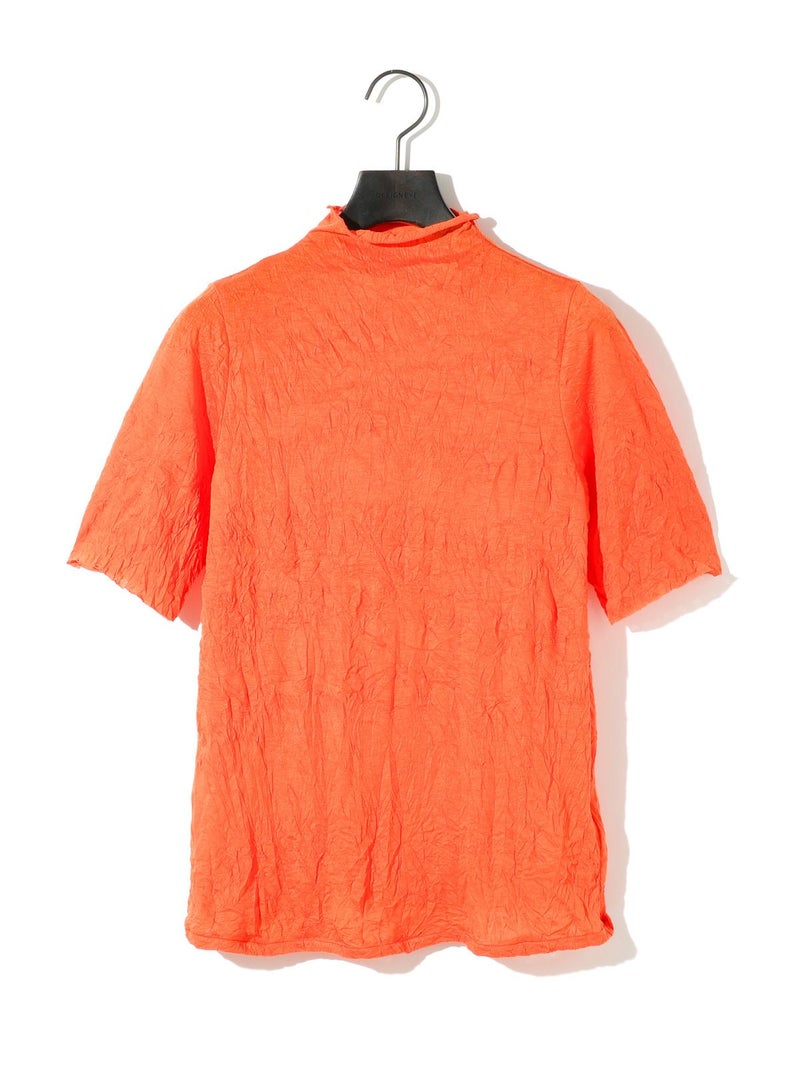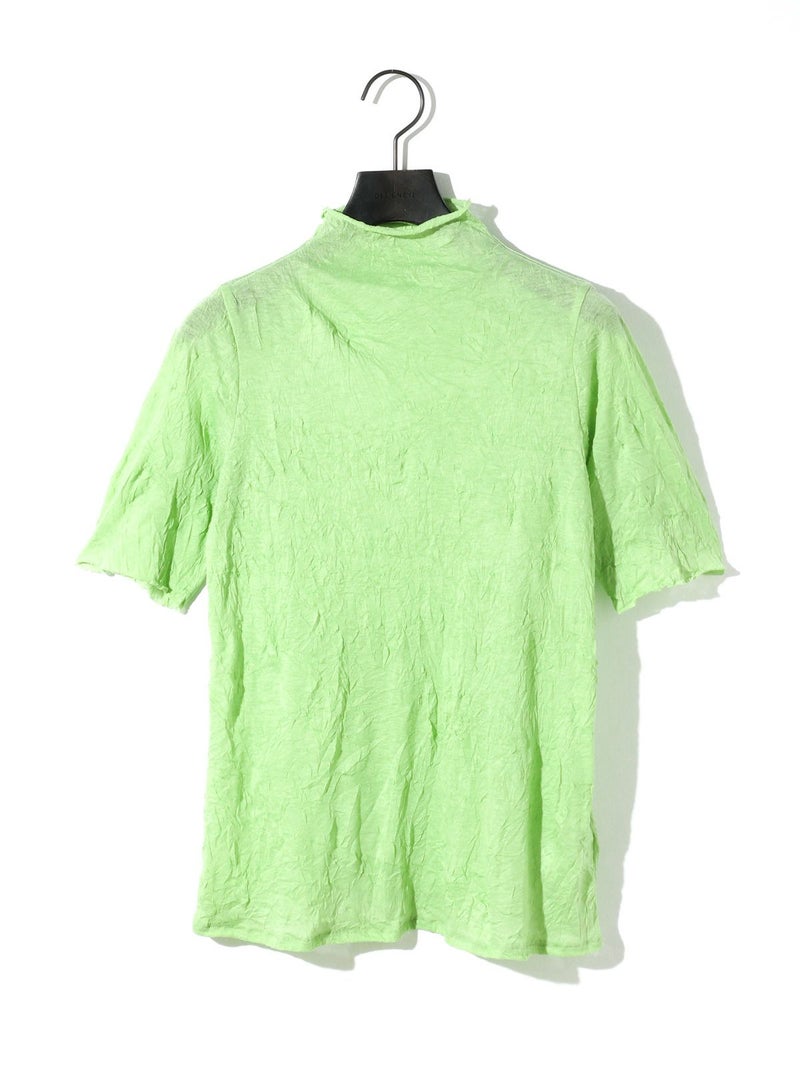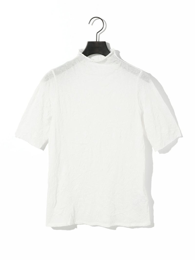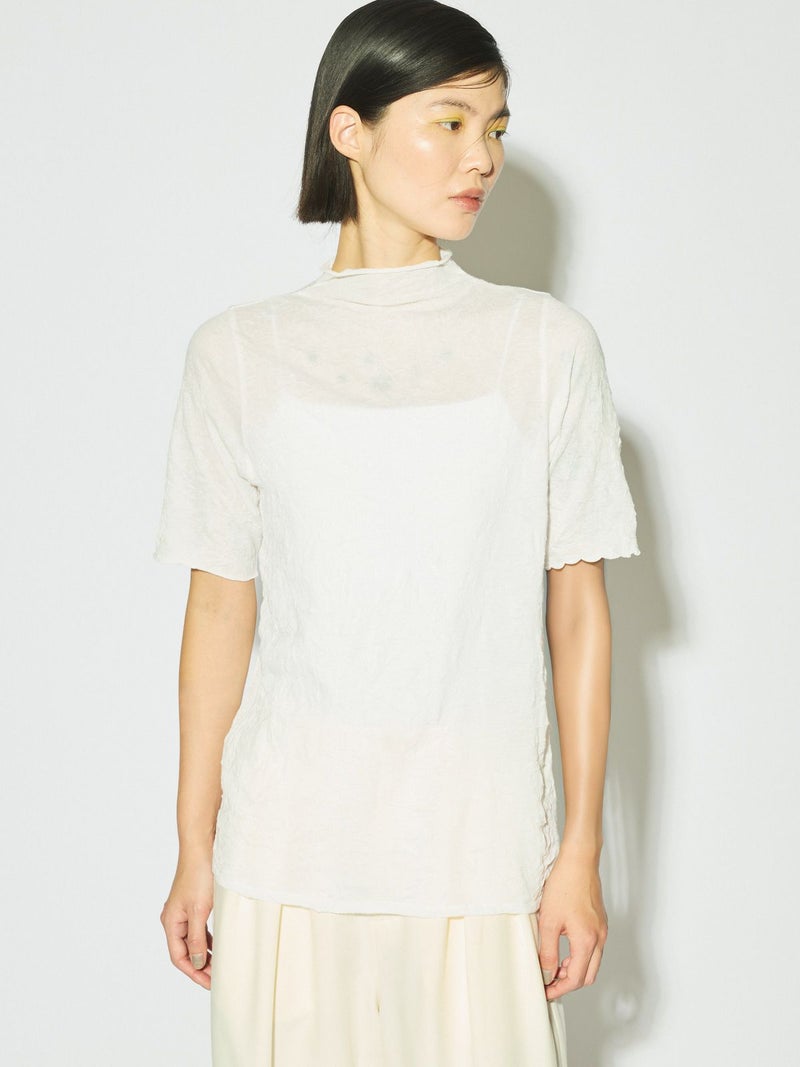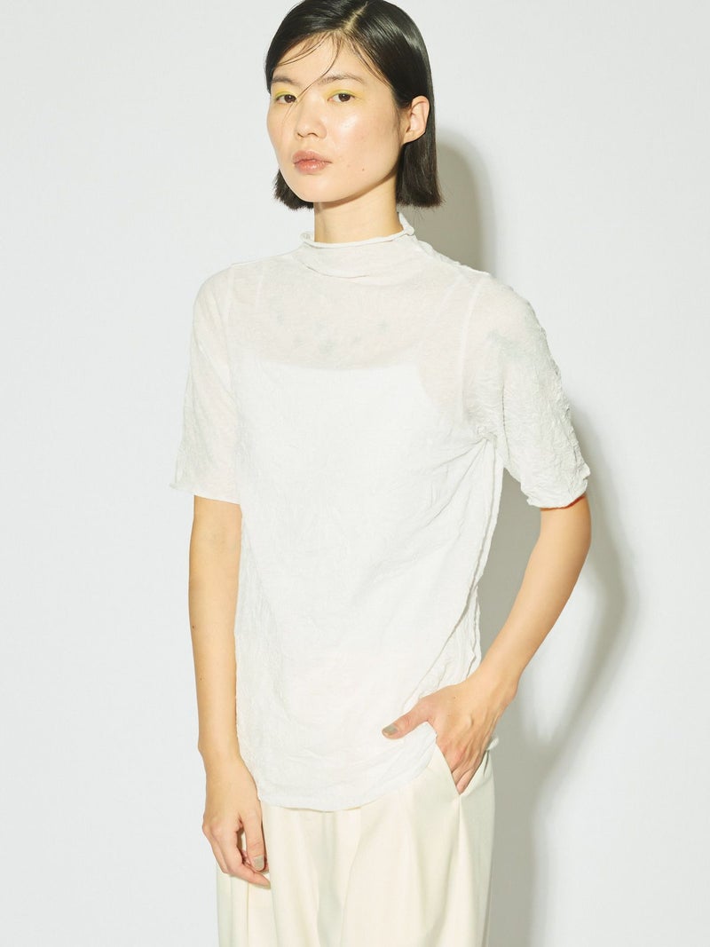 MIDIUMISOLIDの実績型でもあるシースルーハイネックハーフスリーブインナーです。今季NEWカラーを取り入れた新鮮な1枚となっています。天然ジワの表情を表現した生地が魅力的で、ナチュラルな質感と柔らかさを兼ね備えた程よいシアー感が特徴。キレイな色合いと透け感が上品な大人の雰囲気を演出します。生地が薄いので重ね着してもすっきりと着用できるのもポイント。ハイネックの首元も清涼感があるので爽やかでシャープな印象に仕上がっています。