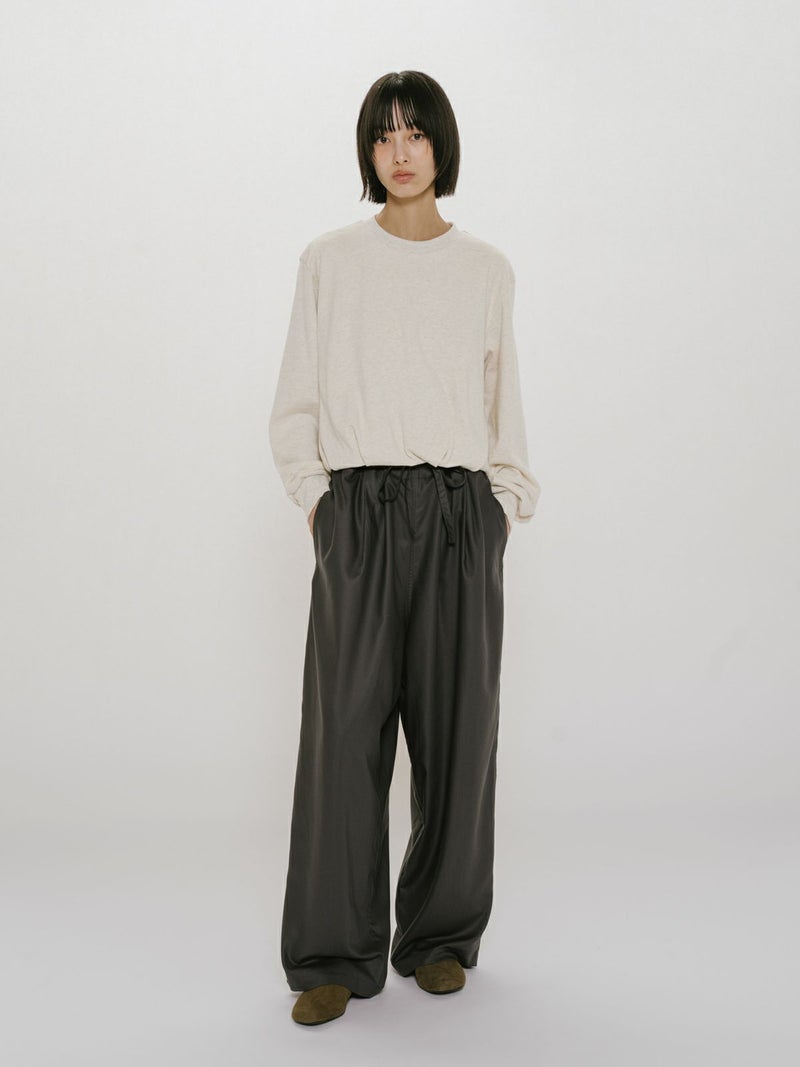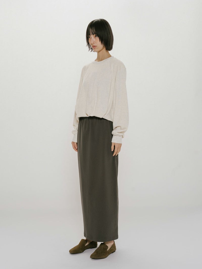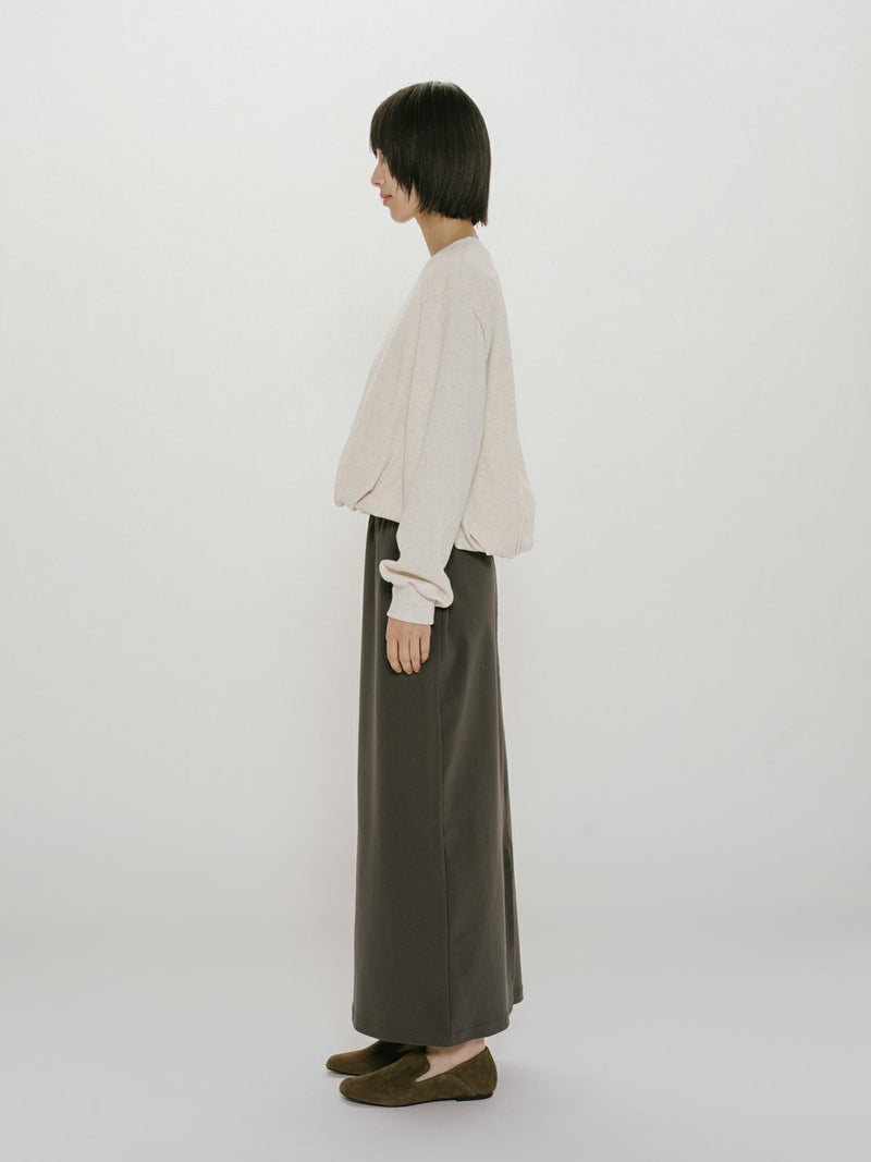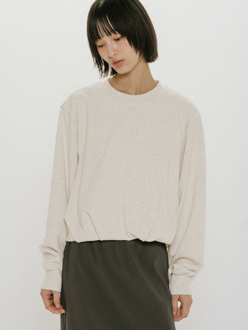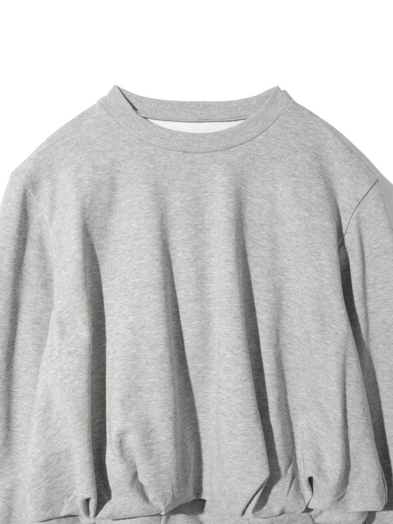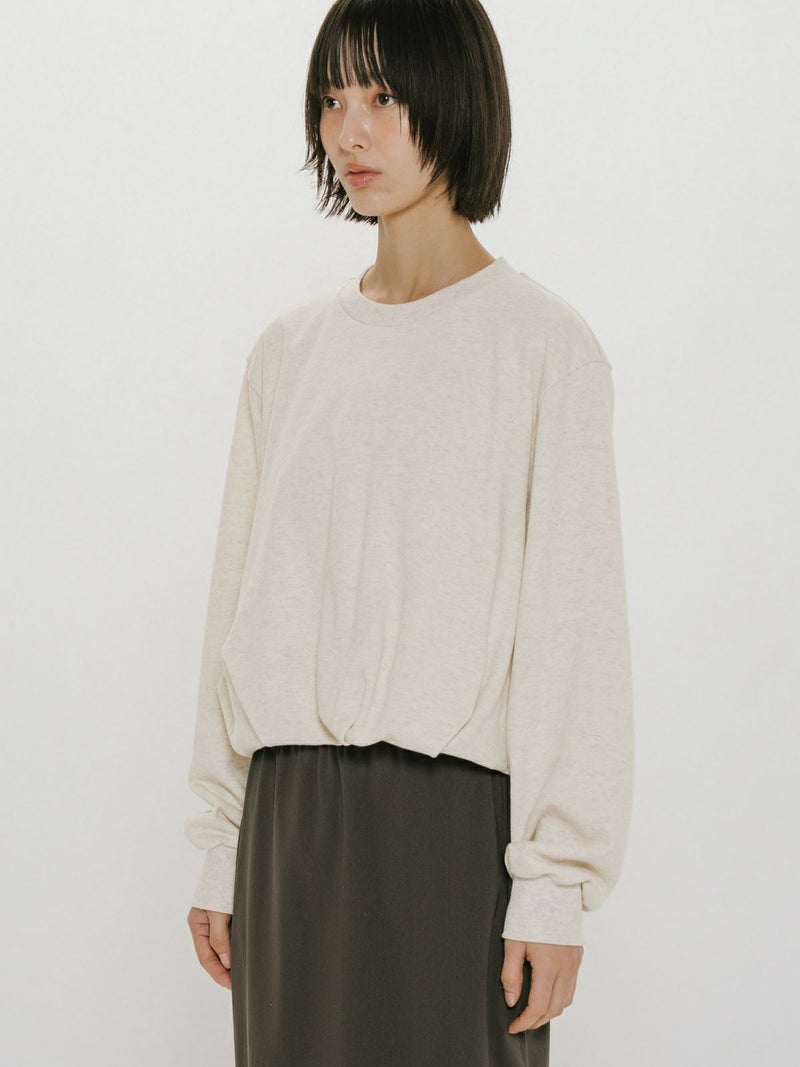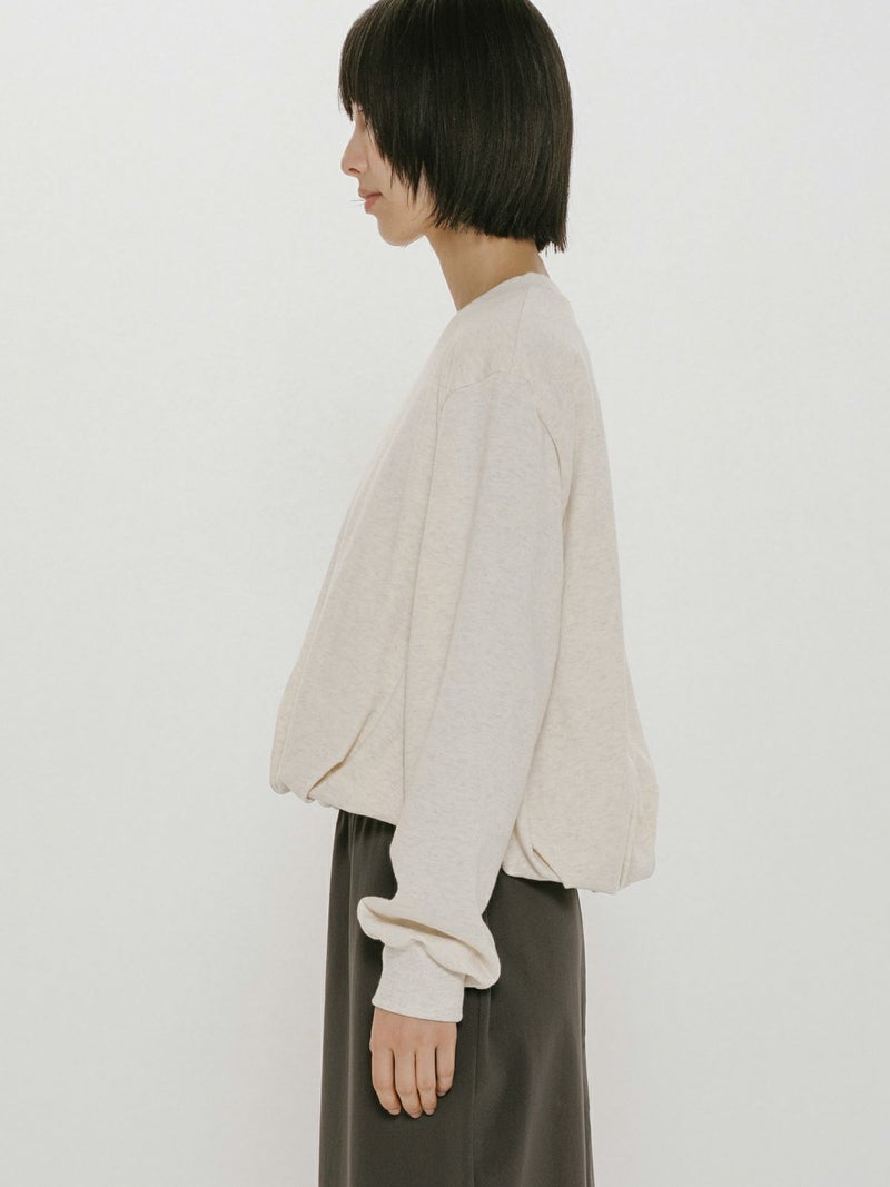 昨年ブラウスで展開し大好評いただいていたデザインをカットソーに落とし込んだバルーンスウェットプルオーバーです。裾にタックを入れ、軽くふんわりとしたバルーンシルエットを表現。ミニ裏毛のカジュアルな素材に、あえてカジュアルなカラーのみを展開しております。すっきりとした短めな丈で若干の前後差を付けています。1枚でシンプルで着用しても良し、インナー使いも可能なカットソーです。