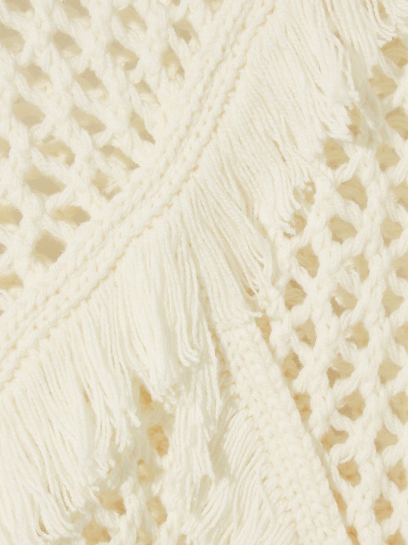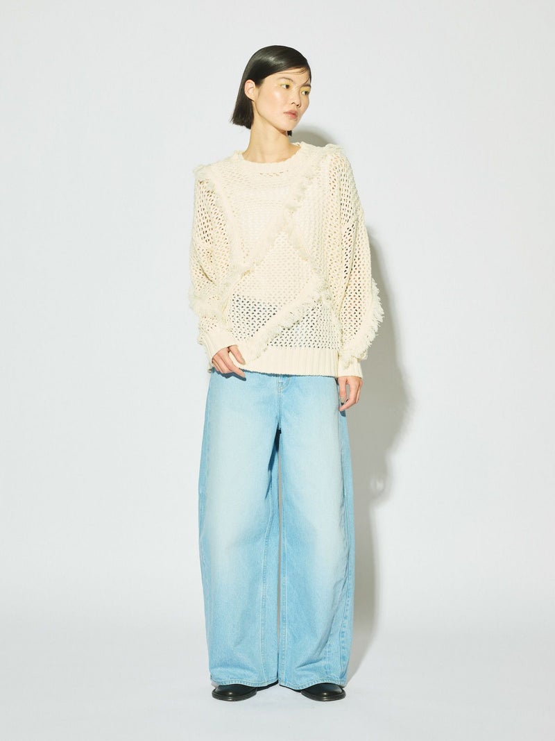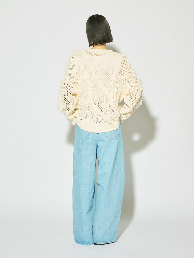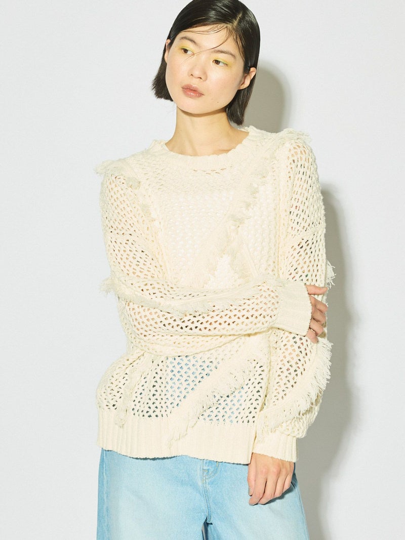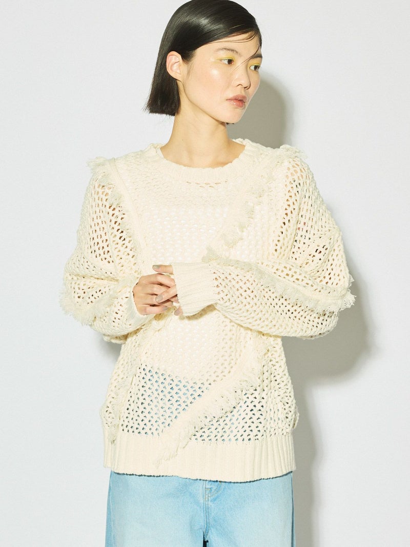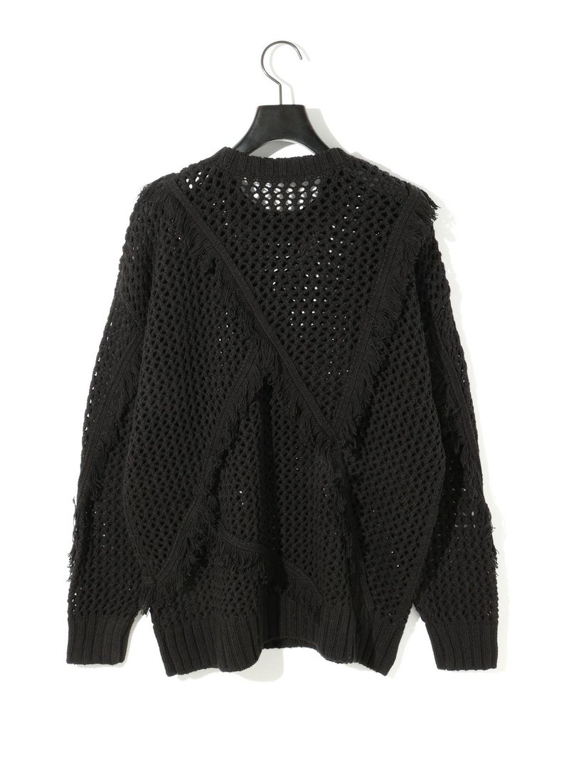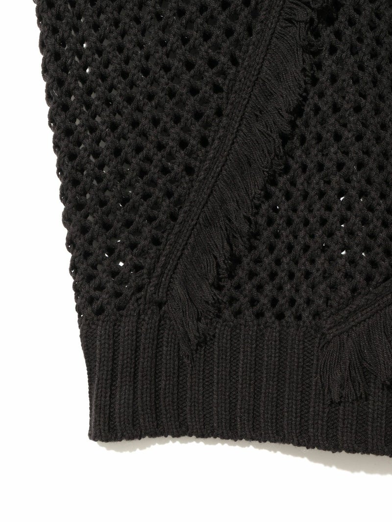 メッシュニットにフリンジを取り入れたデザインでモード風な雰囲気が魅力のフリンジメッシュプルオーバーです。丈はやや長めで緩さをもったアイテム。樹脂加工でだれないように且つ軽さが特徴。季節の進み具合や気温の変化によって重ね着を楽しんでいただける1枚です。同シリーズ1-122134/サイドリボンフリンジメッシュベストも展開。