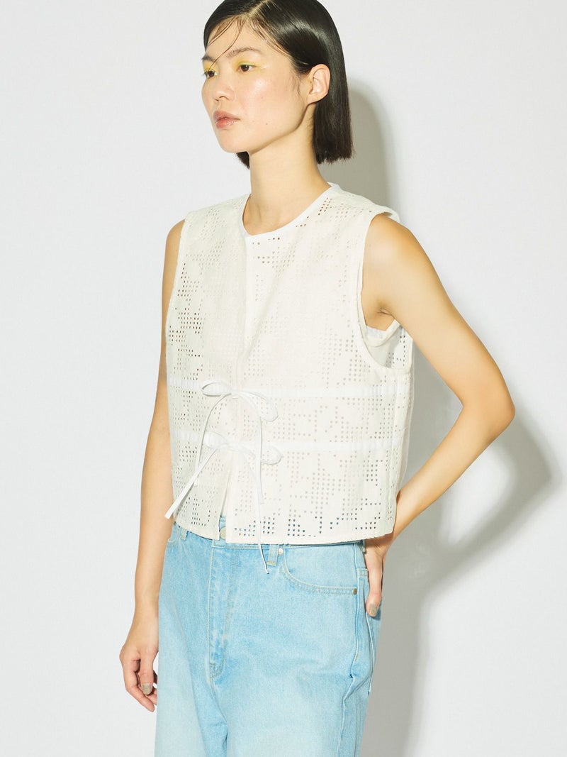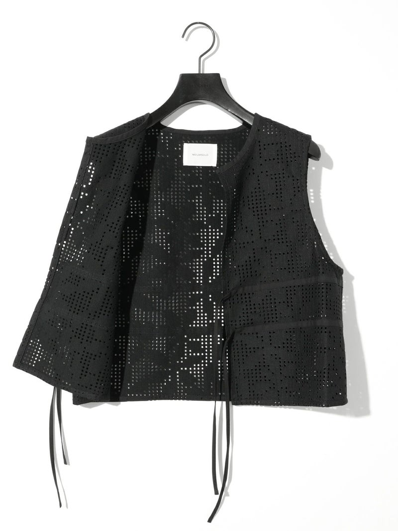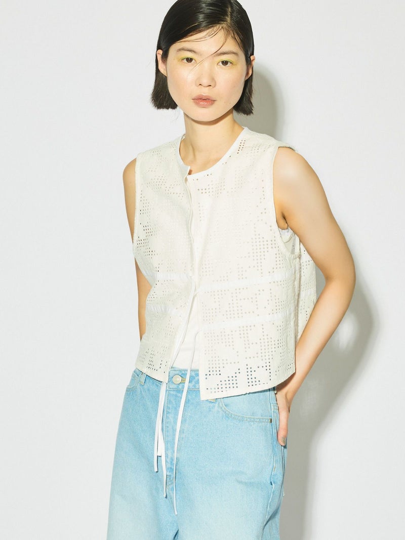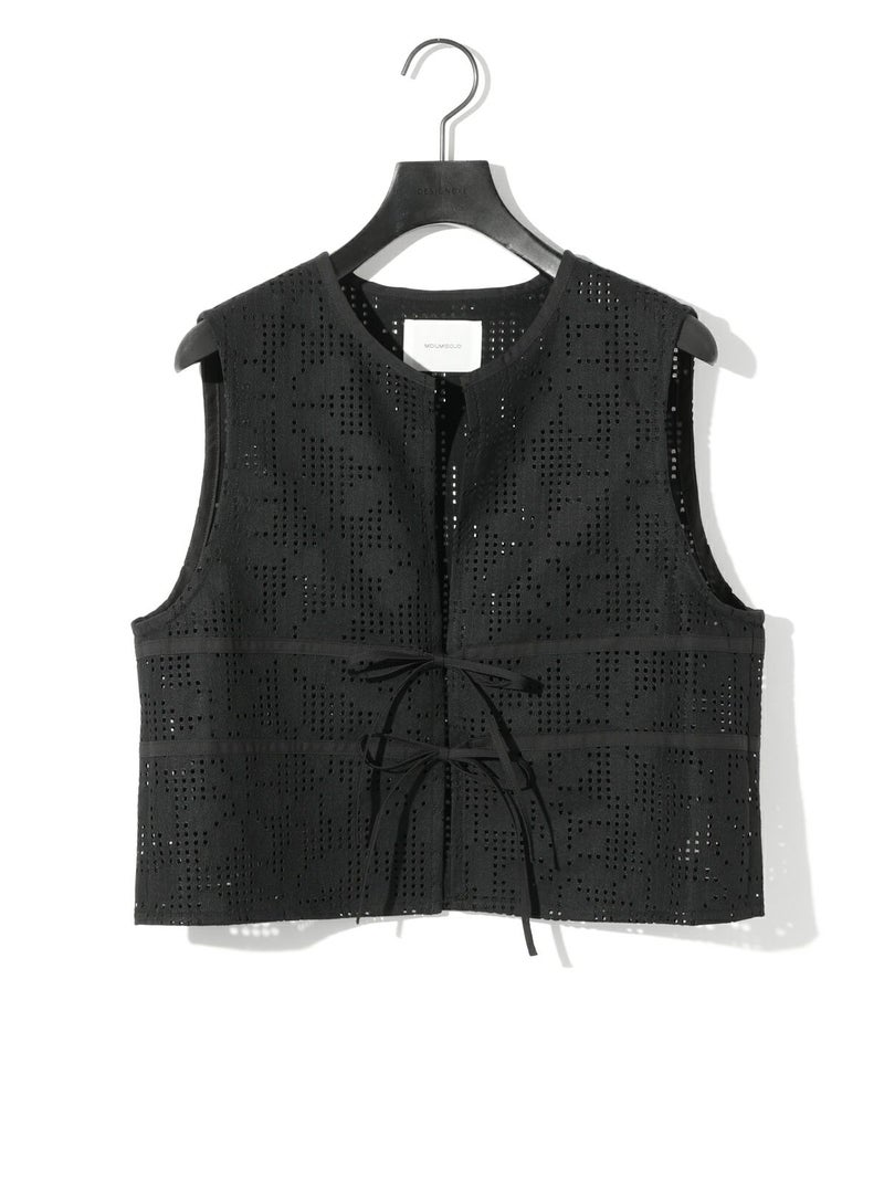 ラッセル編機で編まれたレースで薄く仕上がり季節感も意識したレースショートベストです。シアーアイテムやキャミソールとの相性がよく女性らしい魅力的なコーディネートを演出。コンパクトなサイズ感でスッキリとした着こなしでレースの上品さを印象付けます。フロント紐の留めはあえて結ばず垂らすことでポイントにも。着こなしのアレンジを楽しんでいただける1枚です。1-162172/レースイージーパンツも展開。