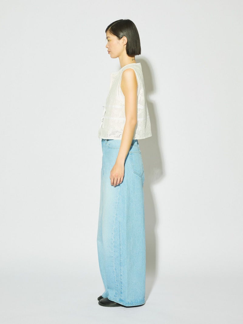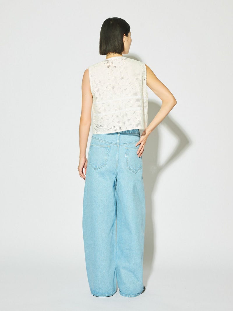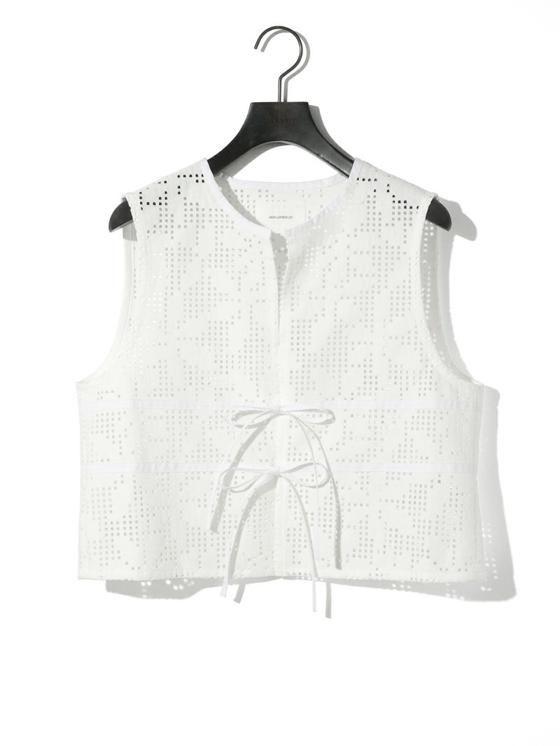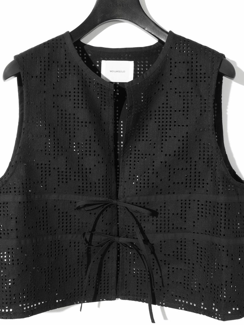 ラッセル編機で編まれたレースで薄く仕上がり季節感も意識したレースショートベストです。シアーアイテムやキャミソールとの相性がよく女性らしい魅力的なコーディネートを演出。コンパクトなサイズ感でスッキリとした着こなしでレースの上品さを印象付けます。フロント紐の留めはあえて結ばず垂らすことでポイントにも。着こなしのアレンジを楽しんでいただける1枚です。1-162172/レースイージーパンツも展開。