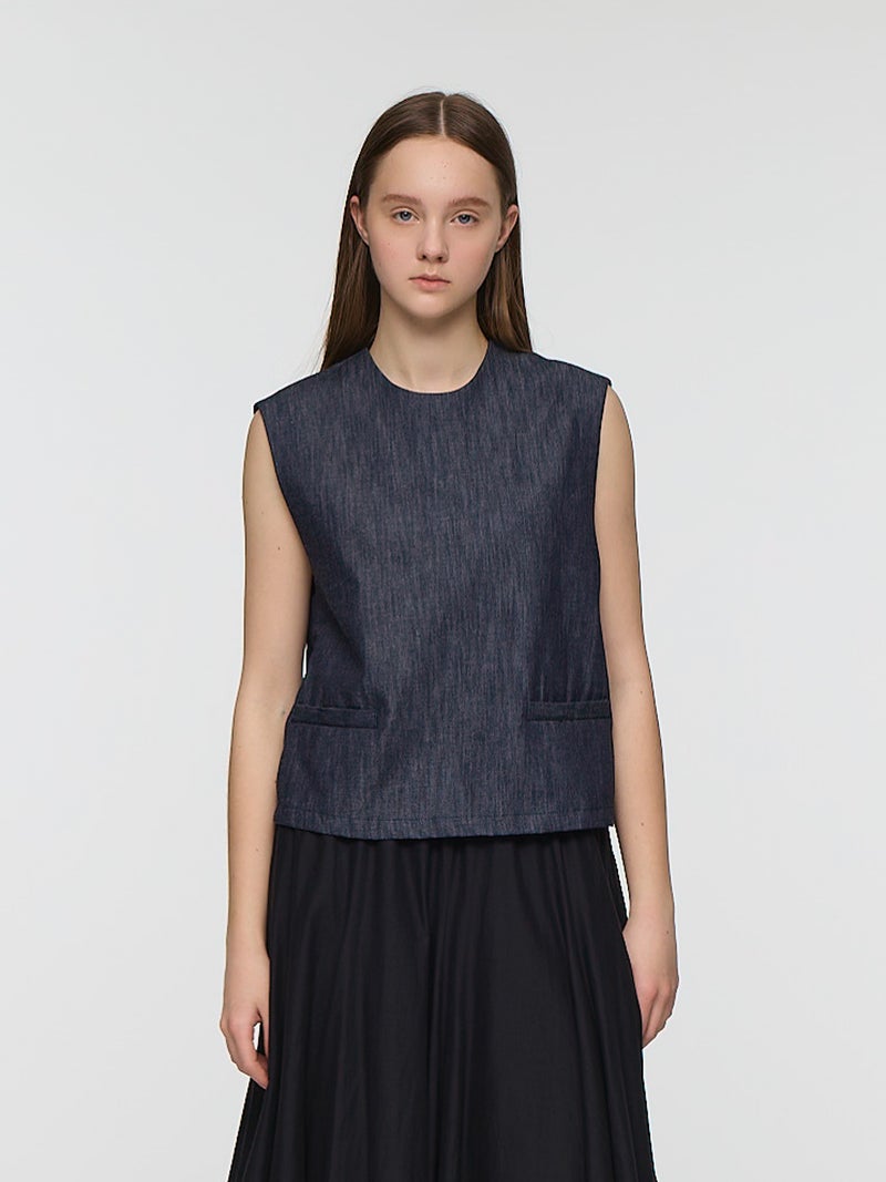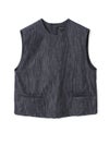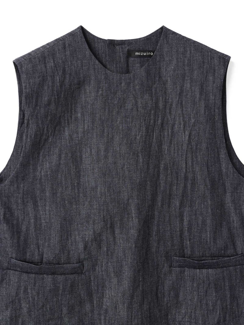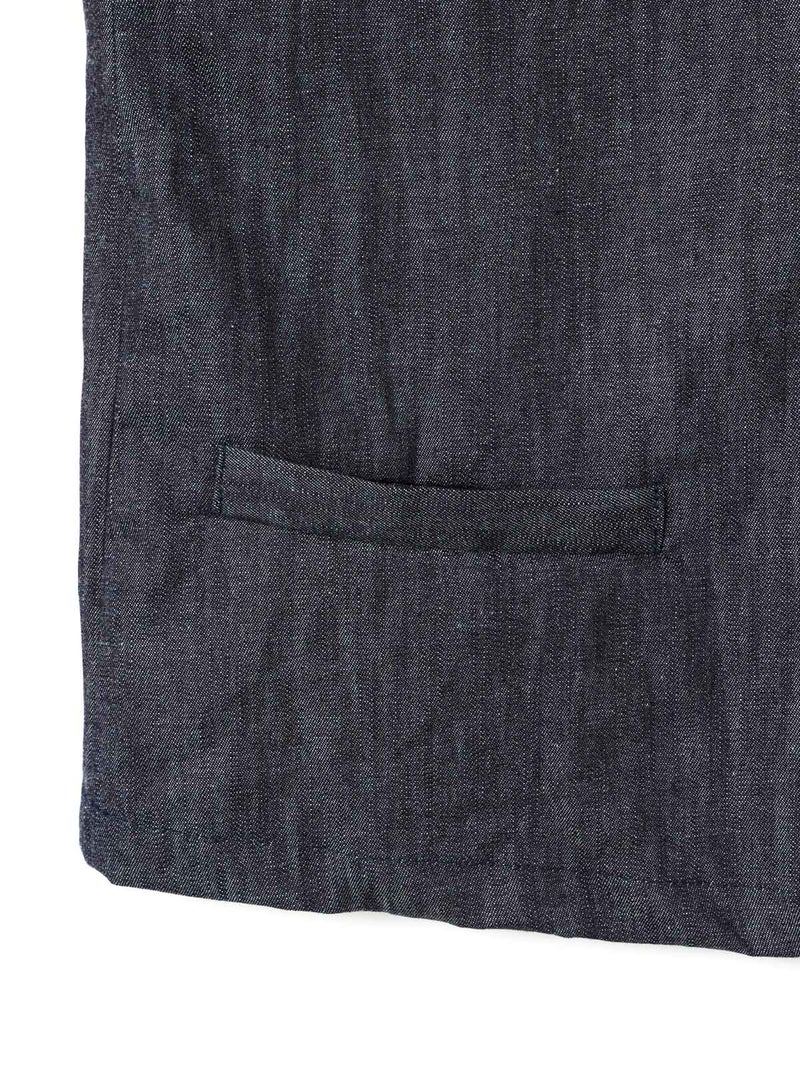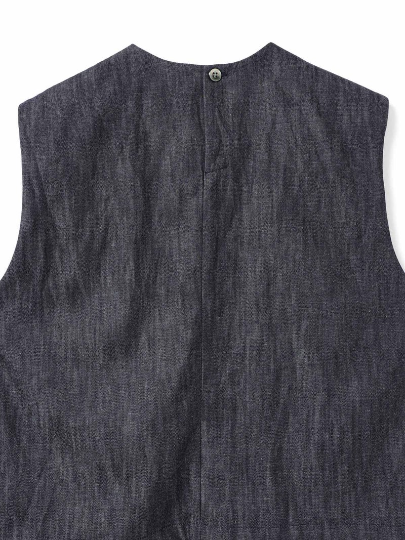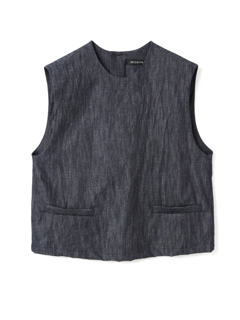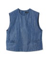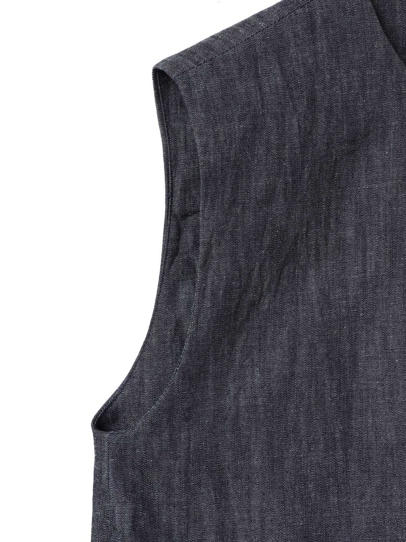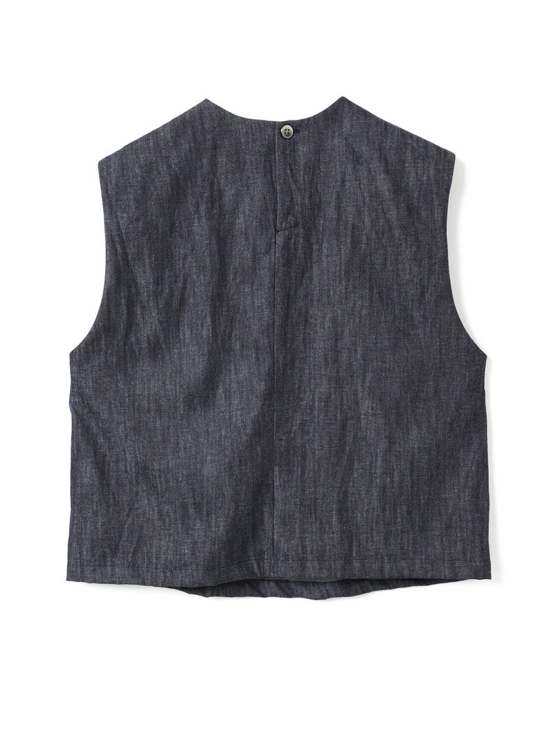 6ozデニムを使用したデニムショートベストです。コンパクトなサイズ感ですが重ね着をしやすくアームを広めにデザインした1枚。浅めのポケット付。バックネック部分にボタンが付いているので着脱しやすいデザインです。新品の時期は色落ちに注意が必要なため、お洗濯は別で手洗いをお勧めします。徐々に色落ちの心配はなくなります。
