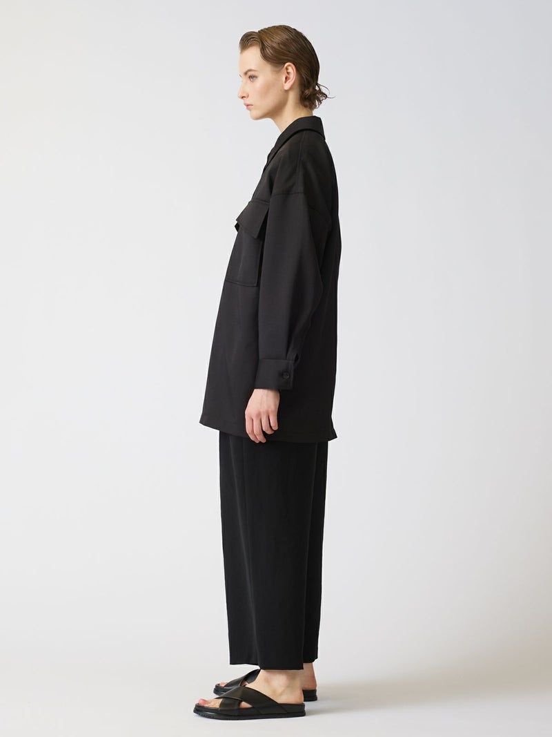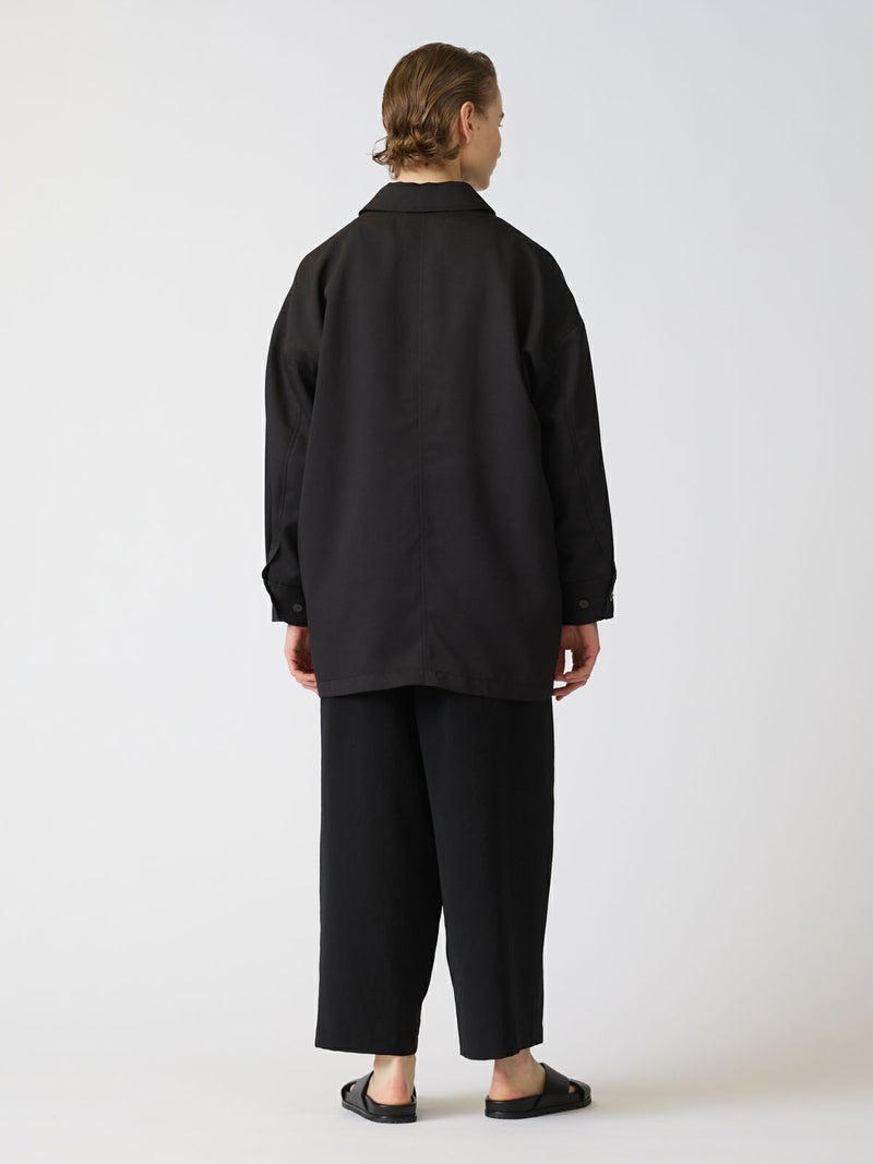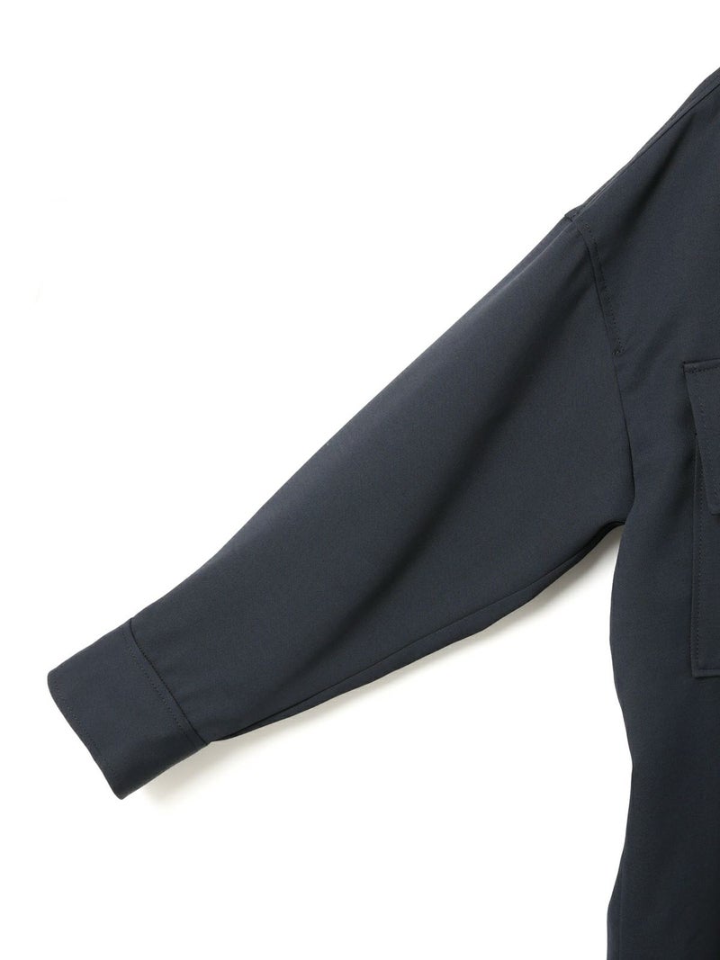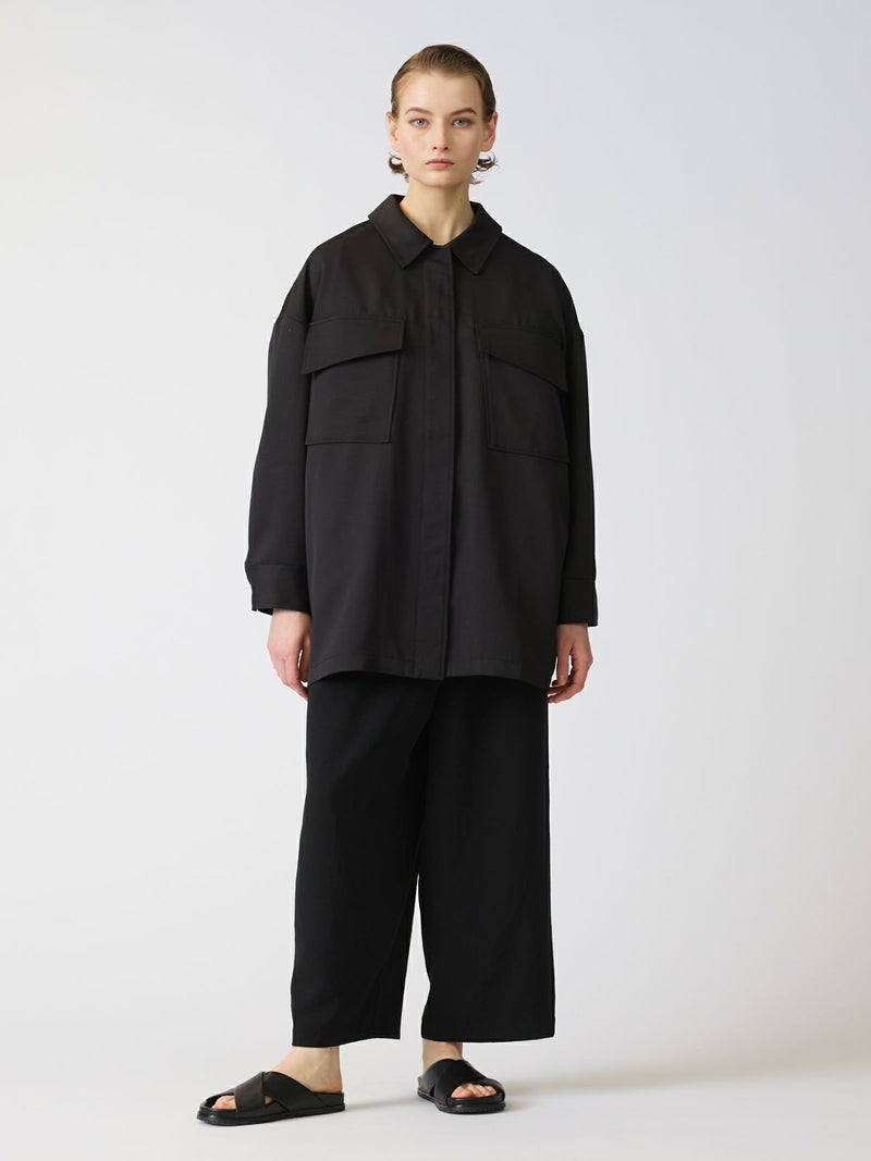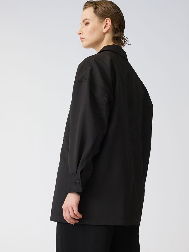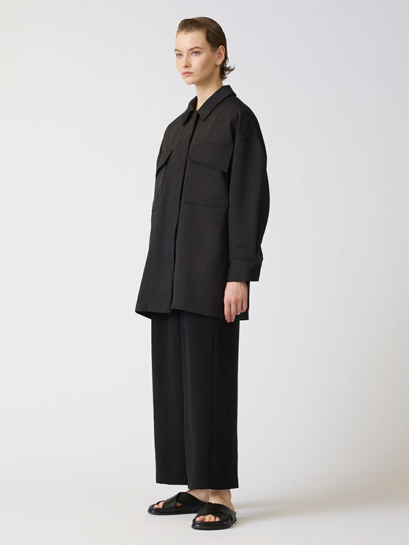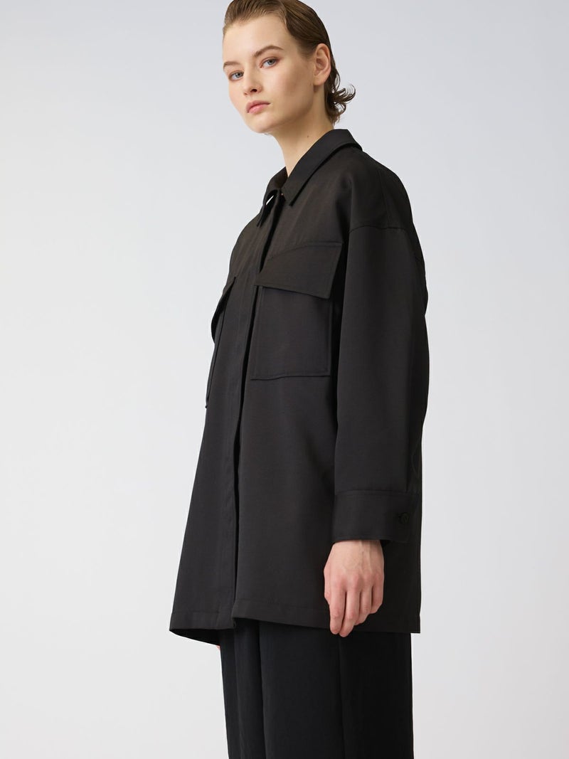 中空糸で軽いタッチの素材が特徴のワークワイドシャツジャケットです。ゆったりとしたサイズ感でジャケットよりも軽くシャツよりもしっかり感のある羽織アイテムです。比翼仕立てですっきりとしたデザインで胸の大きなポケットがアクセントになっています。フロントは開けてラフに着用することができ落ち着きのある大人の着こなしを演出します。春先は気温の変化が大きいので大変重宝していただける1枚となっています。