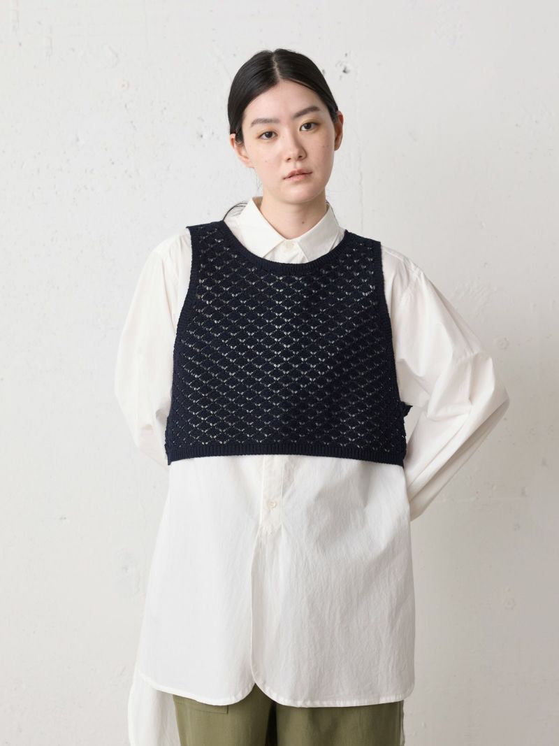 少しシャリ感のあるコットン糸を使用した2WAYショートニットベストです。前後で着用いただけるニットベストで、リボンの可愛さとベーシックなデザインを合わせ持った魅力的なベストです。着こなしによってベストの前後をどちらにするかで雰囲気の変化を楽しんでいただけます。鍵編みの透け感はインナー見えしてくれるので色・柄によって素敵な重ね着を演出してくれます。コンパクトなサイズ感に仕上げており、アクセントとして色々なアイテムにコーディネート可能。通年通して着用いただける素材です。