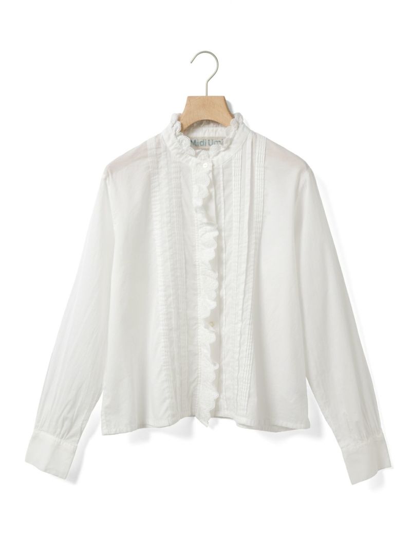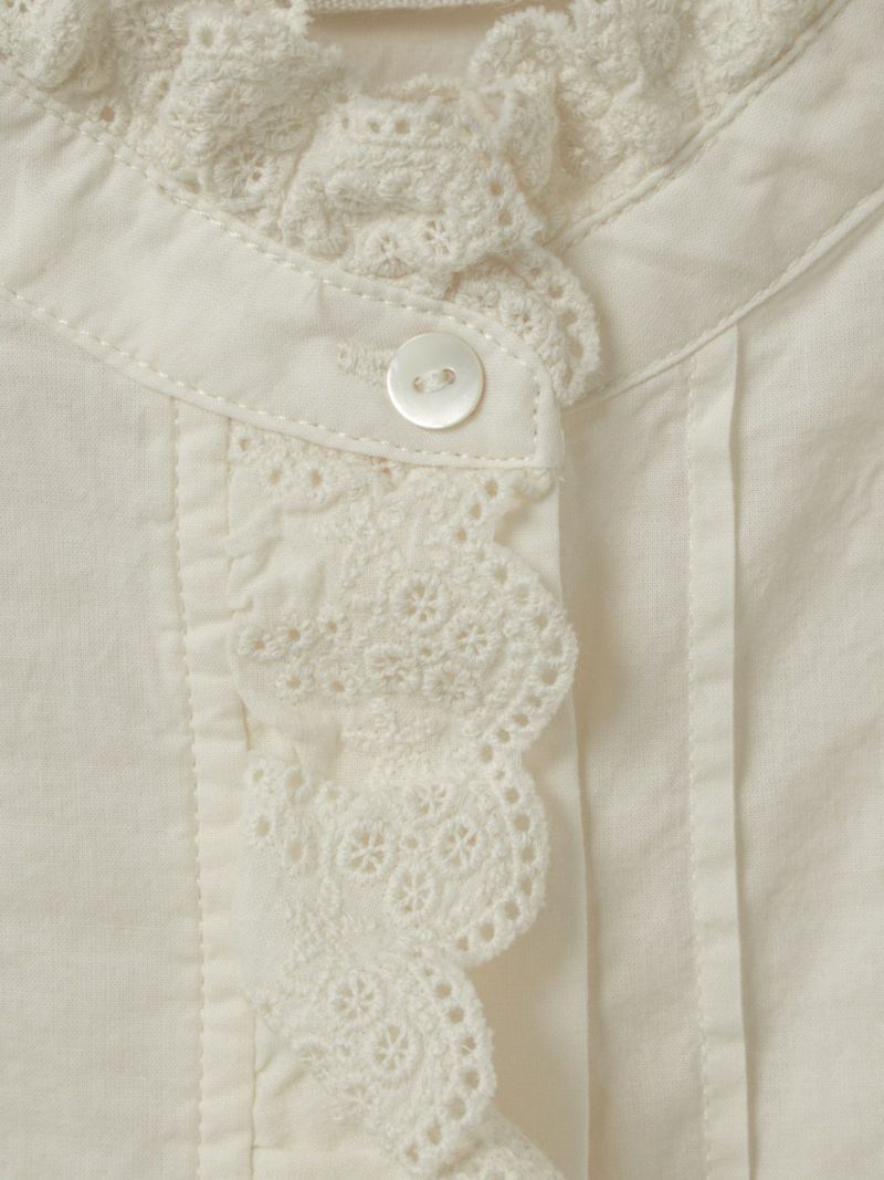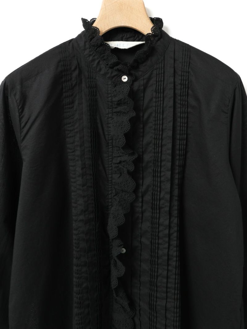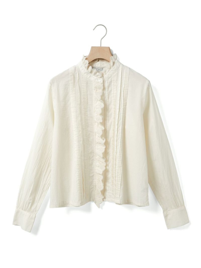 ローン×ヴィンテージライクエンブロイダリーレースで仕上げたピンタックレースシャツです。襟と前立てにレースをあしらい、ピンタックを組合わせた上品な1枚。透け感があるのでインナー使いで清楚にコーディネートするのがお勧め。首元のハイネックレースを魅せ、シャツ自体が重ね着アイテムとして役立つアイテムになってくれます。1枚でも素敵なシャツで、季節の変わりで軽装にしても印象的な着こなしを演出してくれます。同シリーズ1-730079/ピンタックレースベストも展開。
