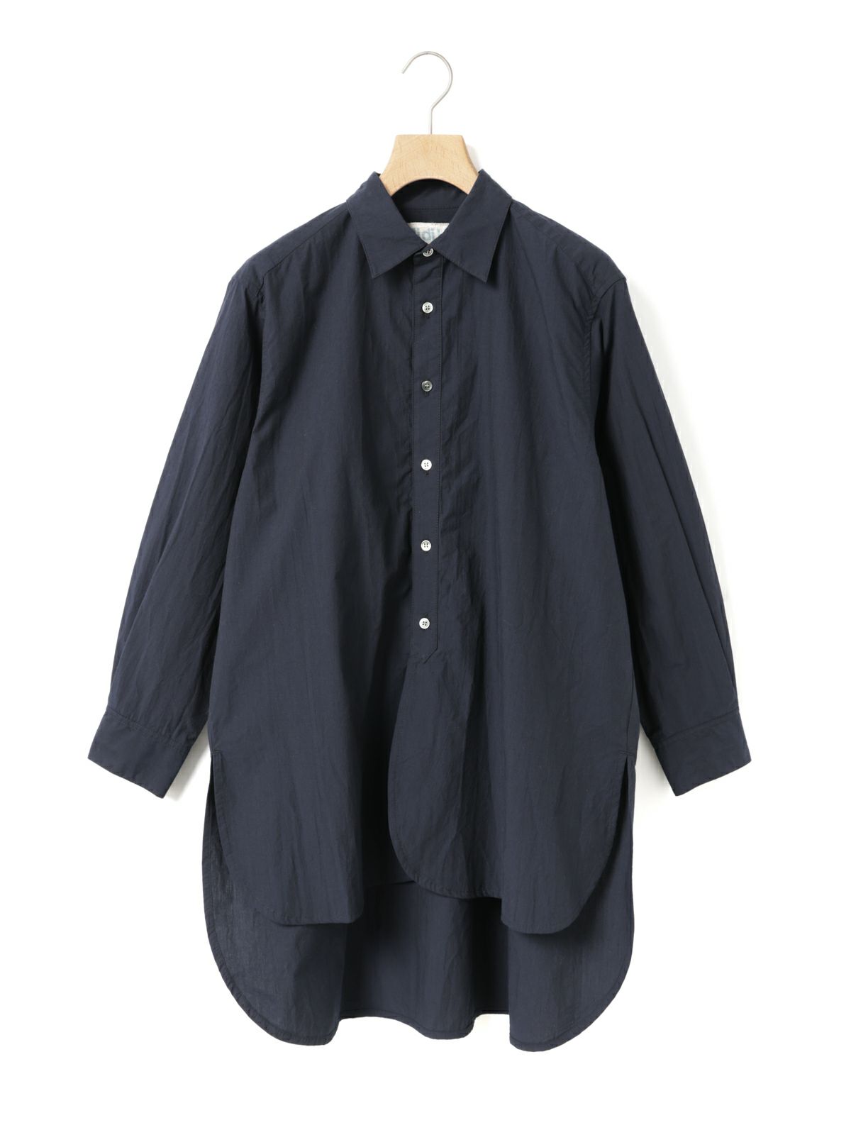 高密度に織られたタイプライター生地を使用したワイドロングシャツです。播州でワッシャー加工を施し、ヴィンテージライクに仕上げました。シャツカラーのドレスシャツで大きく前後差を付けた特徴的なデザインになっています。サイドスリットも深く動きのあるデザインがポイント。ボトムは細太目を気にせずコーディネートしていただけます。爽やかでベーシックな3色展開です。同シリーズ1-730087/スタンドカラービッグシャツも展開。