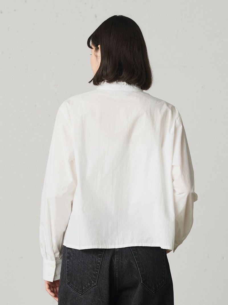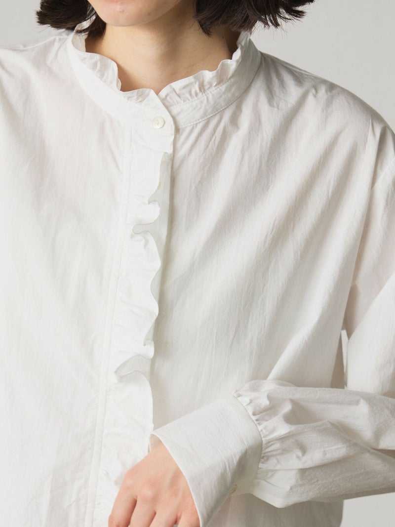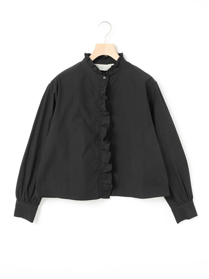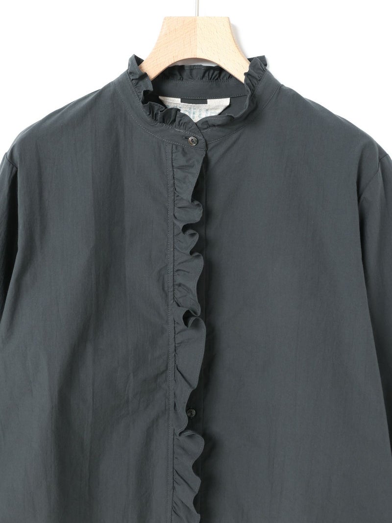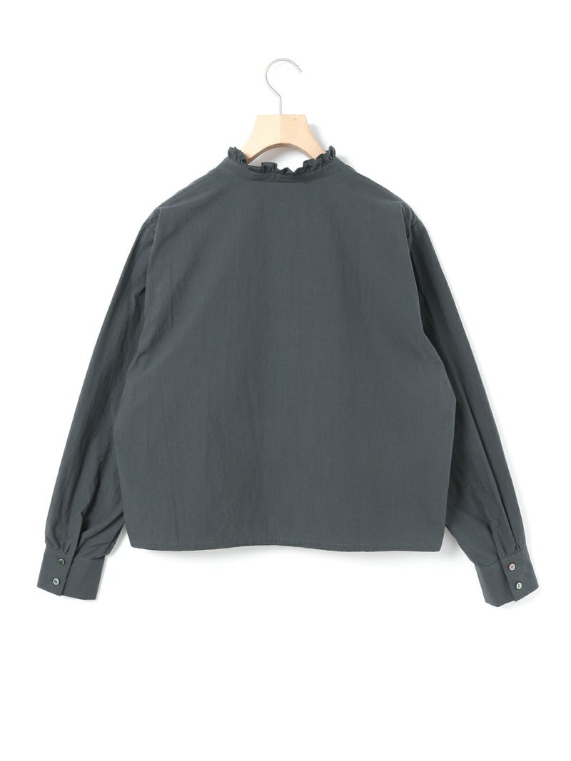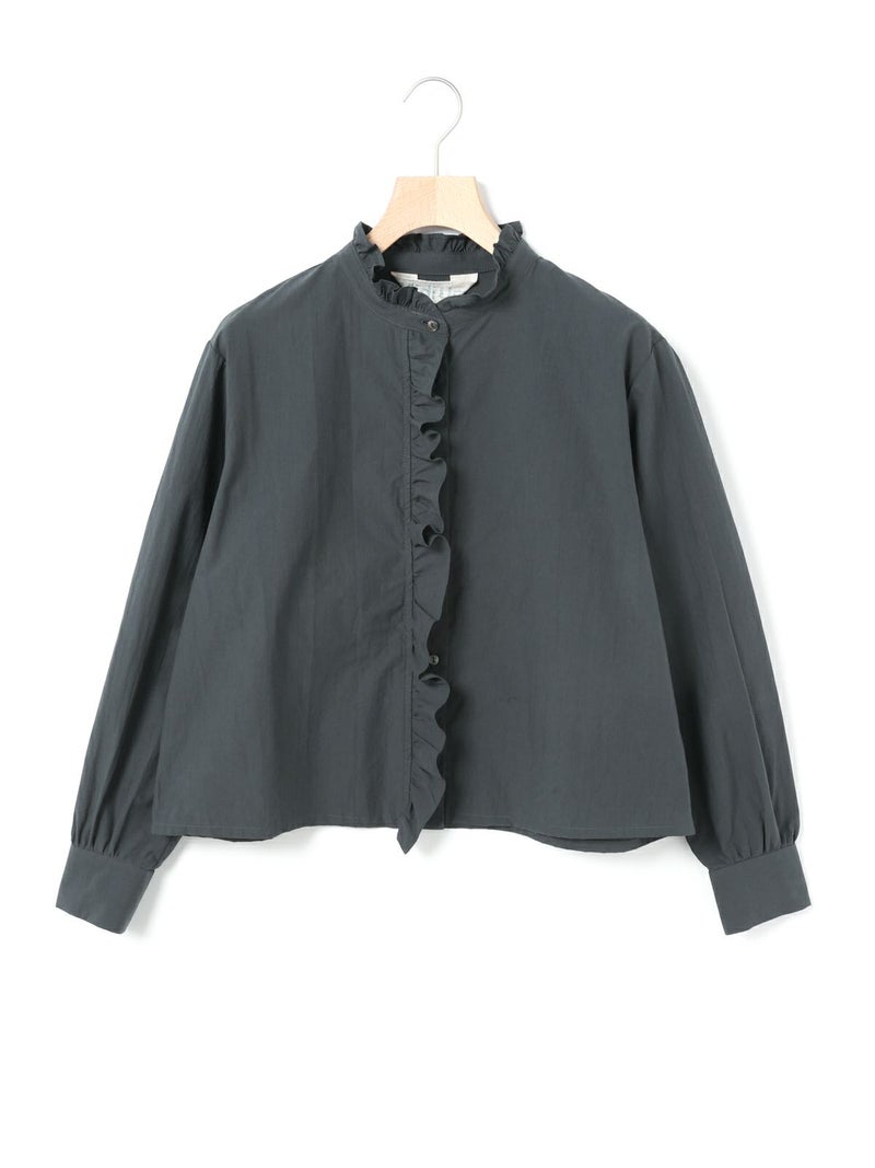 ヴィンテージライクなタイプライターを使用したフリルショートシャツです。首に沿うスタンドネックのフリルとフロントボタンの隠れるフリルをあしらった上品なデザインが特徴的。すっきりとしたショート丈でレイヤードスタイルにもお勧め。今季NEWカラーとしてライトグレーを追加しました。秋ににふさわしい落着きのある着こなしを演出します。