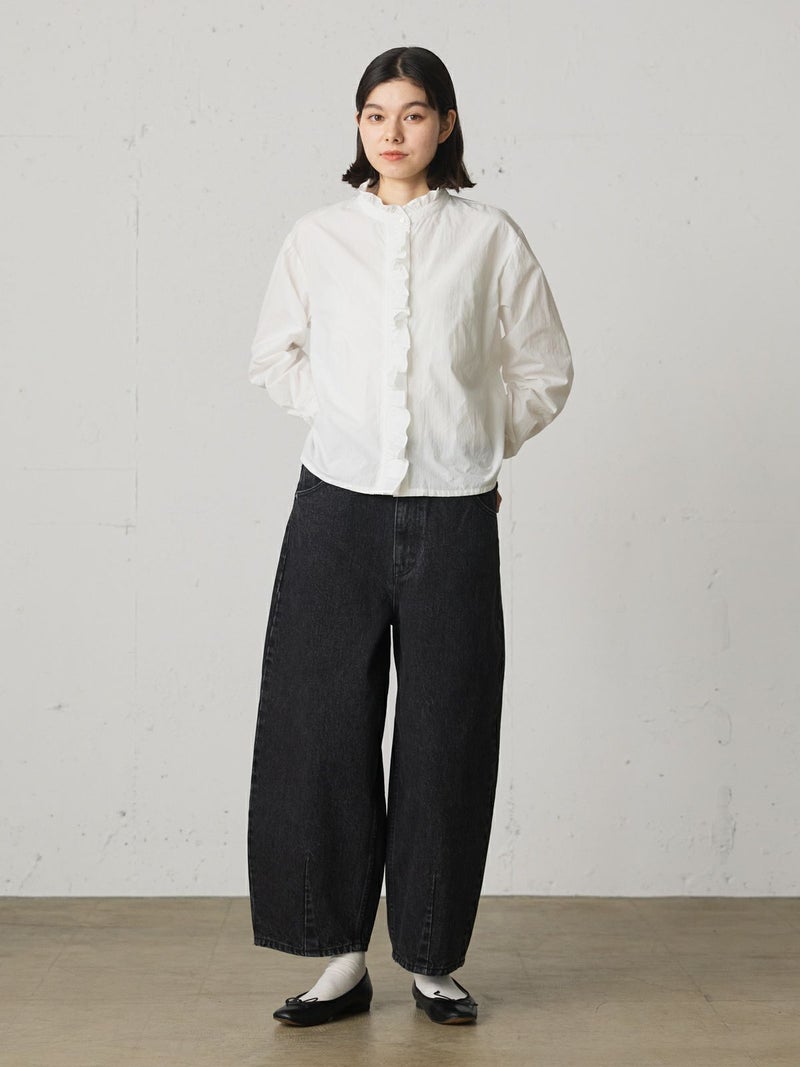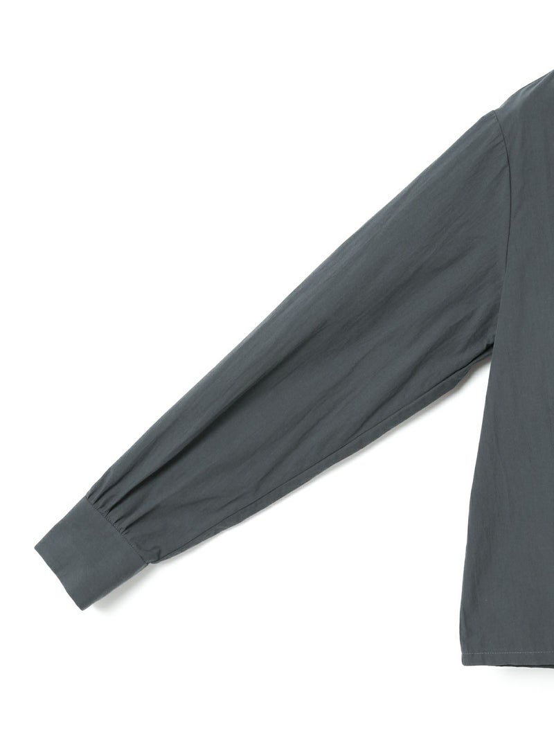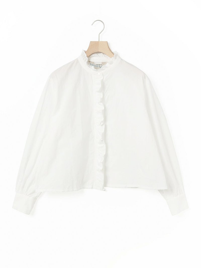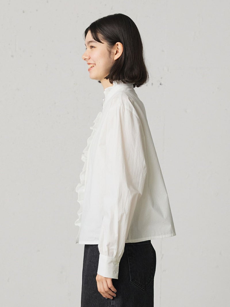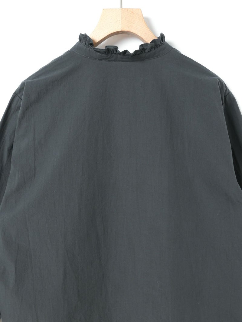 ヴィンテージライクなタイプライターを使用したフリルショートシャツです。首に沿うスタンドネックのフリルとフロントボタンの隠れるフリルをあしらった上品なデザインが特徴的。すっきりとしたショート丈でレイヤードスタイルにもお勧め。今季NEWカラーとしてライトグレーを追加しました。秋ににふさわしい落着きのある着こなしを演出します。