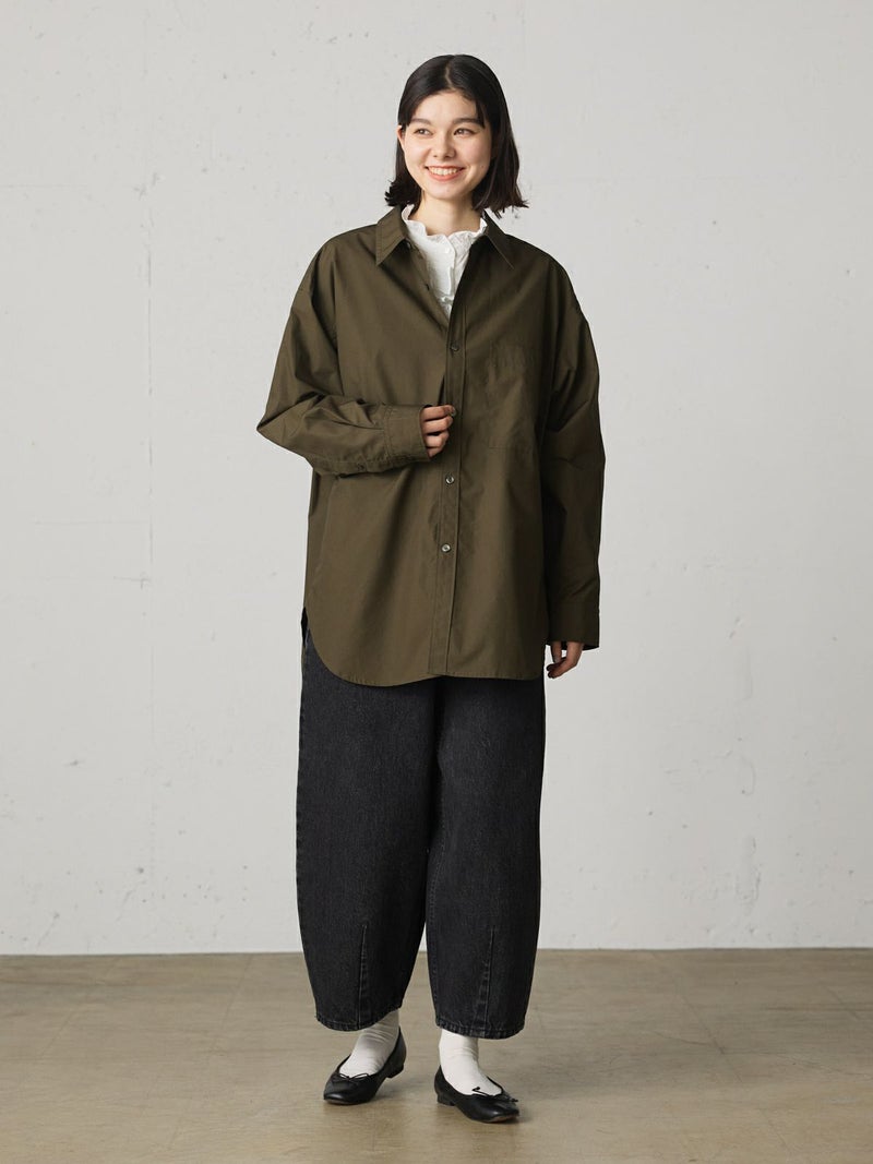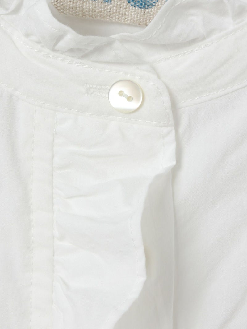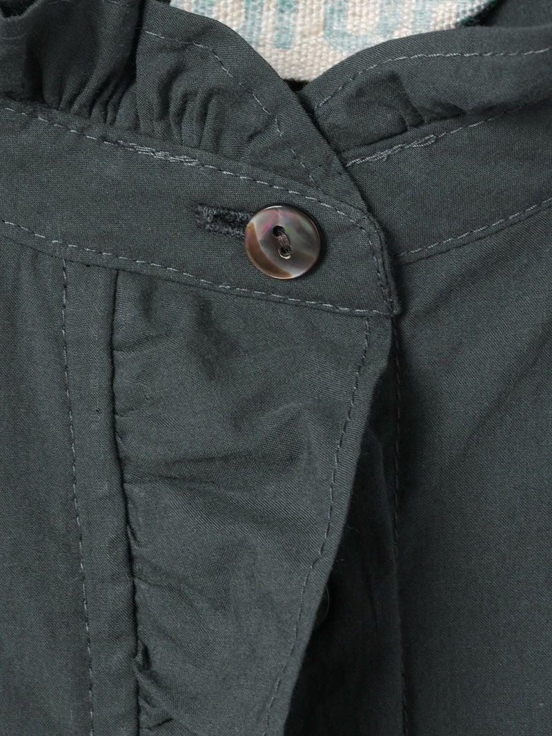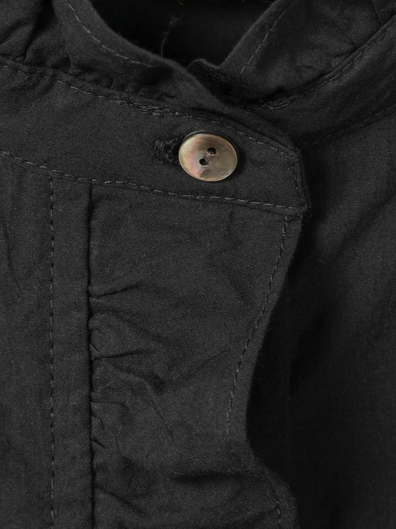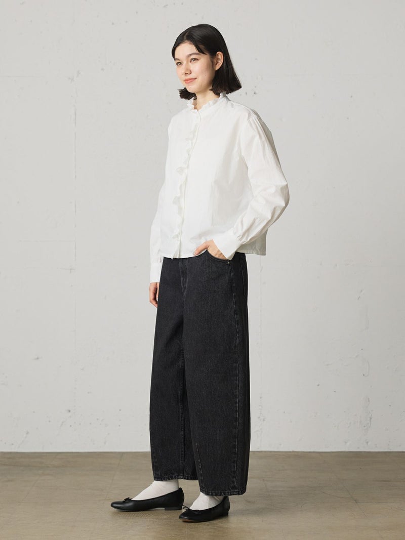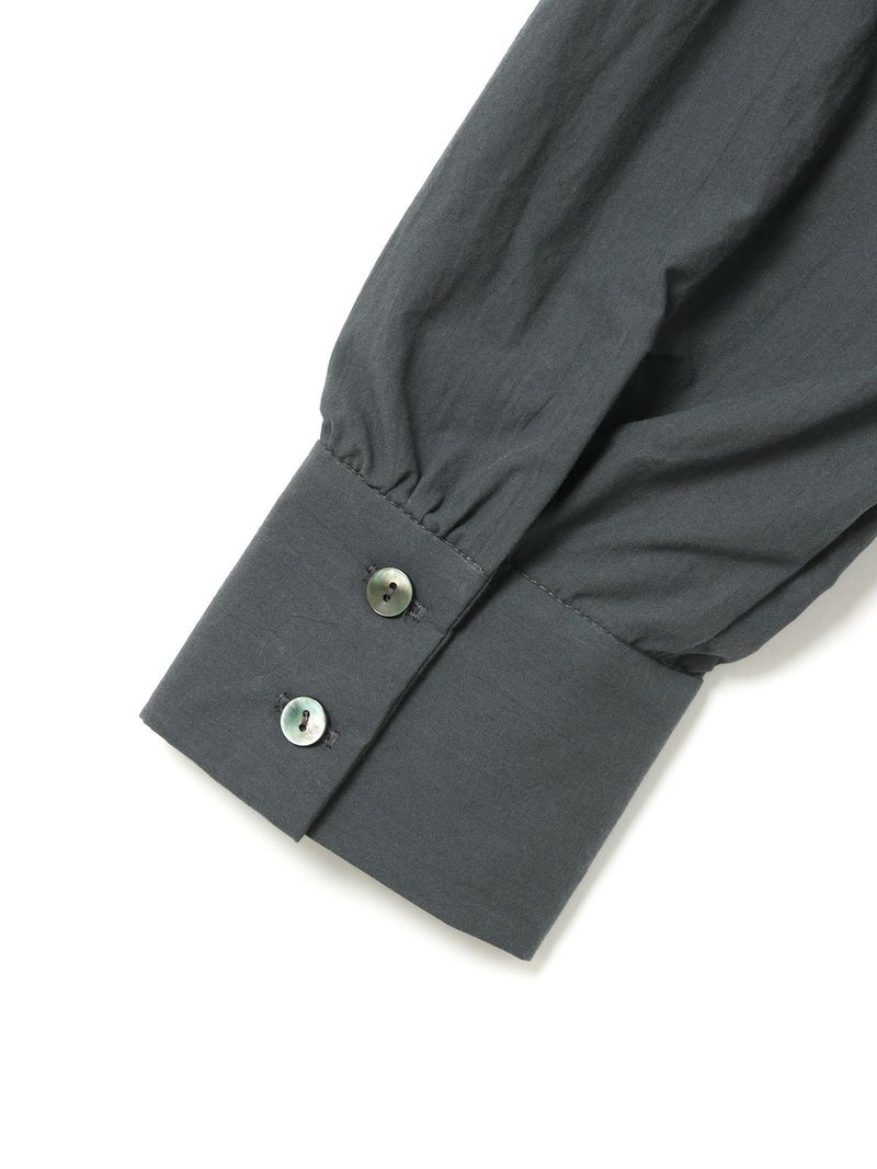 ヴィンテージライクなタイプライターを使用したフリルショートシャツです。首に沿うスタンドネックのフリルとフロントボタンの隠れるフリルをあしらった上品なデザインが特徴的。すっきりとしたショート丈でレイヤードスタイルにもお勧め。今季NEWカラーとしてライトグレーを追加しました。秋ににふさわしい落着きのある着こなしを演出します。