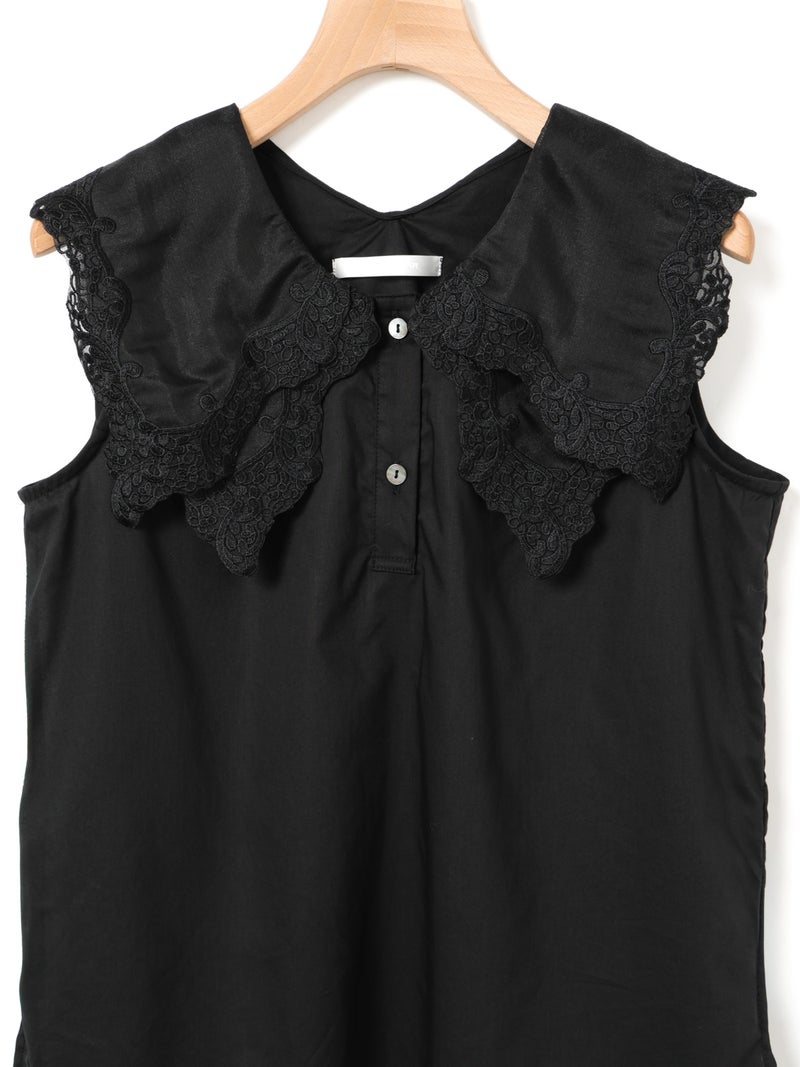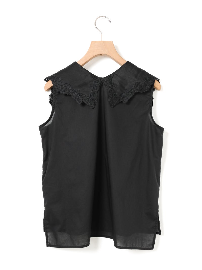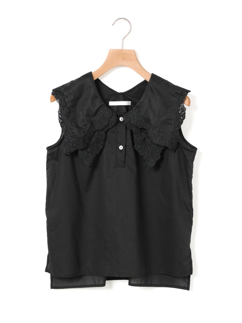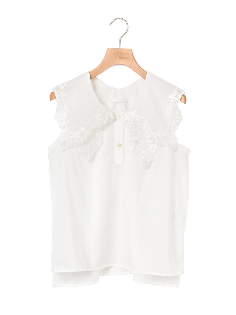 フランスのヴィンテージ古着をイメージしてデザインしたレースカラーノースリーブシャツです。透け感のある軽い素材を使用しておりフェミニンな雰囲気がありますが、カジュアルなパンツやワークを合わせるとトレンド感のあるスタイルを演出できる1枚。襟のレースが2枚重ねになっており、後ろの裾丈を少し長くしたデザインです。ノースリーブなのでロングスリーブと比べ活発さもあり、夏場も涼しく着用できます。同シリーズ1-830103/レースカラーロングスリーブシャツも展開。オフホワイトとブラックのイメージの異なる2色展開です。