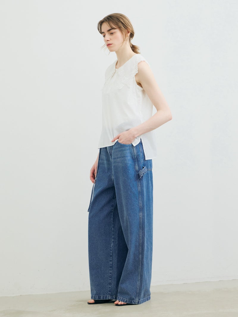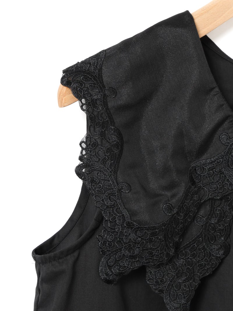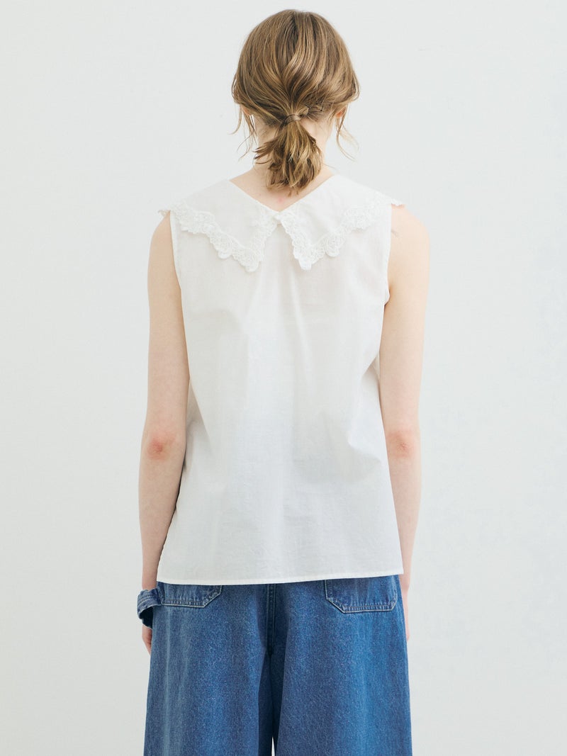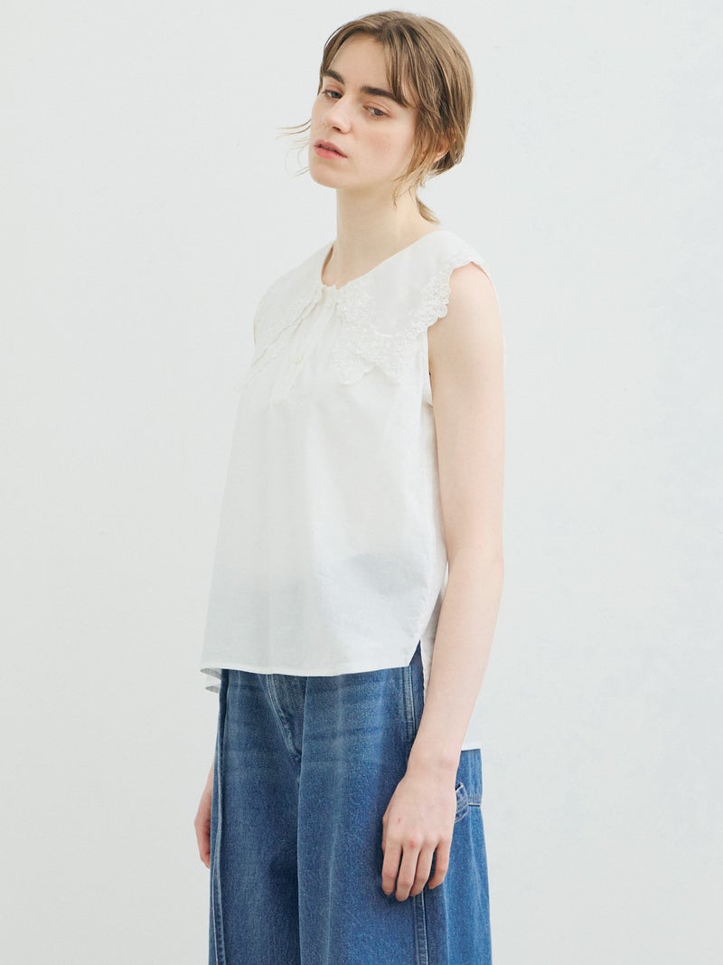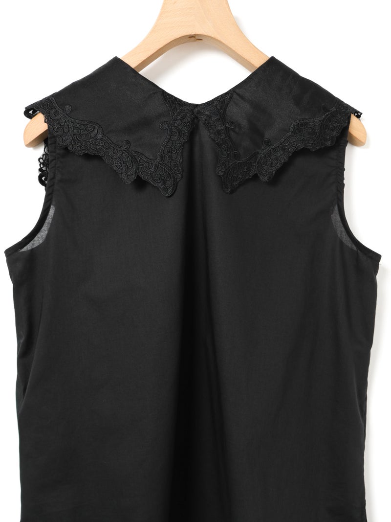 フランスのヴィンテージ古着をイメージしてデザインしたレースカラーノースリーブシャツです。透け感のある軽い素材を使用しておりフェミニンな雰囲気がありますが、カジュアルなパンツやワークを合わせるとトレンド感のあるスタイルを演出できる1枚。襟のレースが2枚重ねになっており、後ろの裾丈を少し長くしたデザインです。ノースリーブなのでロングスリーブと比べ活発さもあり、夏場も涼しく着用できます。同シリーズ1-830103/レースカラーロングスリーブシャツも展開。オフホワイトとブラックのイメージの異なる2色展開です。