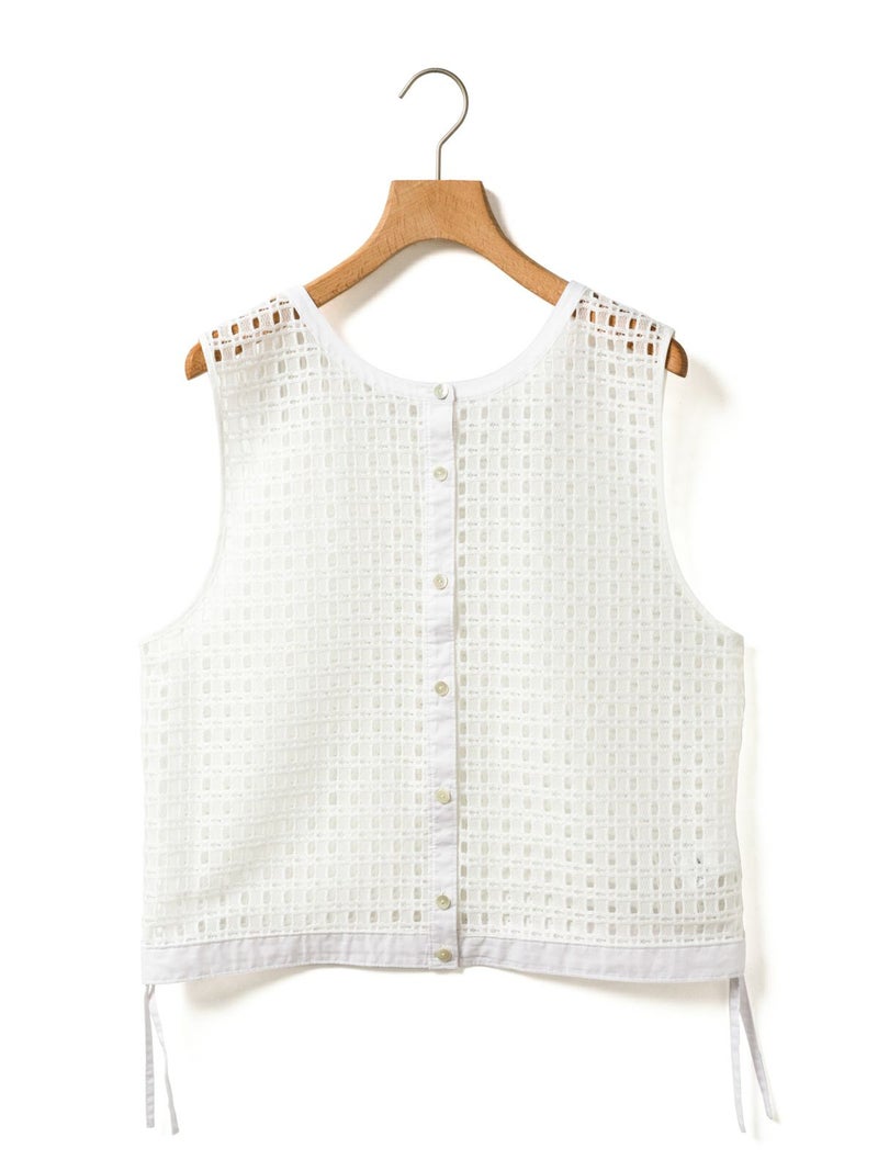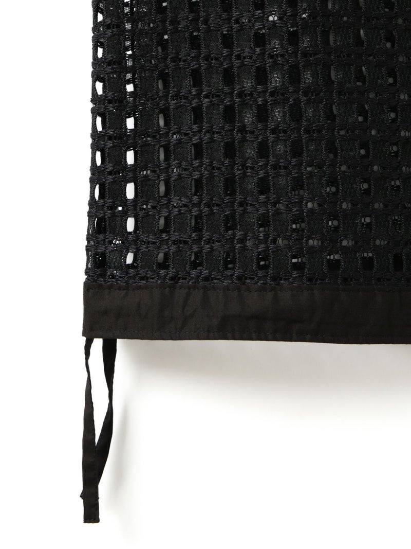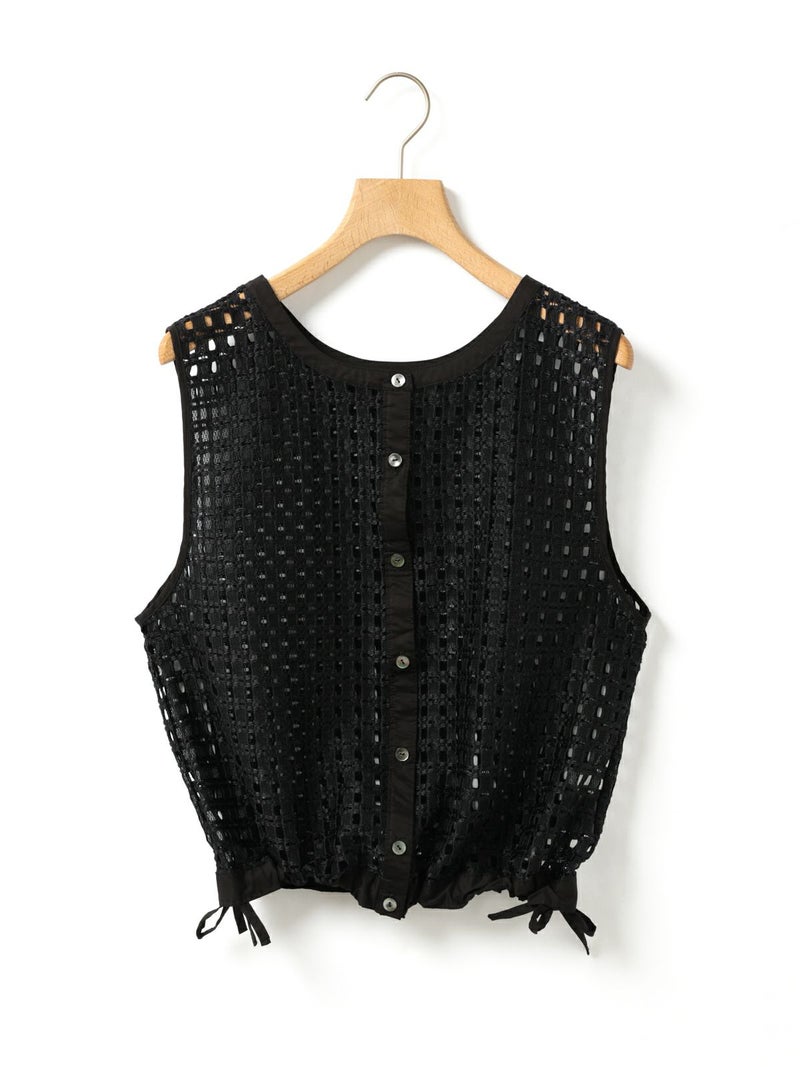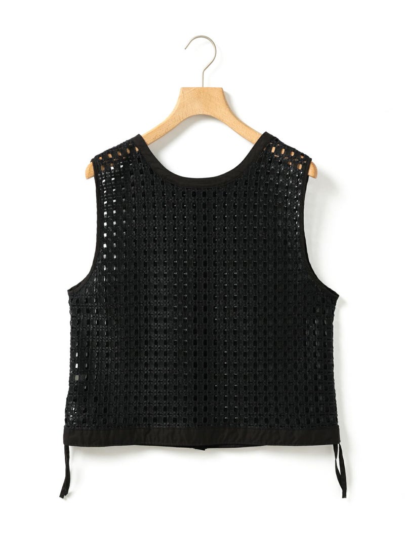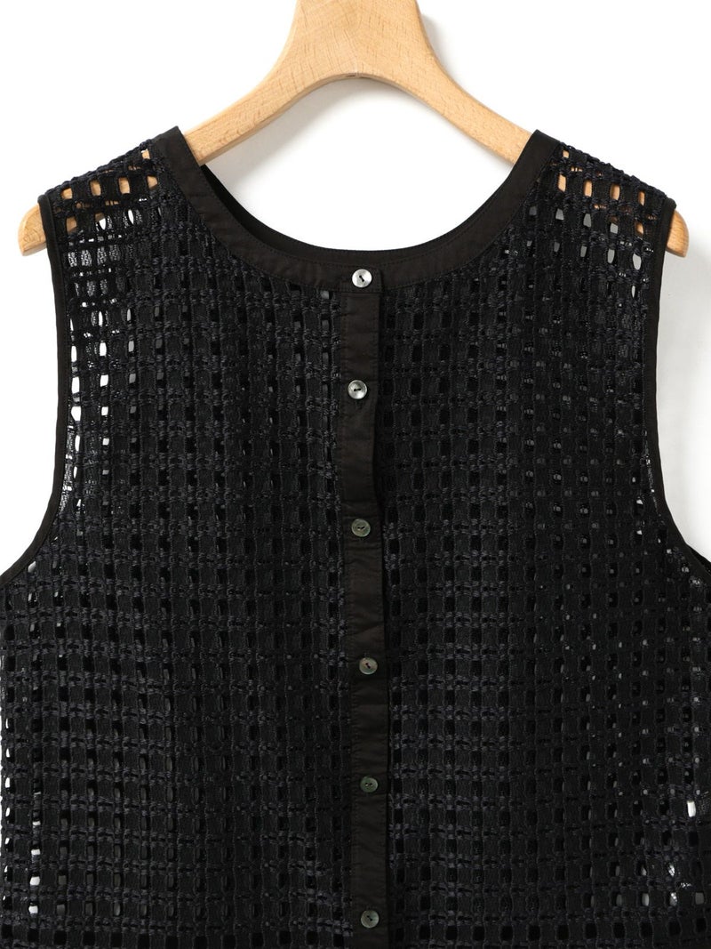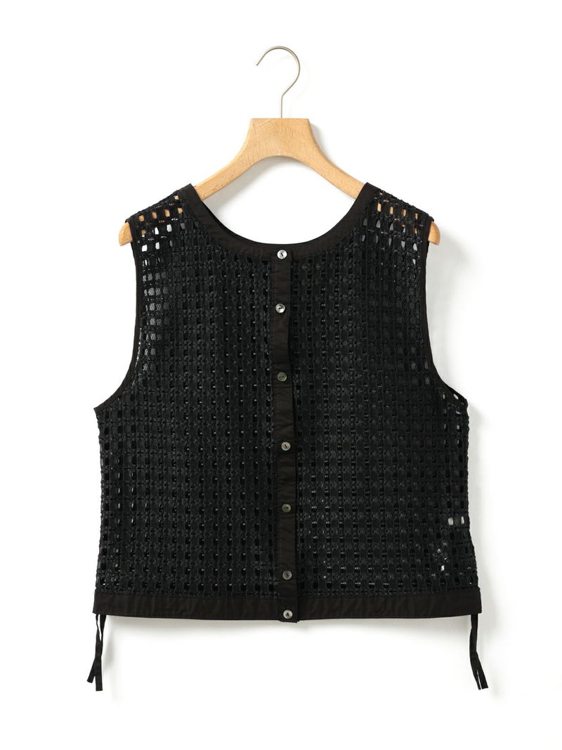 張りのあるメッシュのレース生地を使用したメッシュレースドローストリングベストです。ドライタッチメッシュのレースなので甘すぎずモードに着用していただけます。イージーケアのシアーで取り扱いのしやすい1枚。前後どちらでも着れるのでコーディネートの幅が広く、前開きでもOK。ボタンを後ろにして一番上のボタンだけ留めて重ね着を楽しんでみても素敵です。サイドの裾紐を絞ってコンパクトにメリハリのある着こなしもお勧めです。同素材で仕上げた1-830105/メッシュレースボックスシャツも展開。