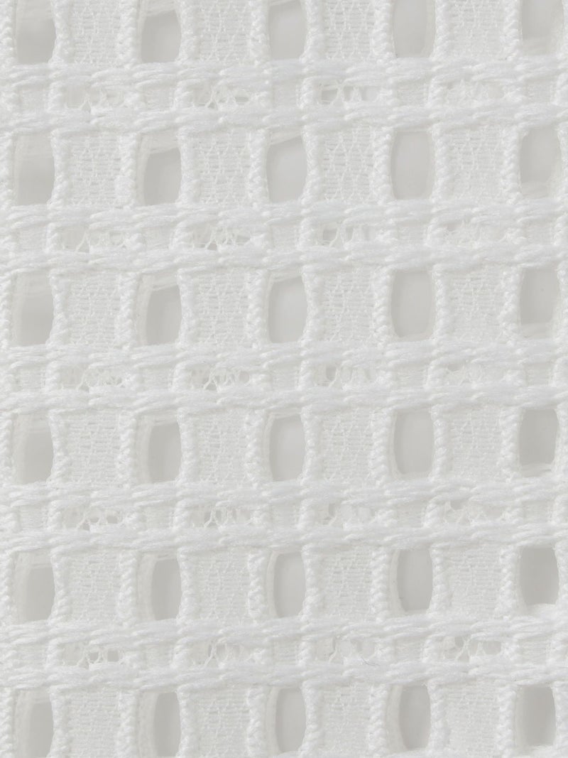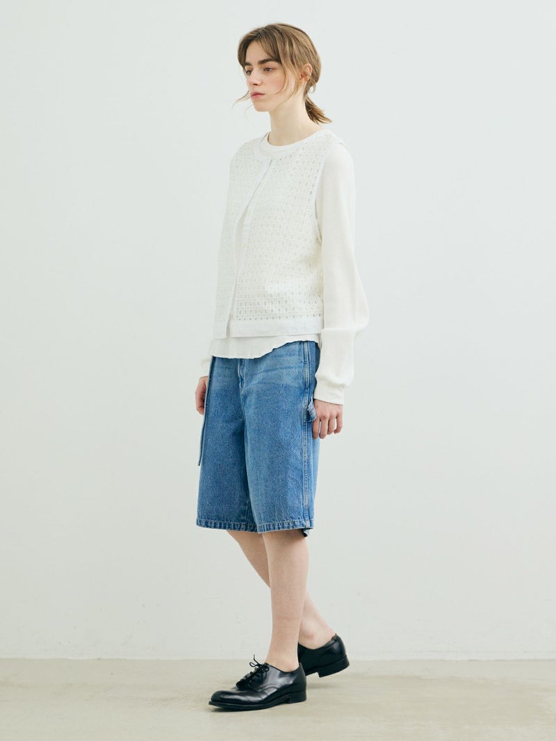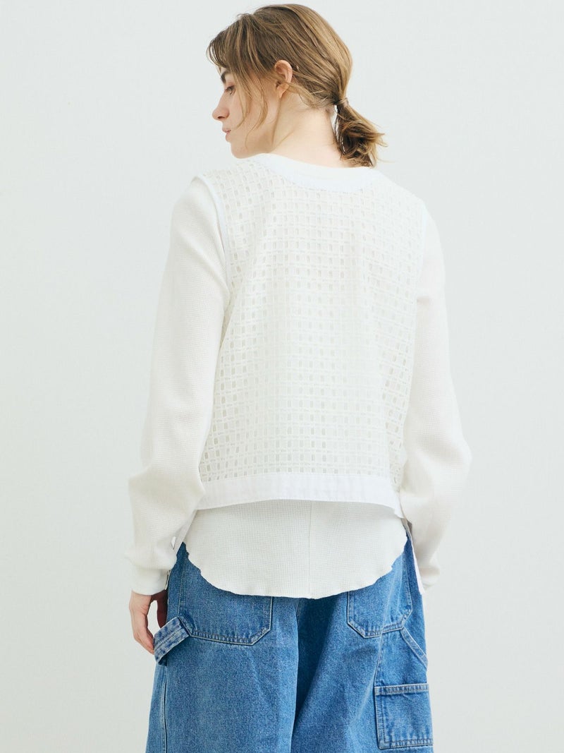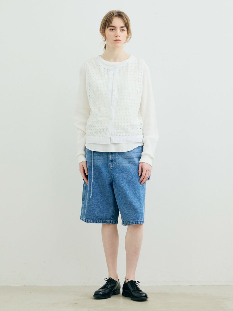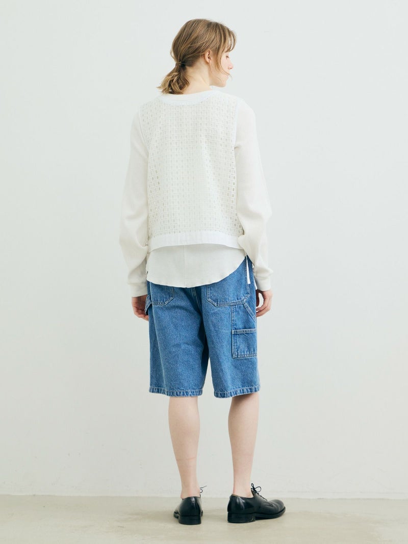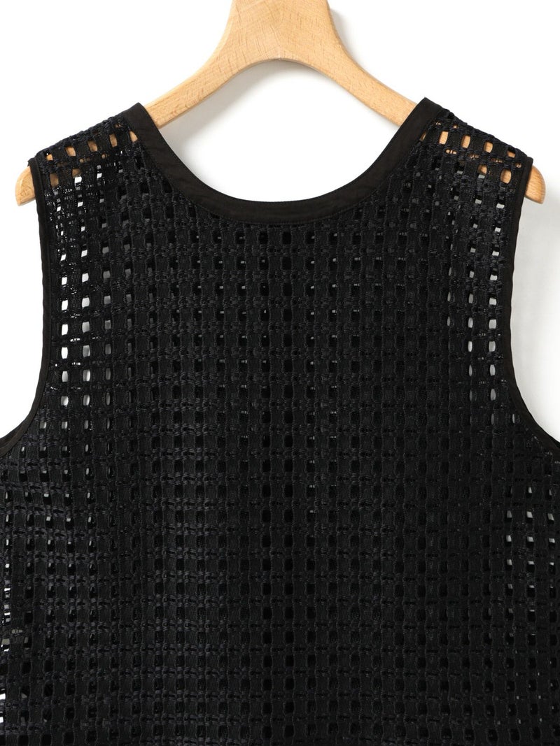 張りのあるメッシュのレース生地を使用したメッシュレースドローストリングベストです。ドライタッチメッシュのレースなので甘すぎずモードに着用していただけます。イージーケアのシアーで取り扱いのしやすい1枚。前後どちらでも着れるのでコーディネートの幅が広く、前開きでもOK。ボタンを後ろにして一番上のボタンだけ留めて重ね着を楽しんでみても素敵です。サイドの裾紐を絞ってコンパクトにメリハリのある着こなしもお勧めです。同素材で仕上げた1-830105/メッシュレースボックスシャツも展開。