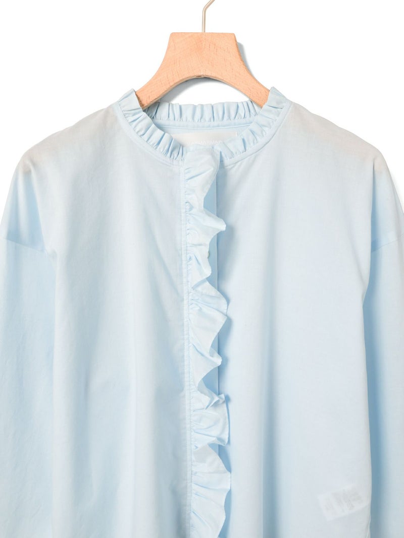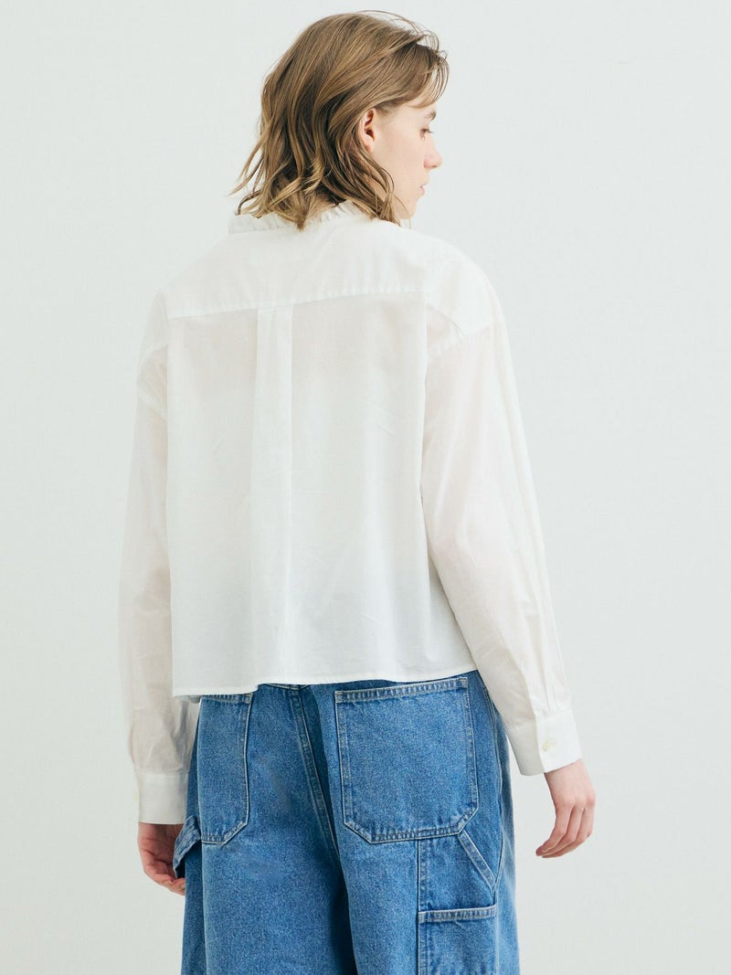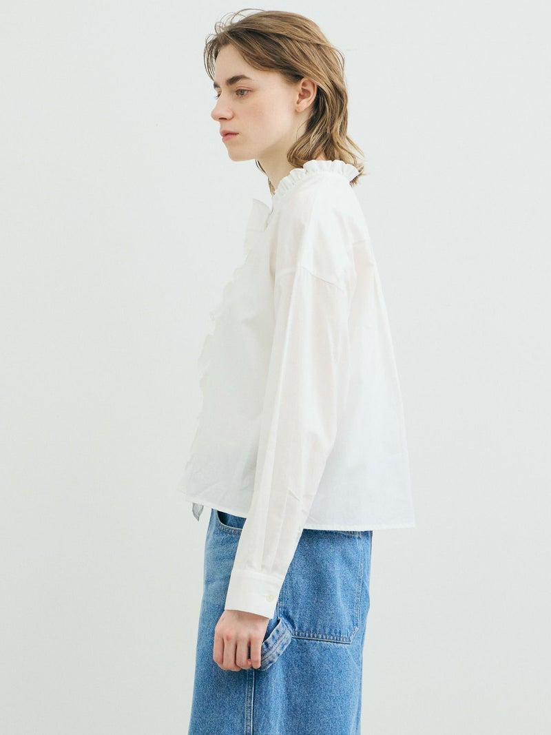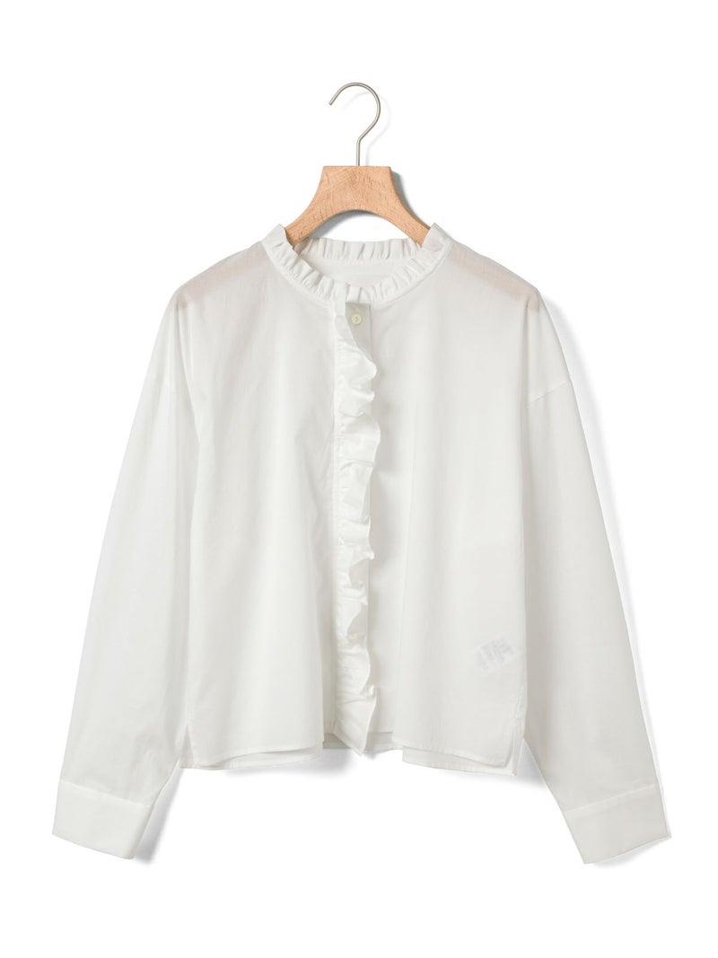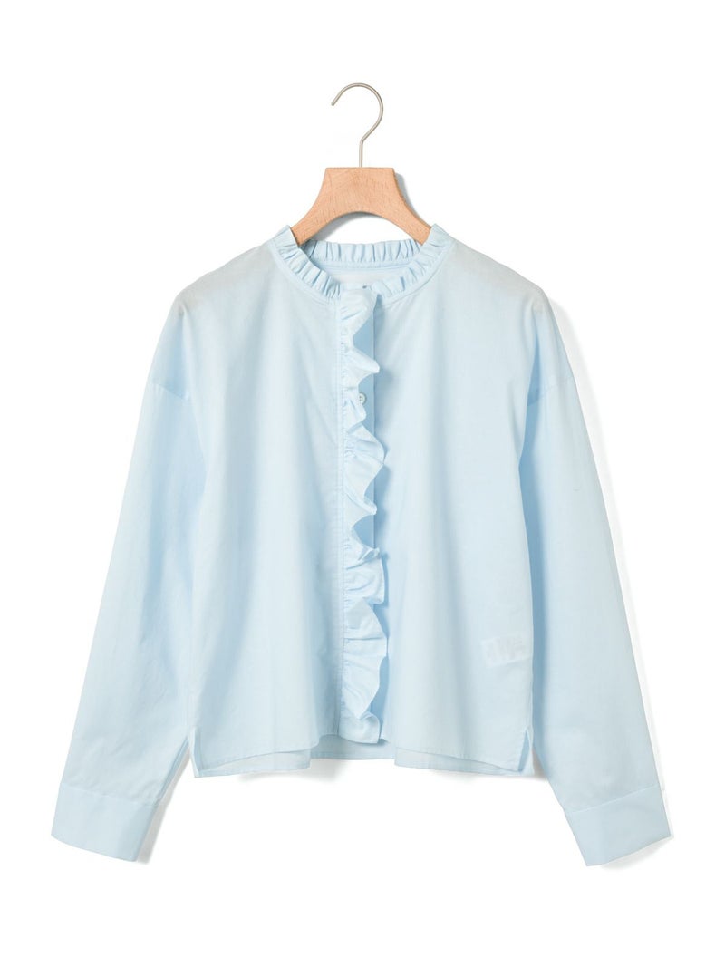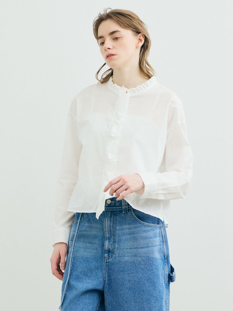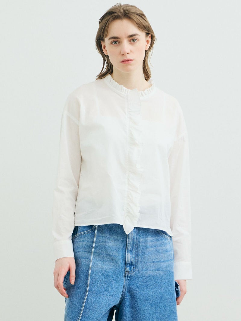 フランスのヴィンテージ古着をイメージしてデザインしたフリルカラーシャツです。透け感のある軽い素材が特徴。カジュアルなパンツ、ワークで合わせるとトレンド感がでて素敵にコーディネートができます。ボタンを隠す比翼仕様で上品なフロントデザインを表現。インナー使いとして重ね着にもお勧めで、春先には1枚で清楚な着こなしを印象付けます。