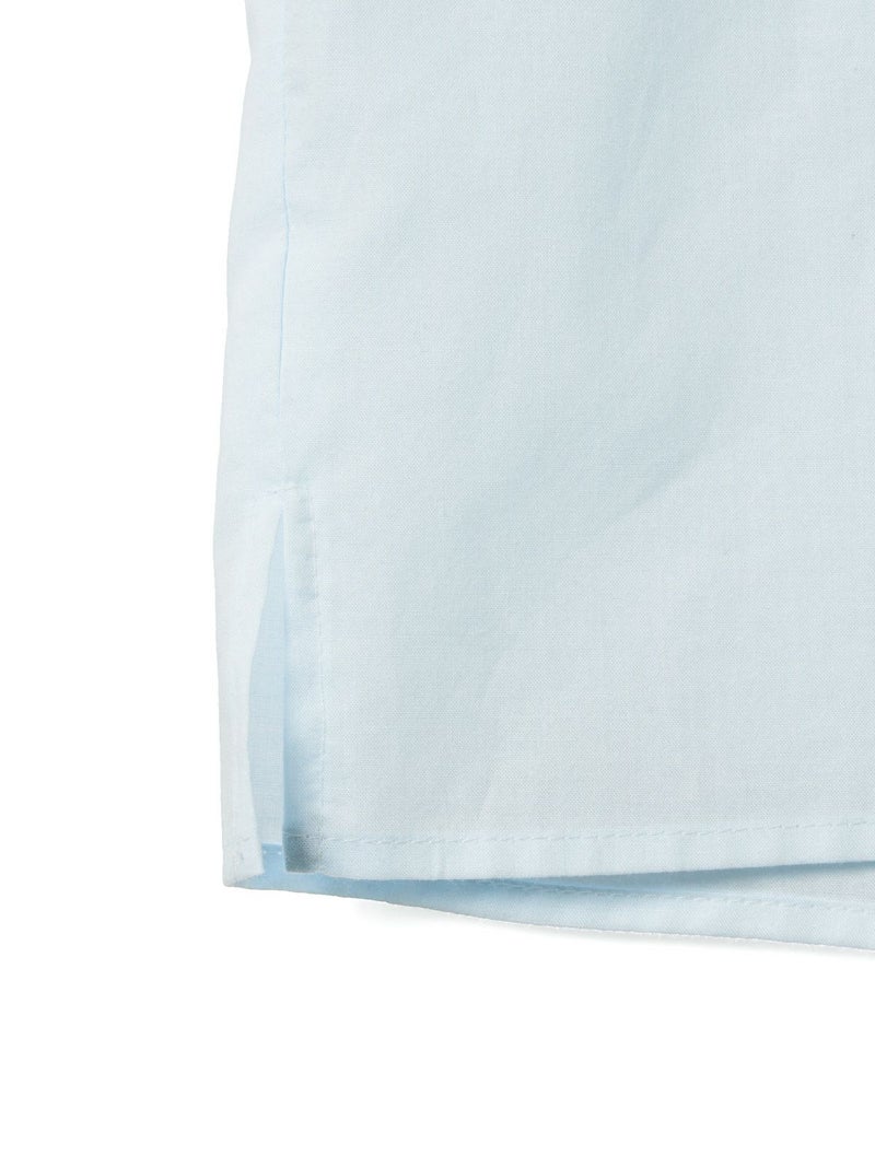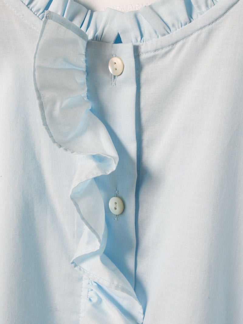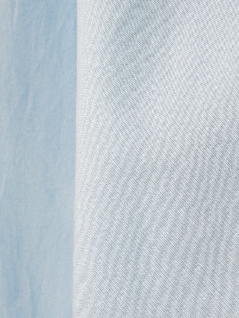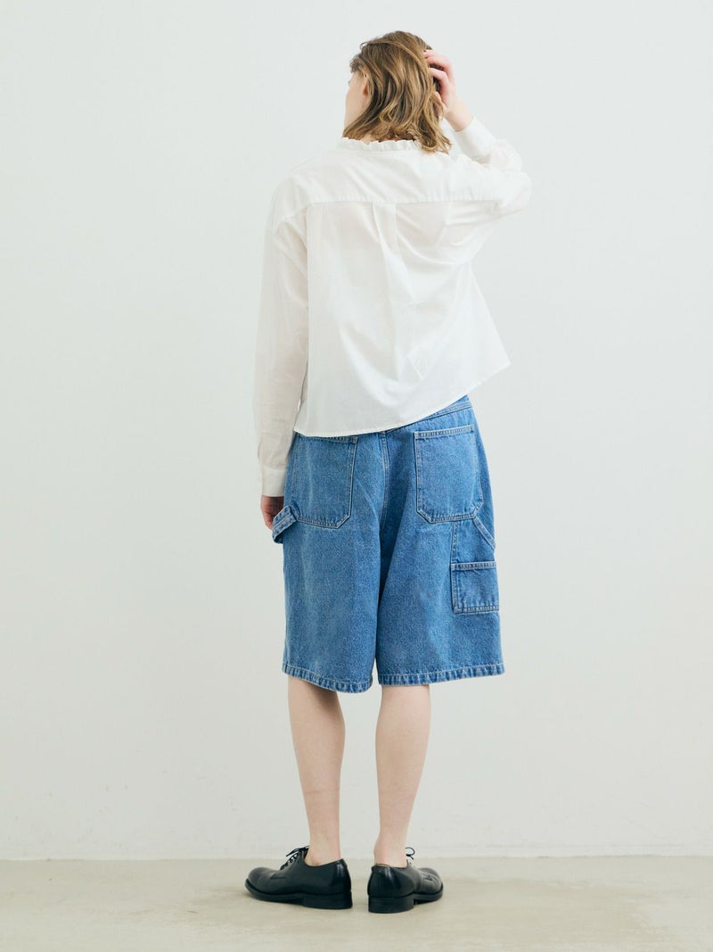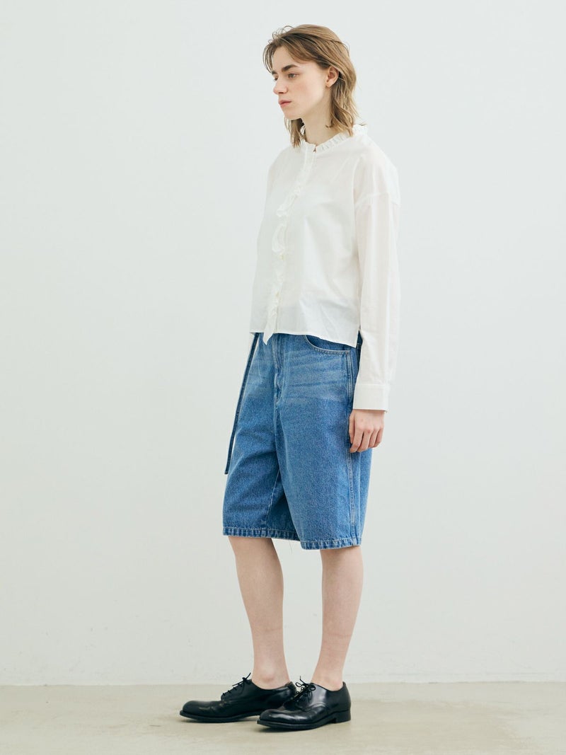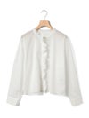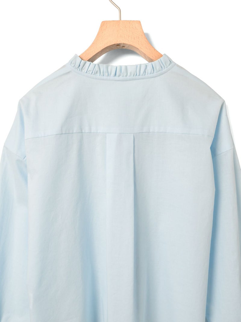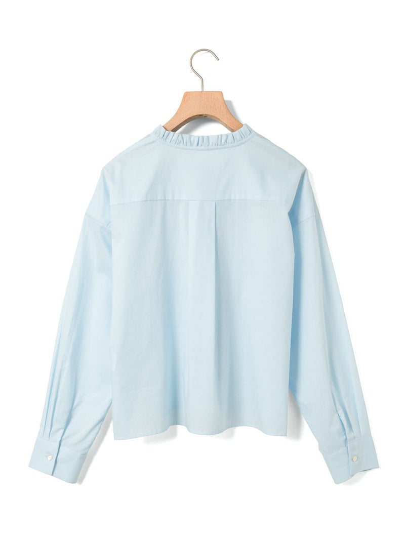 フランスのヴィンテージ古着をイメージしてデザインしたフリルカラーシャツです。透け感のある軽い素材が特徴。カジュアルなパンツ、ワークで合わせるとトレンド感がでて素敵にコーディネートができます。ボタンを隠す比翼仕様で上品なフロントデザインを表現。インナー使いとして重ね着にもお勧めで、春先には1枚で清楚な着こなしを印象付けます。