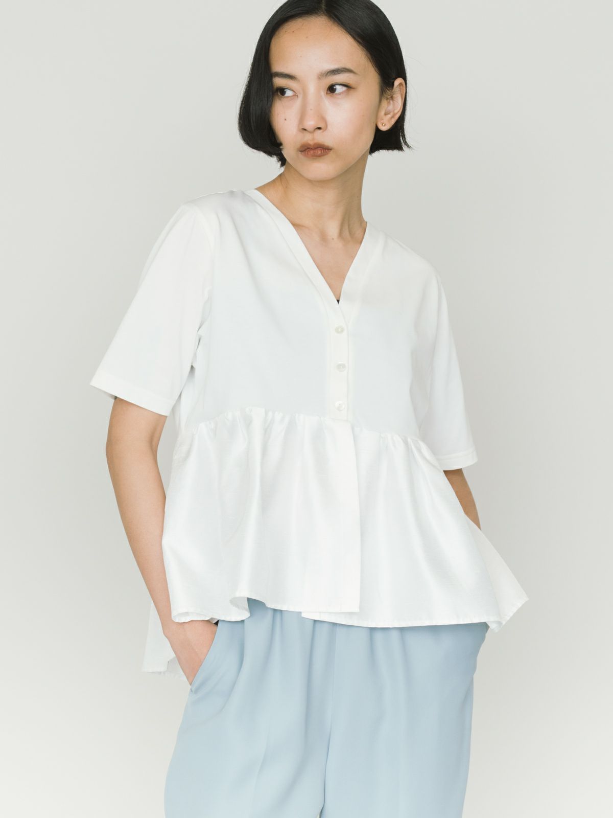 2WAYの着こなしが可能なウーブン切り替え2WAYペプラムが再入荷しました。トップはキレイ目カットソーと胸下からサテン生地に切り替えを施したモード感のあるギャザーをフレア風に工夫した女性らしいデザインを演出。前開きでカーディガン使用にできる着こなしとプルオーバーシルエットを表現しており、オシャレの幅が広いアイテムになっています。着回しのきく3色展開です。