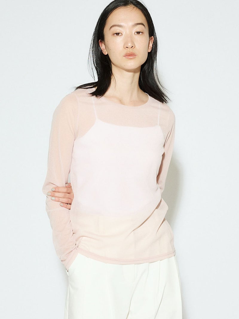 4WAYストレッチのジョーゼット素材でデザインしたシアープルオーバーです。表面に表情のある生地感が特徴で軽やかで着心地の良さを体感していただけます。使いやすいサイジングのシンプルなデザインなのでインナー使いでも1枚でも着こなせるアイテムです。きれいなピンクを差し色にしています。ブラウンはブラックに近いシックなカラーに仕上がっています。人気のシアーアイテムとして着回しのきく1枚です。