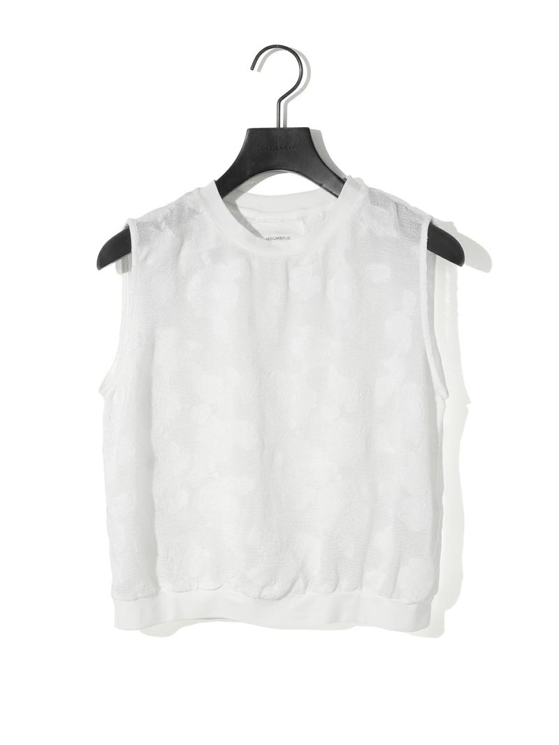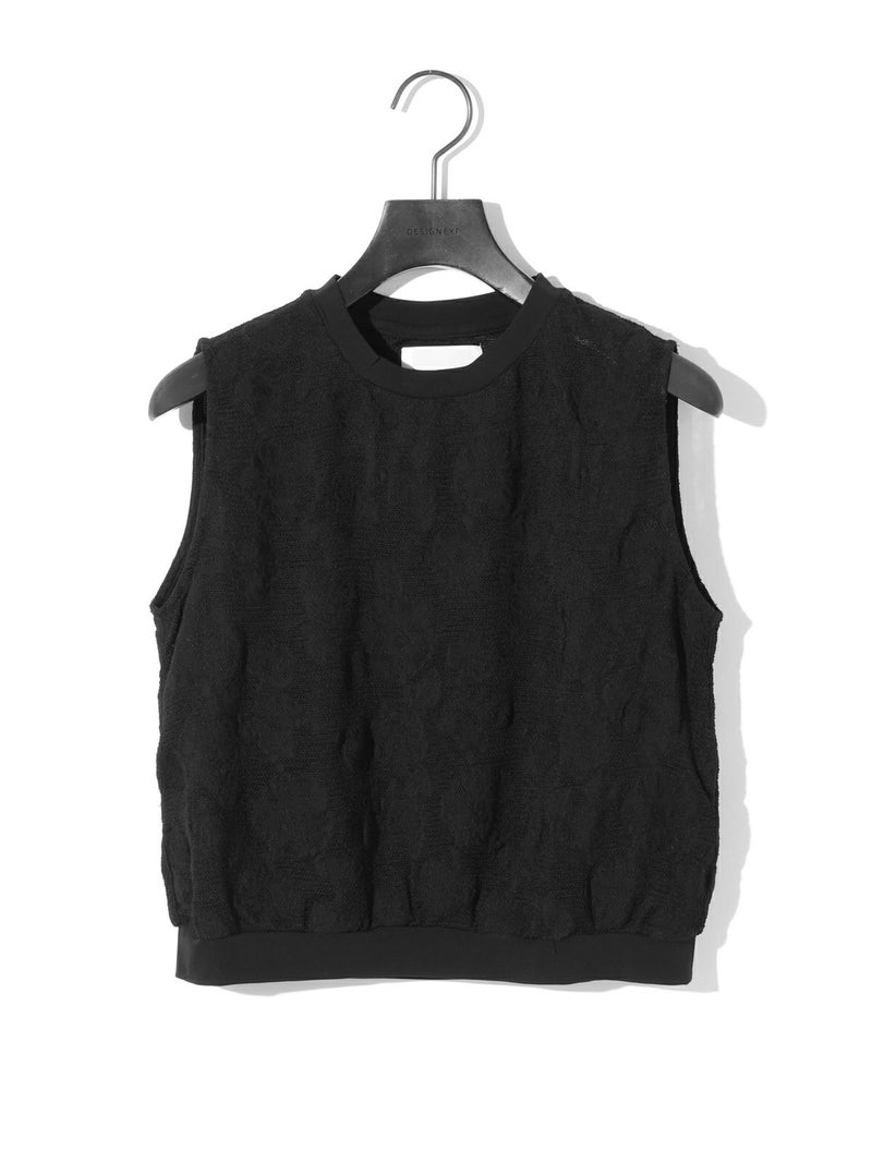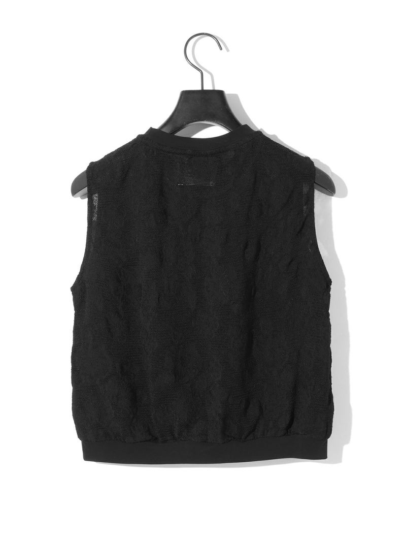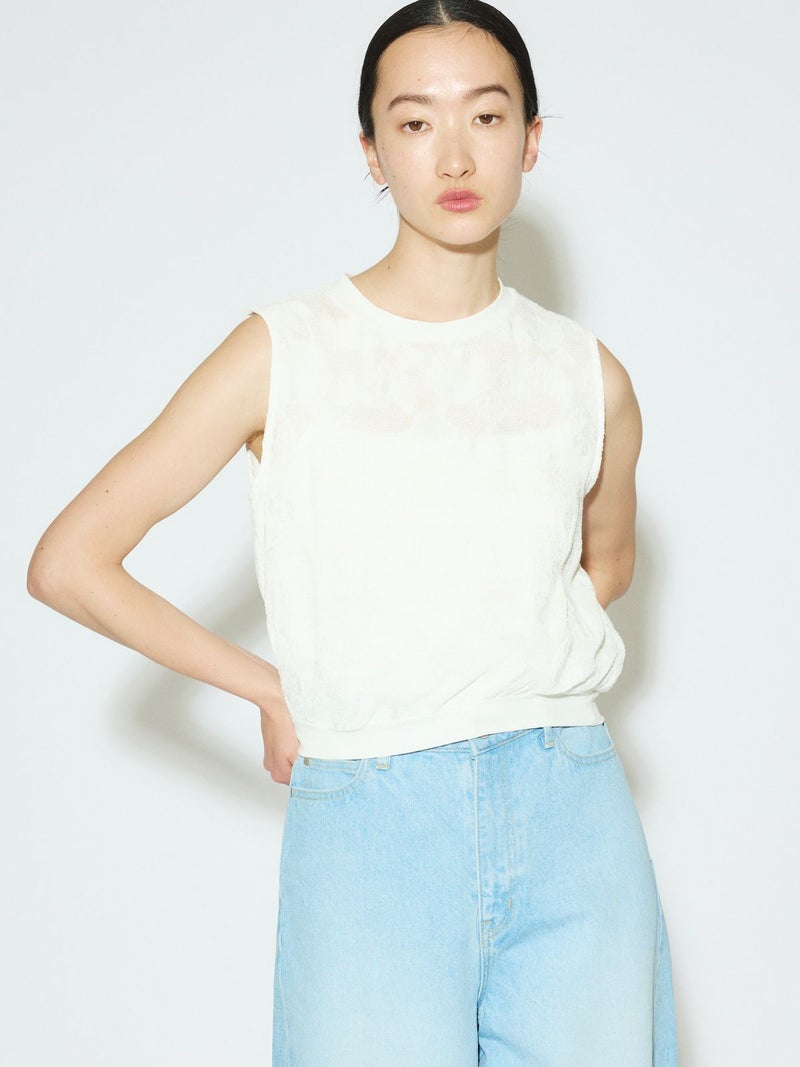 カットジャガードのレースが目をひく、華やかさのあるトップス。リング糸を使ったメッシュ地に、花モチーフを裏からジャガードで織り出した、手の込んだデザインが魅力です。コンパクトなシルエットで、ノースリーブとしてもインナーとしても活躍。首元と裾にはリブをあしらいほどよくカジュアルなバランスに仕上げました。キュプラ混の素材で、やさしい光沢感と上品な雰囲気をお楽しみいただけます。