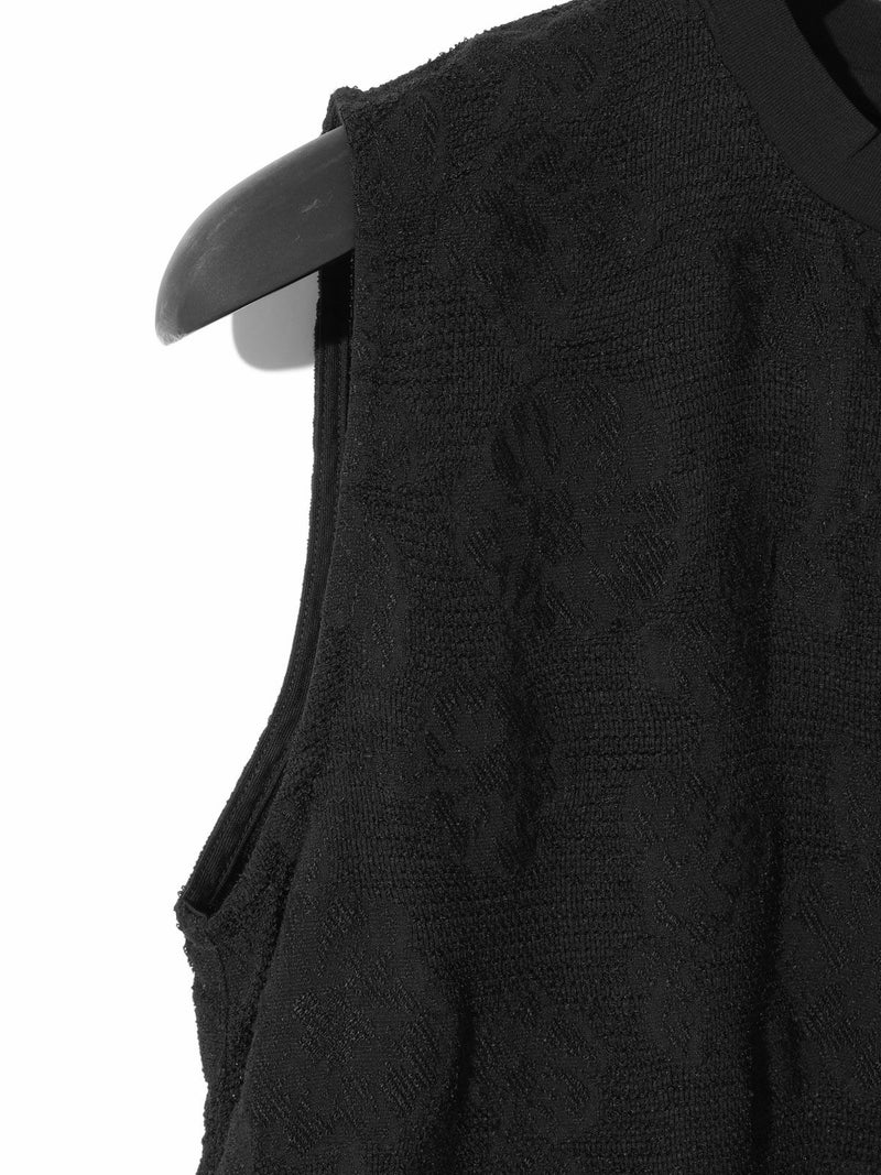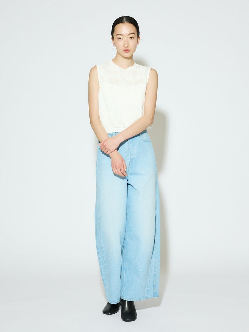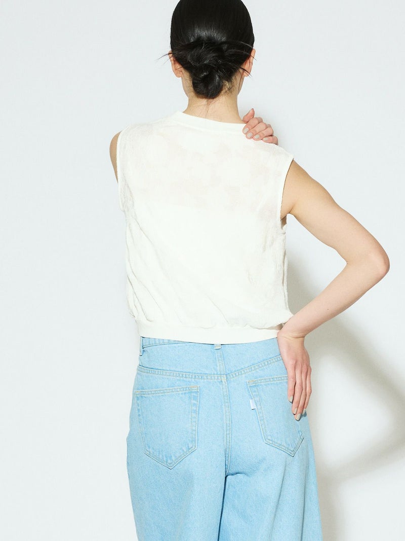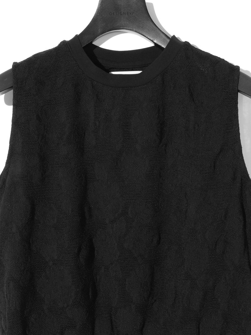 カットジャガードのレースが目をひく、華やかさのあるトップス。リング糸を使ったメッシュ地に、花モチーフを裏からジャガードで織り出した、手の込んだデザインが魅力です。コンパクトなシルエットで、ノースリーブとしてもインナーとしても活躍。首元と裾にはリブをあしらいほどよくカジュアルなバランスに仕上げました。キュプラ混の素材で、やさしい光沢感と上品な雰囲気をお楽しみいただけます。