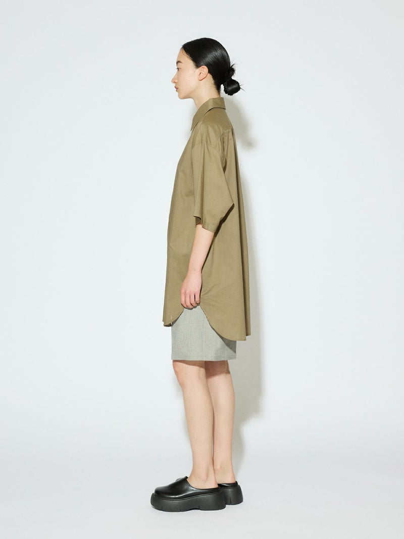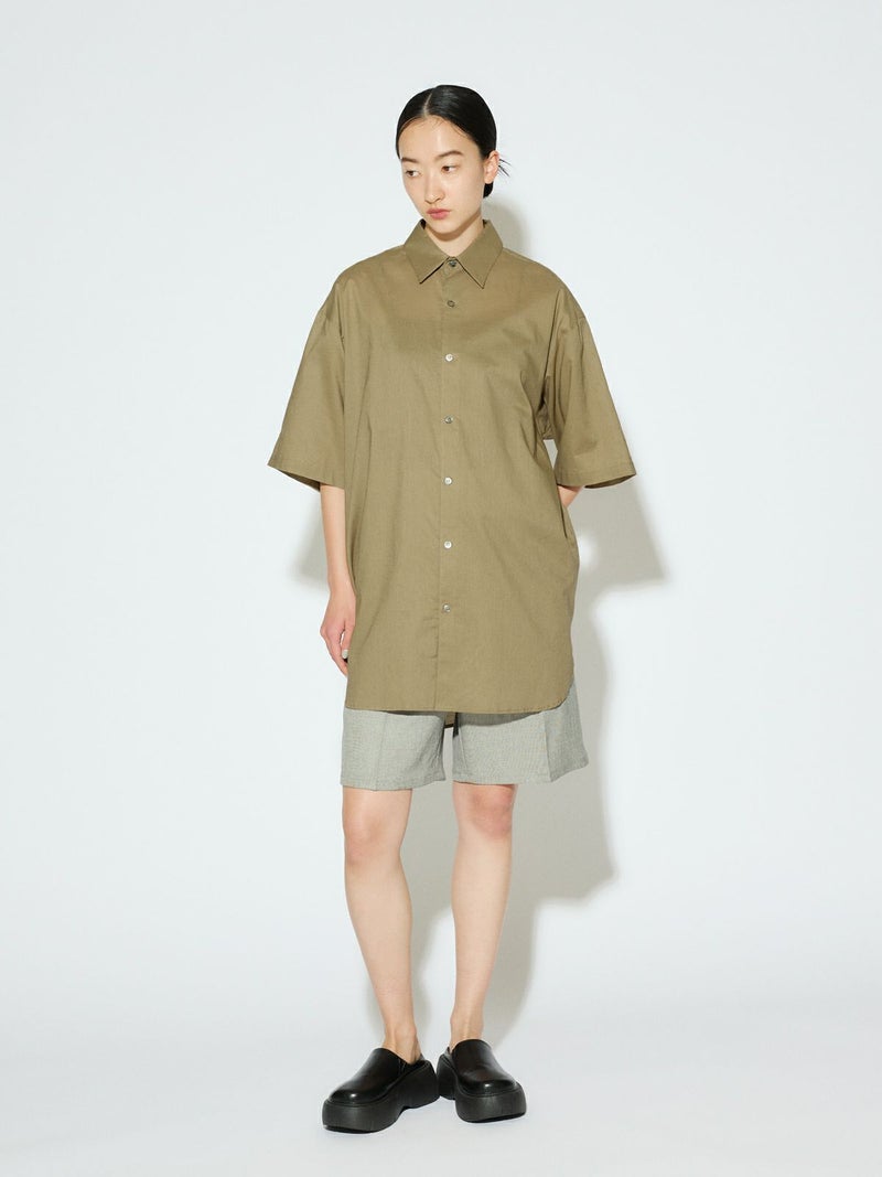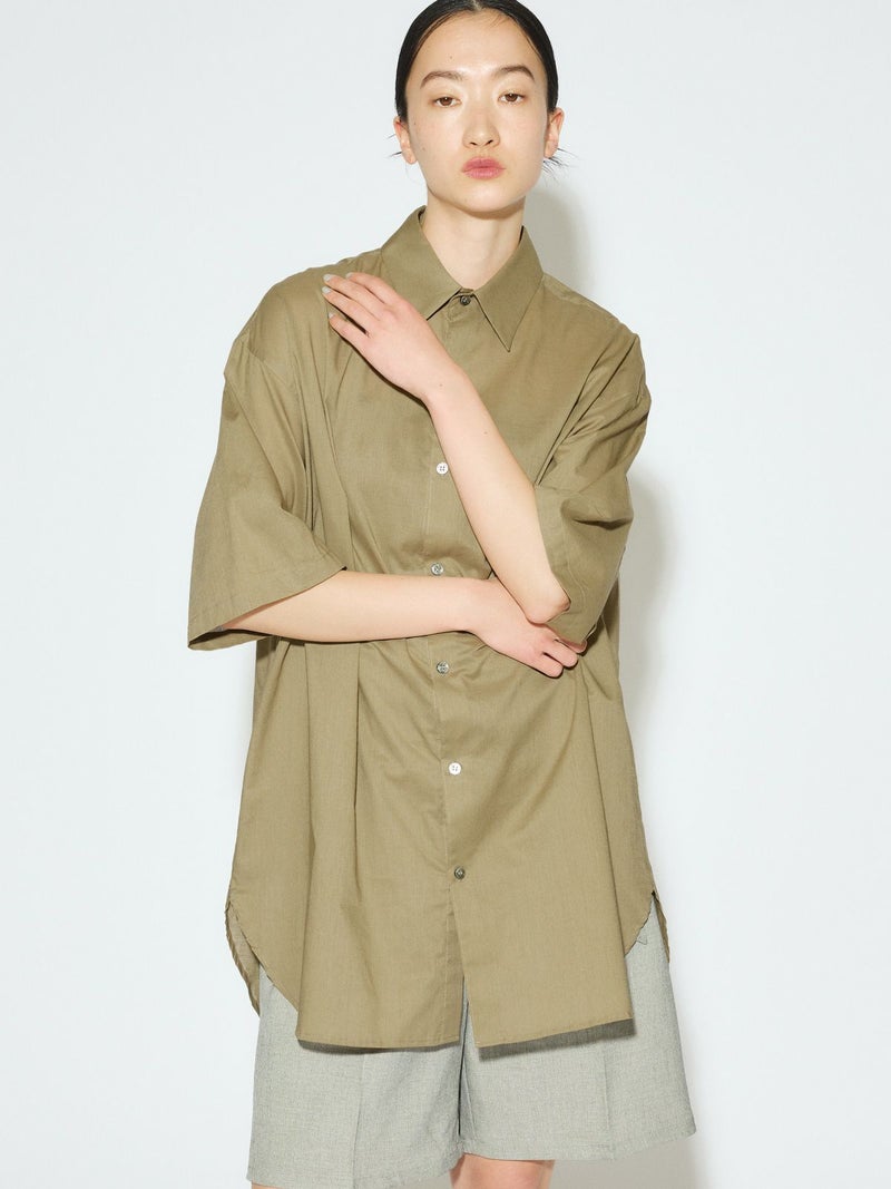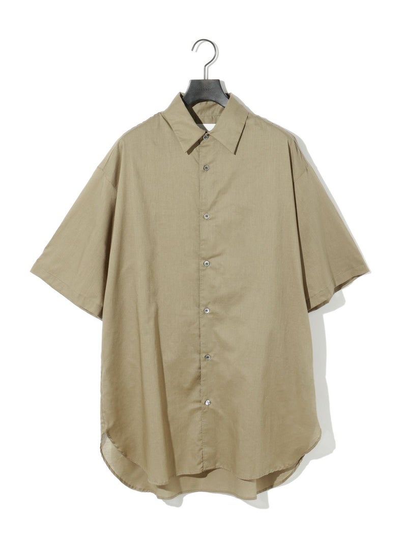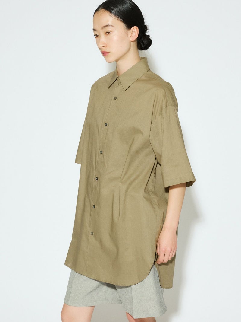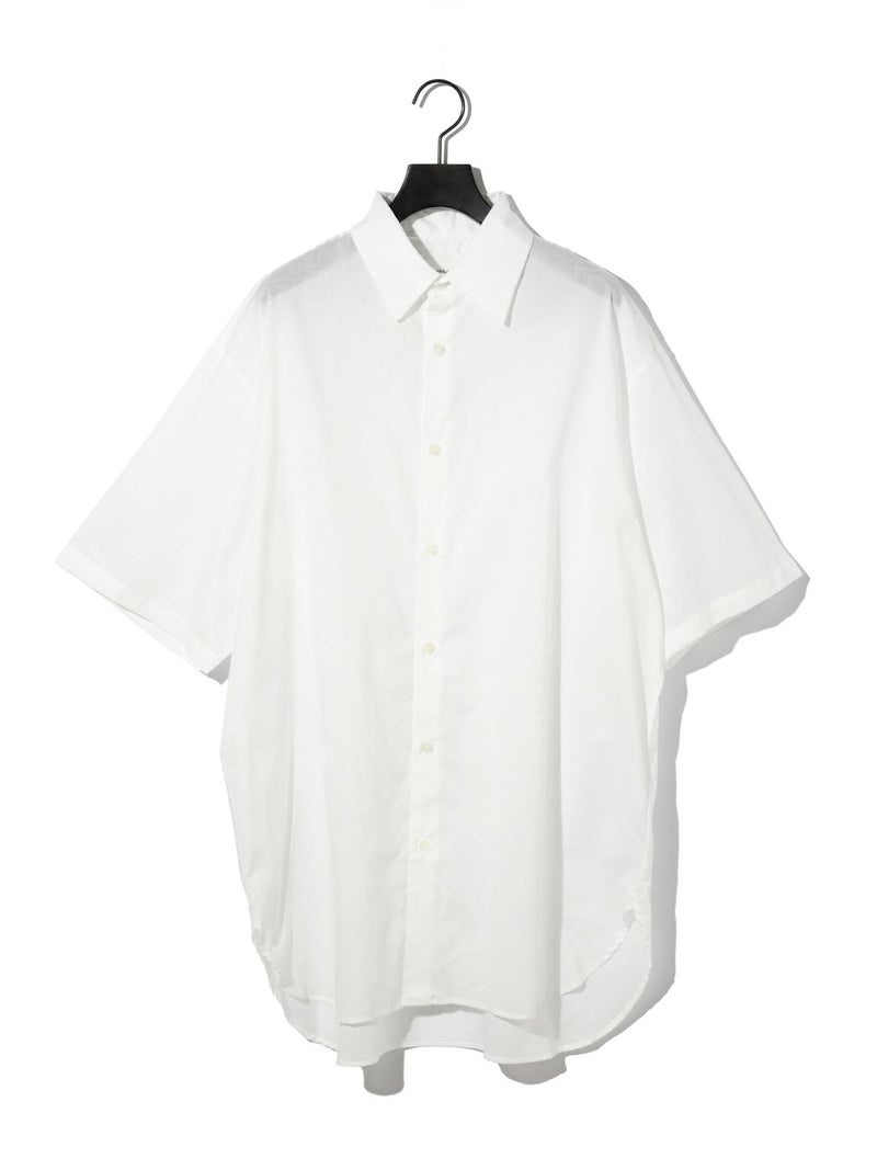 60ローンの生地を使用したハーフスリーブワイドシャツです。とても肌触りが滑らかで見た目にも上品な風合いがあります。薄地でありながら生地に適度なハリ・コシがあるのも特徴。ベーシックなワイドシャツでメンズライクな1枚です。ヒップの隠れる丈は丸みのある優しいシルエットを表現。肘の隠れる袖丈です。気軽に羽織っていただけるデザインで着回しのきくアイテムです。