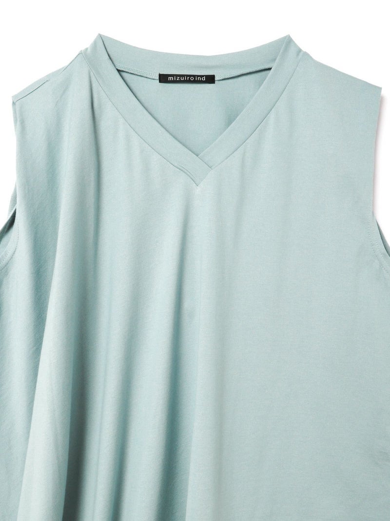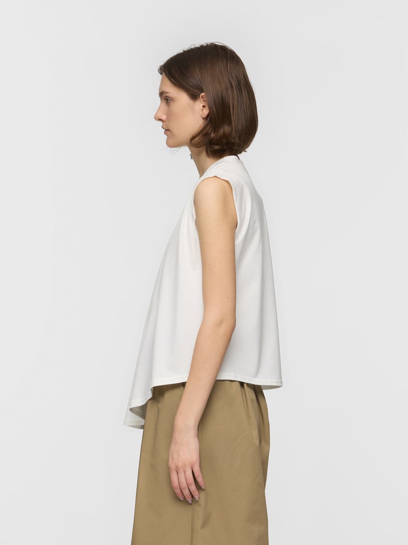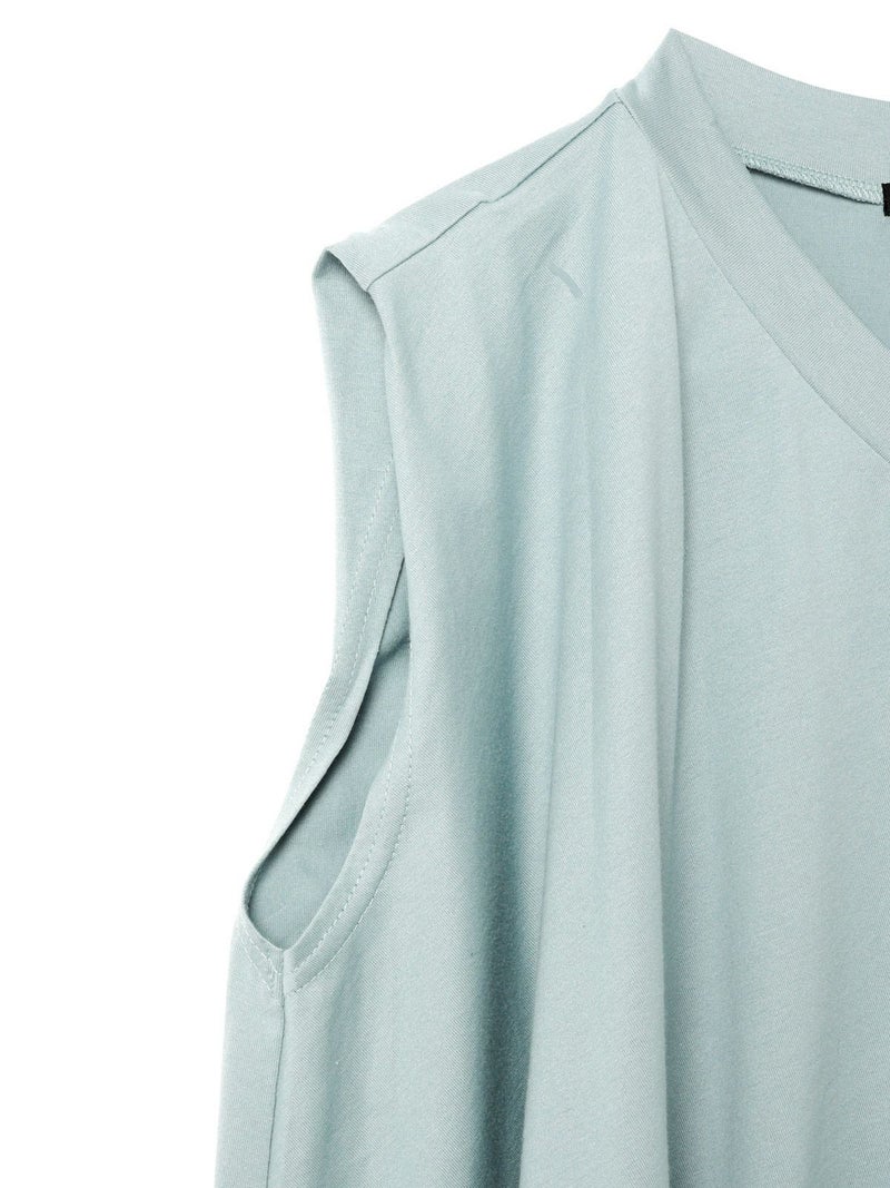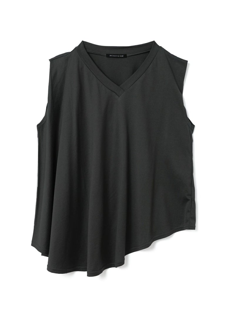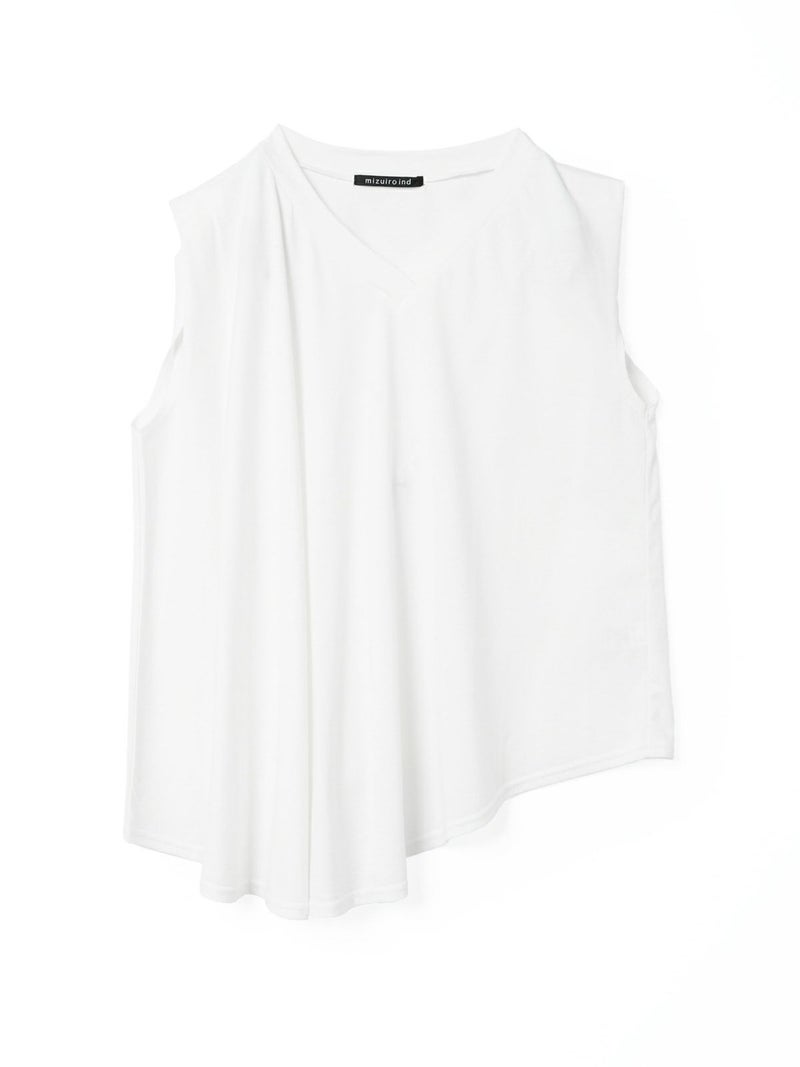 60天竺を使用したVネックアシンメトリーノースリーブプルオーバーです。透け感のないややハリのある素材が特徴。脇が見えない袖ぐりに仕上げたことで1枚での着用も可能。斜めに動きのあるシルエットは右に長いアシンメトリーのシルエットが印象的。清涼感があり爽やかで気軽に着こなせる着回しアイテムです。