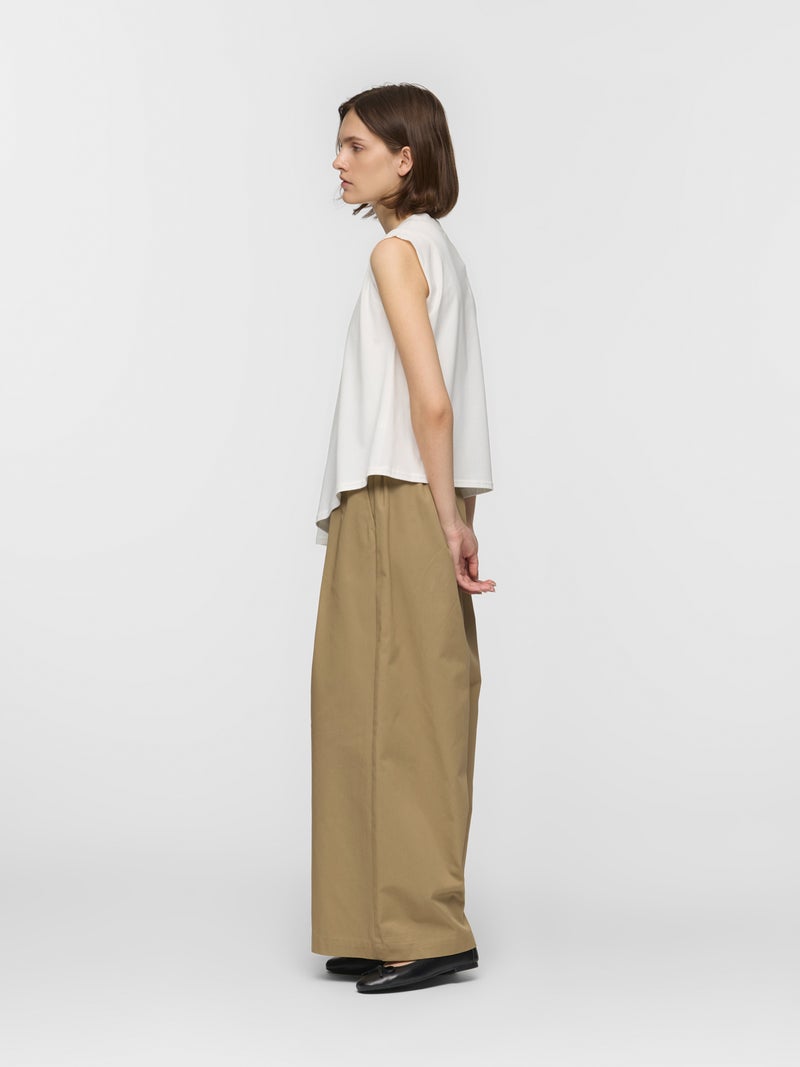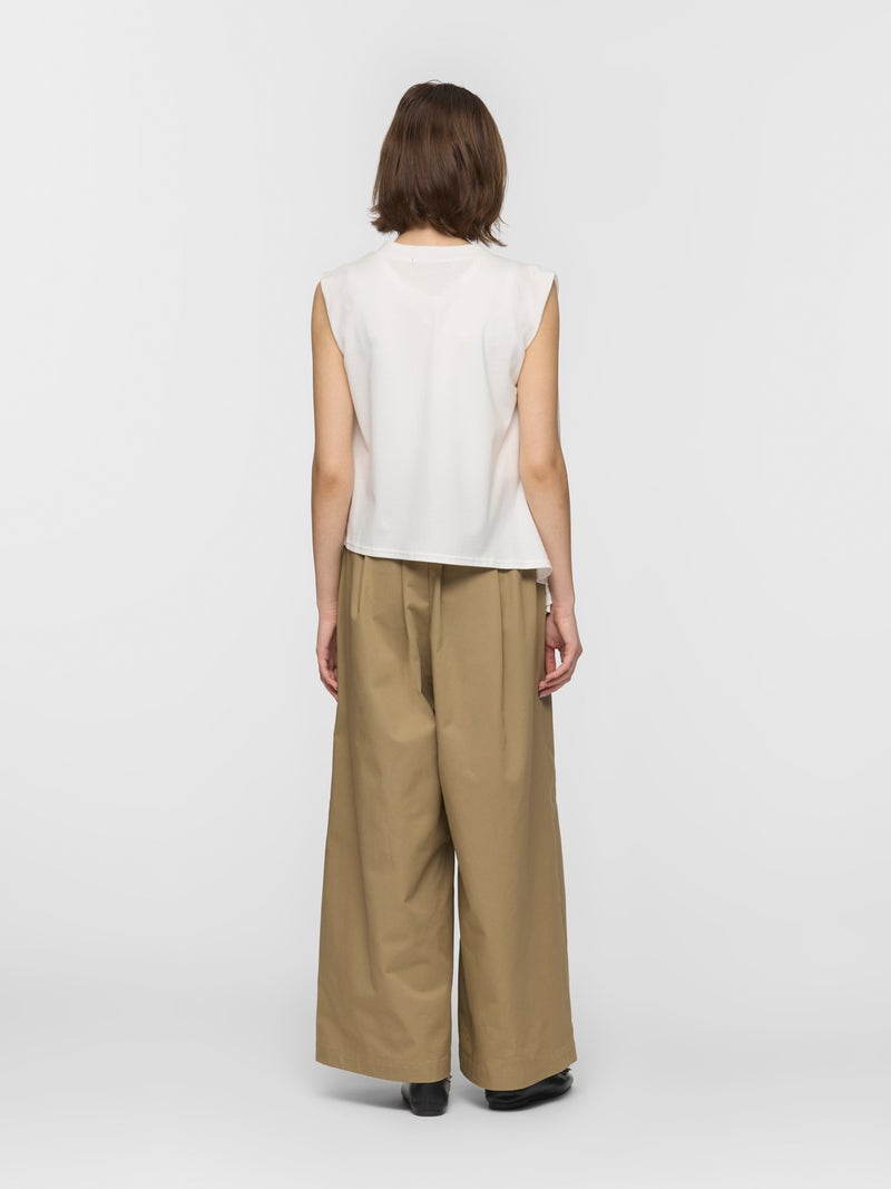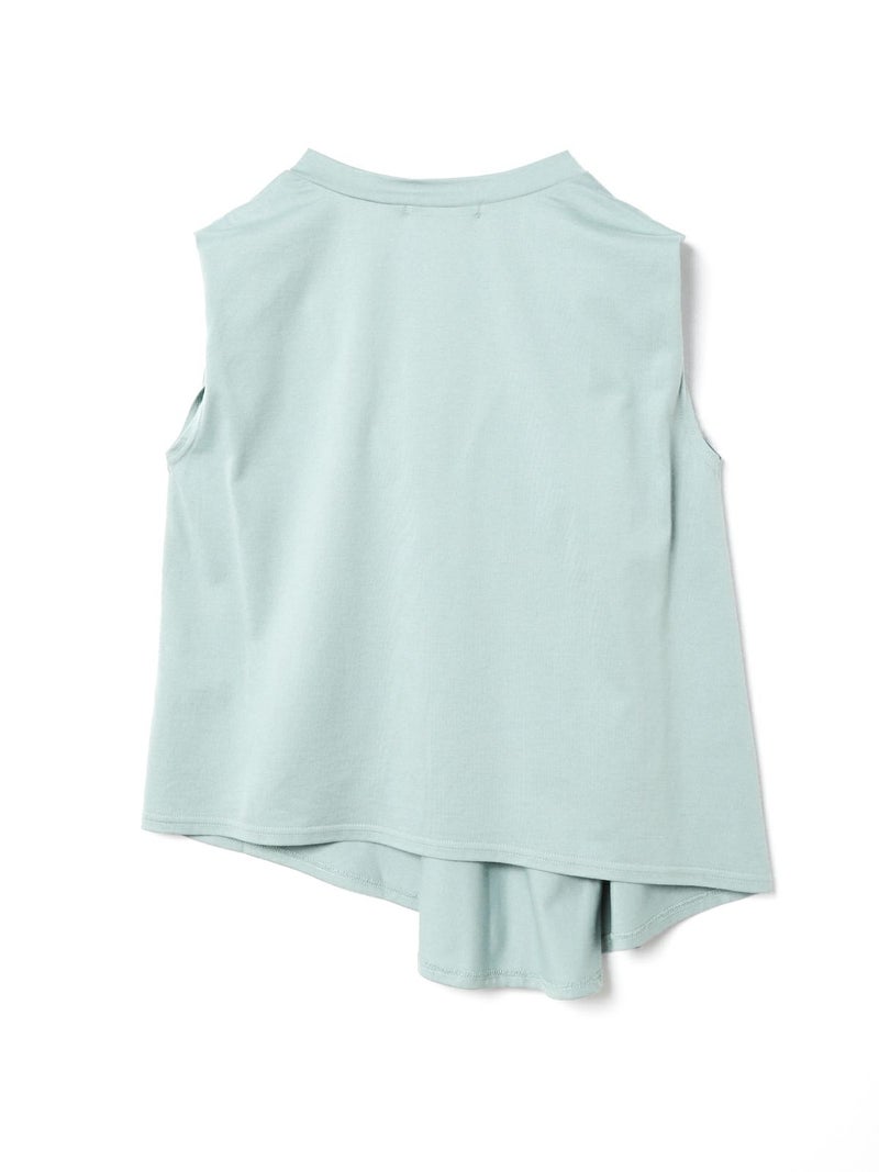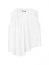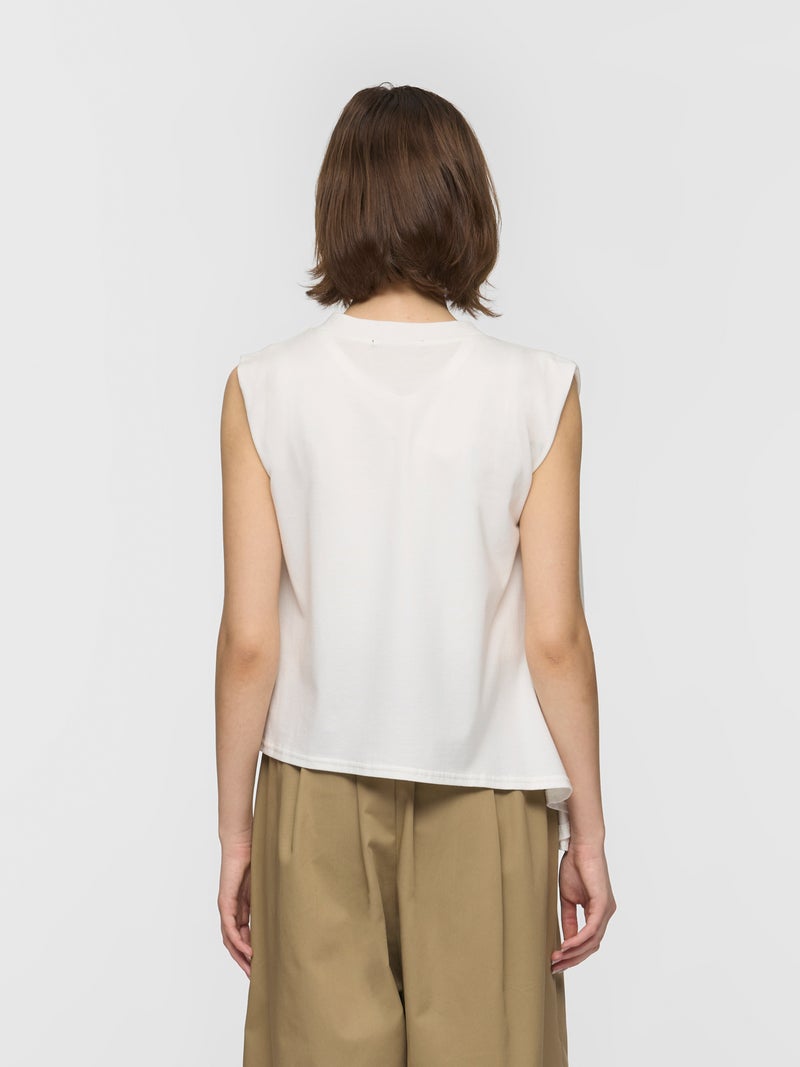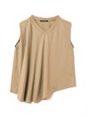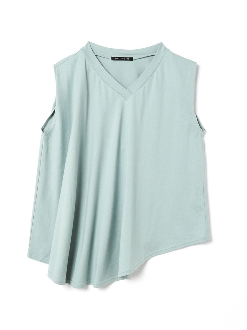 60天竺を使用したVネックアシンメトリーノースリーブプルオーバーです。透け感のないややハリのある素材が特徴。脇が見えない袖ぐりに仕上げたことで1枚での着用も可能。斜めに動きのあるシルエットは右に長いアシンメトリーのシルエットが印象的。清涼感があり爽やかで気軽に着こなせる着回しアイテムです。